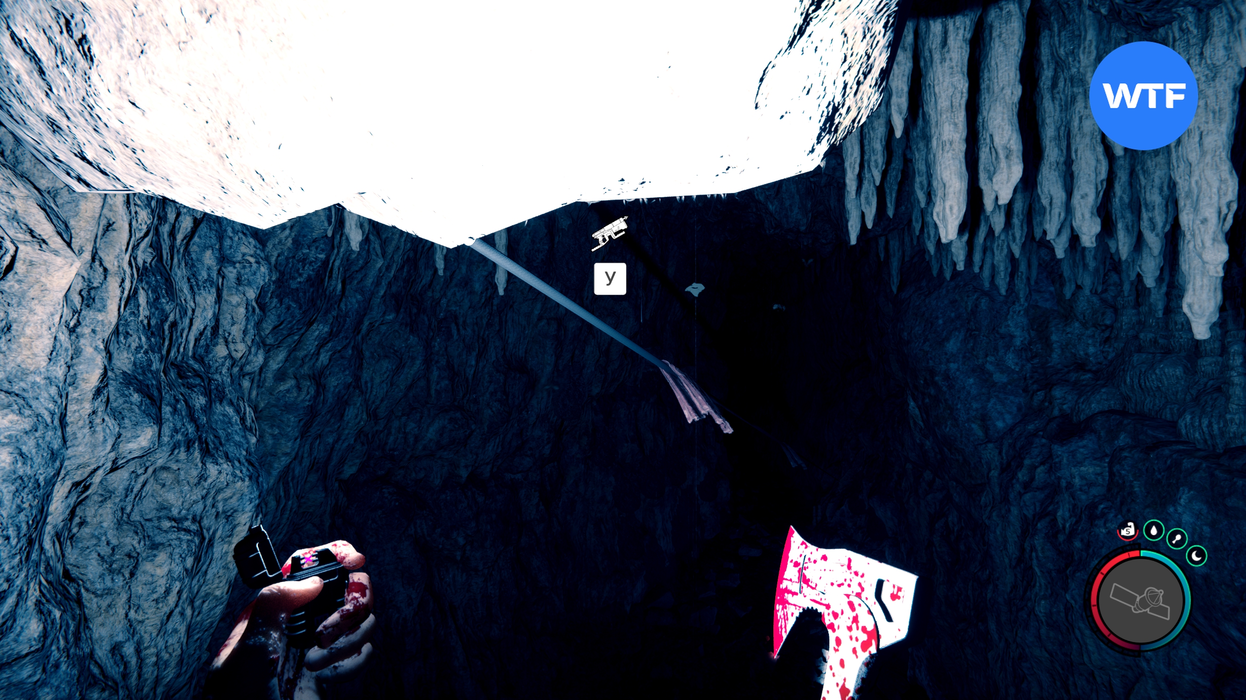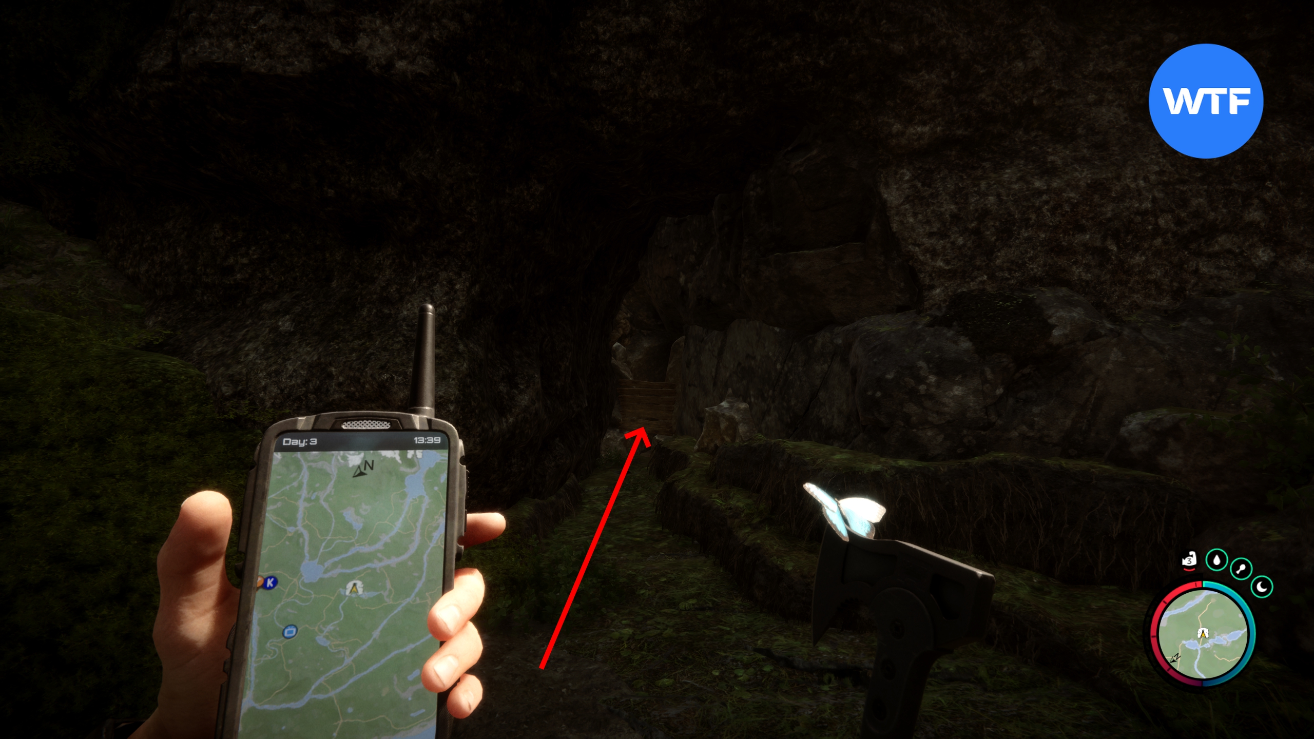 Пещера с тросометом находится в центральной части карты. Посмотрите на экран GPS-трекера ниже, чтобы сориентироваться. Во время исследования локации нам показалось, что она длиннее и сложнее предыдущей, поэтому запаситесь оружием и боеприпасами — их понадобится больше, чем при поисках акваланга.