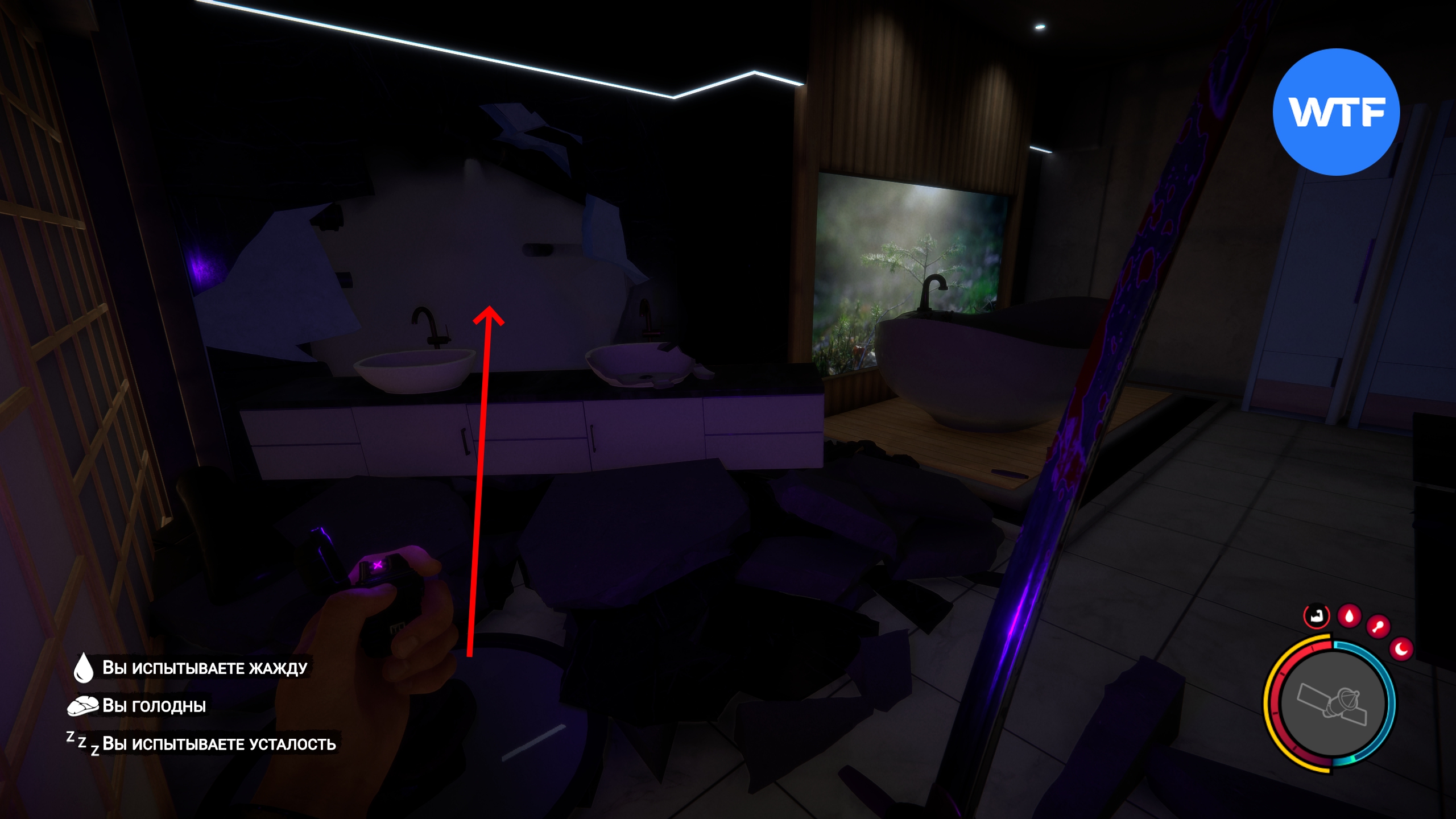 После этого спускайтесь вниз и исследуйте бункер, пока не найдете ванную с разбитой стеной, из которой выходит пар. Пробравшись через это отверстие, вы окажетесь прямо перед золотой дверью с рукой.