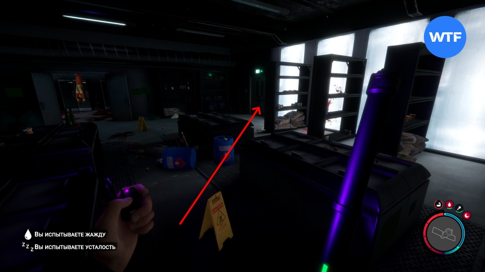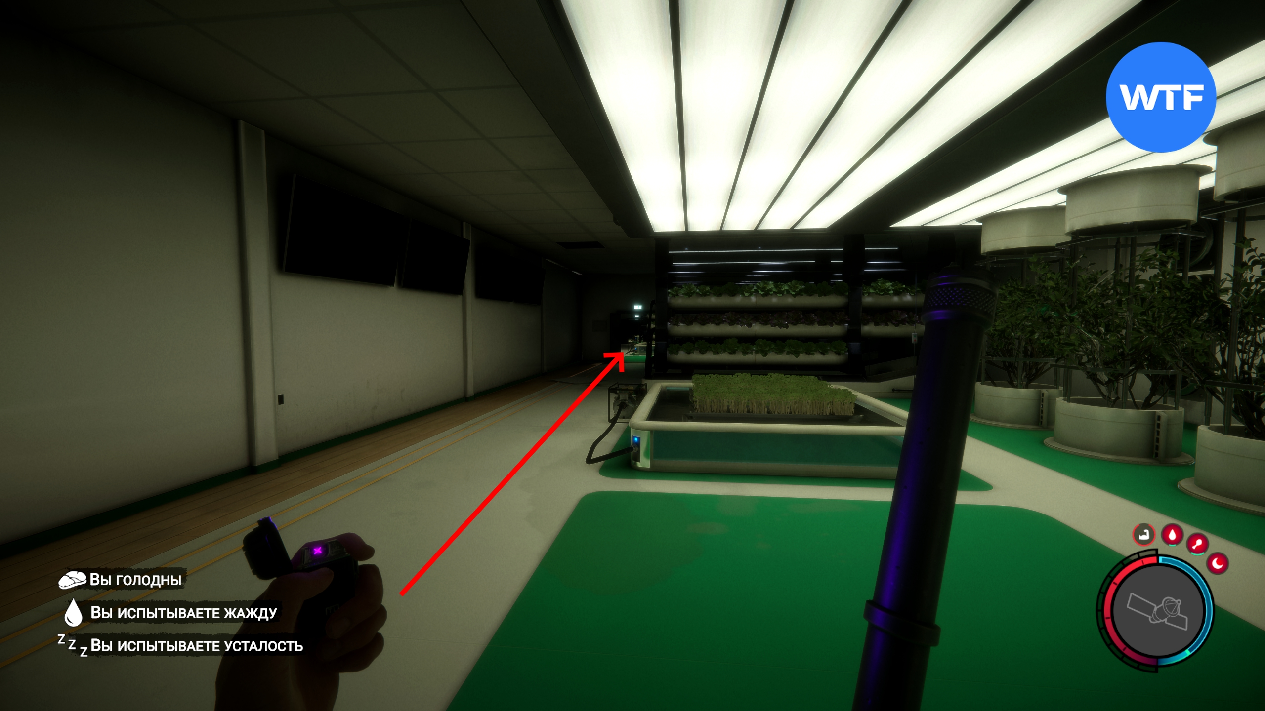 Вам нужно пройти мимо трех залов с гидропоникой и спуститься вниз в затопленную область. Продолжайте плыть вперед и пробираться мимо стеллажей, ориентируясь на светящиеся указатели над дверями.