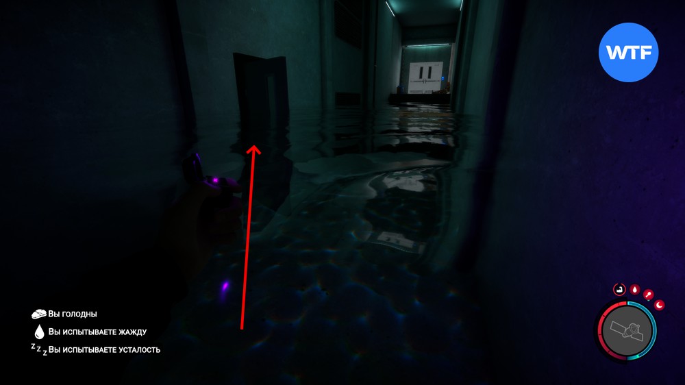 В итоге вы окажетесь в коридоре, в конце которого будет светиться еще одна дверь, запертая на ключ-карту. Вместо того чтобы идти туда, плывите в дверь слева.