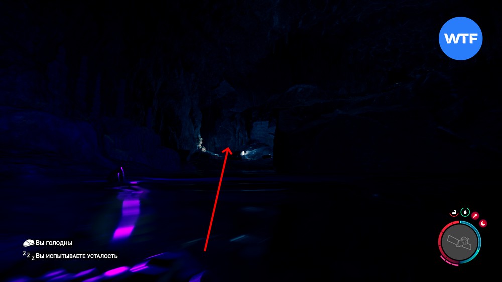 С помощью тросомета съезжайте вниз по веревке, а затем используйте акваланг: так вы сможете попасть в скрытую часть пещеры. Выбравшись из воды, идите вперед по единственно возможному пути, пролезайте в щель среди камней и съезжайте вниз по склону.