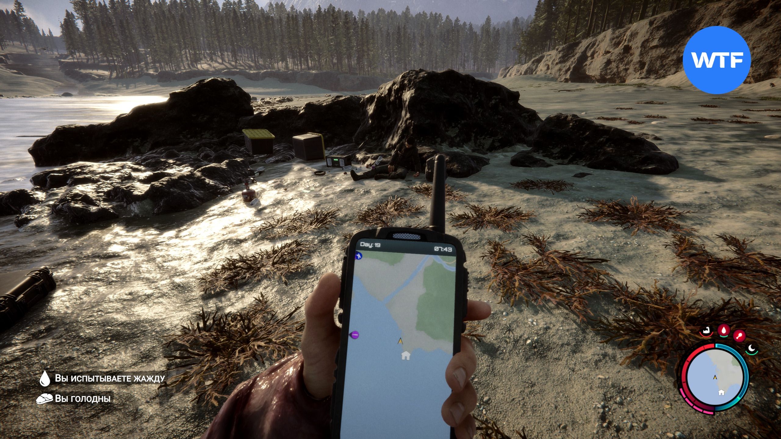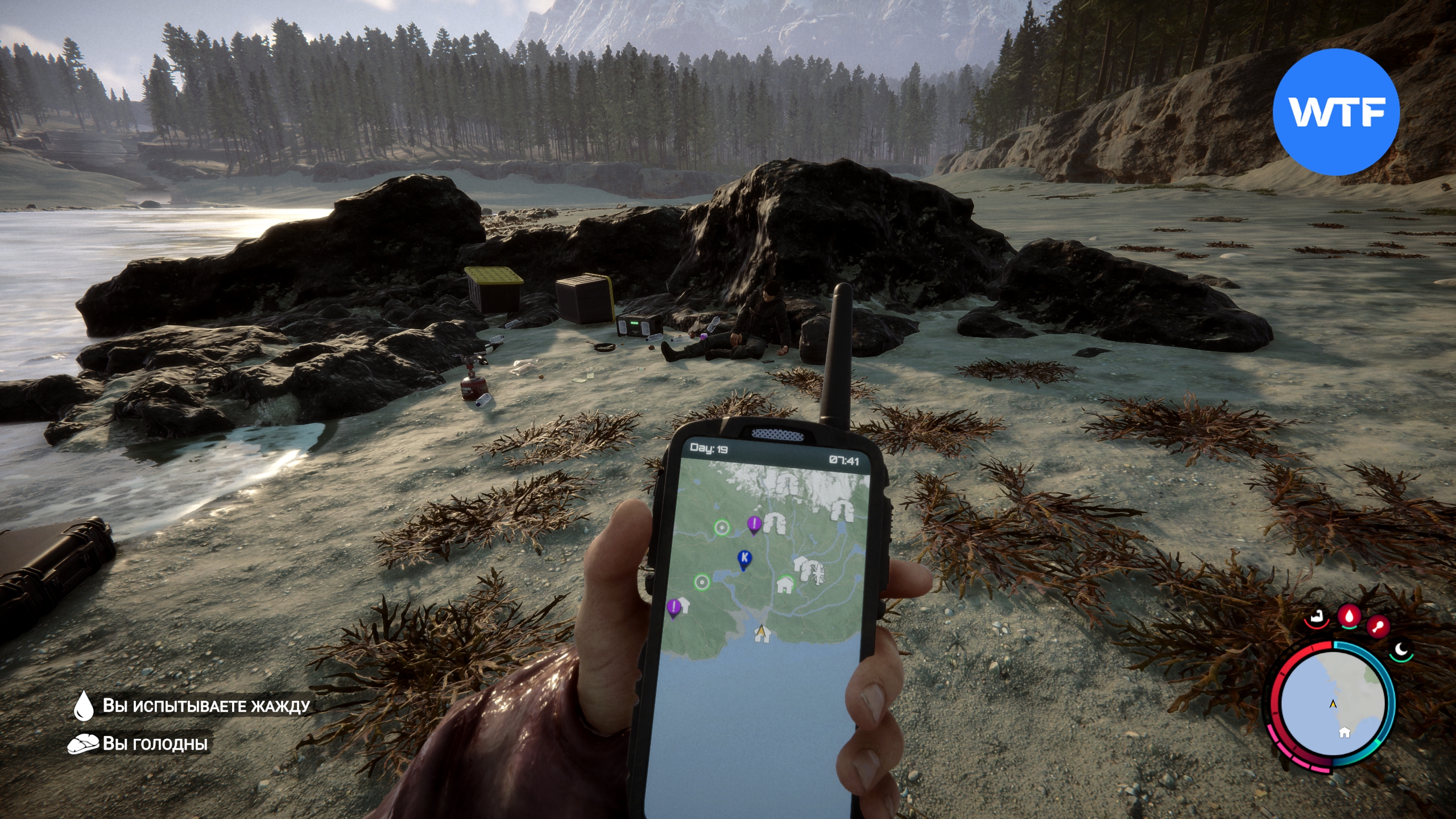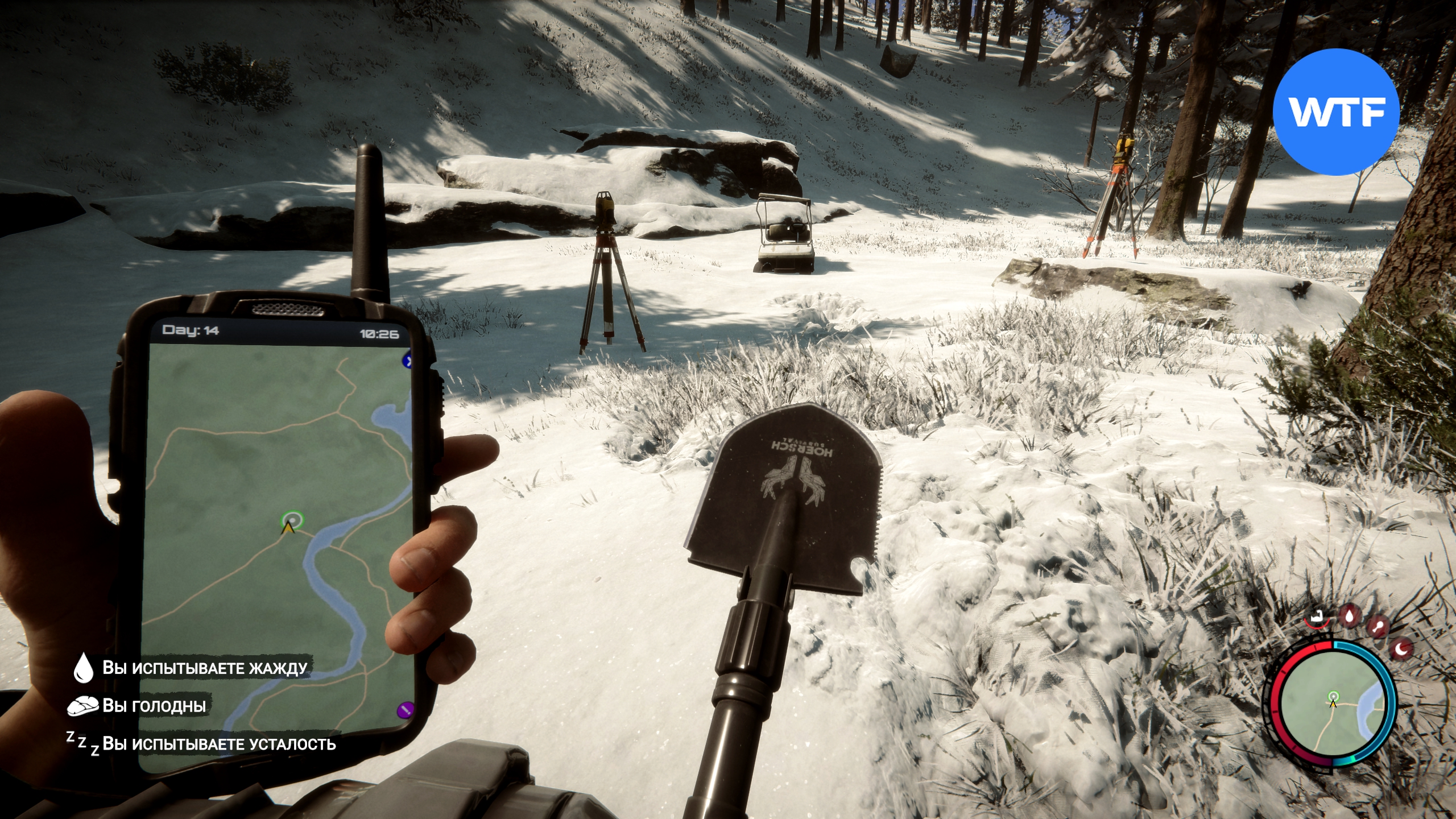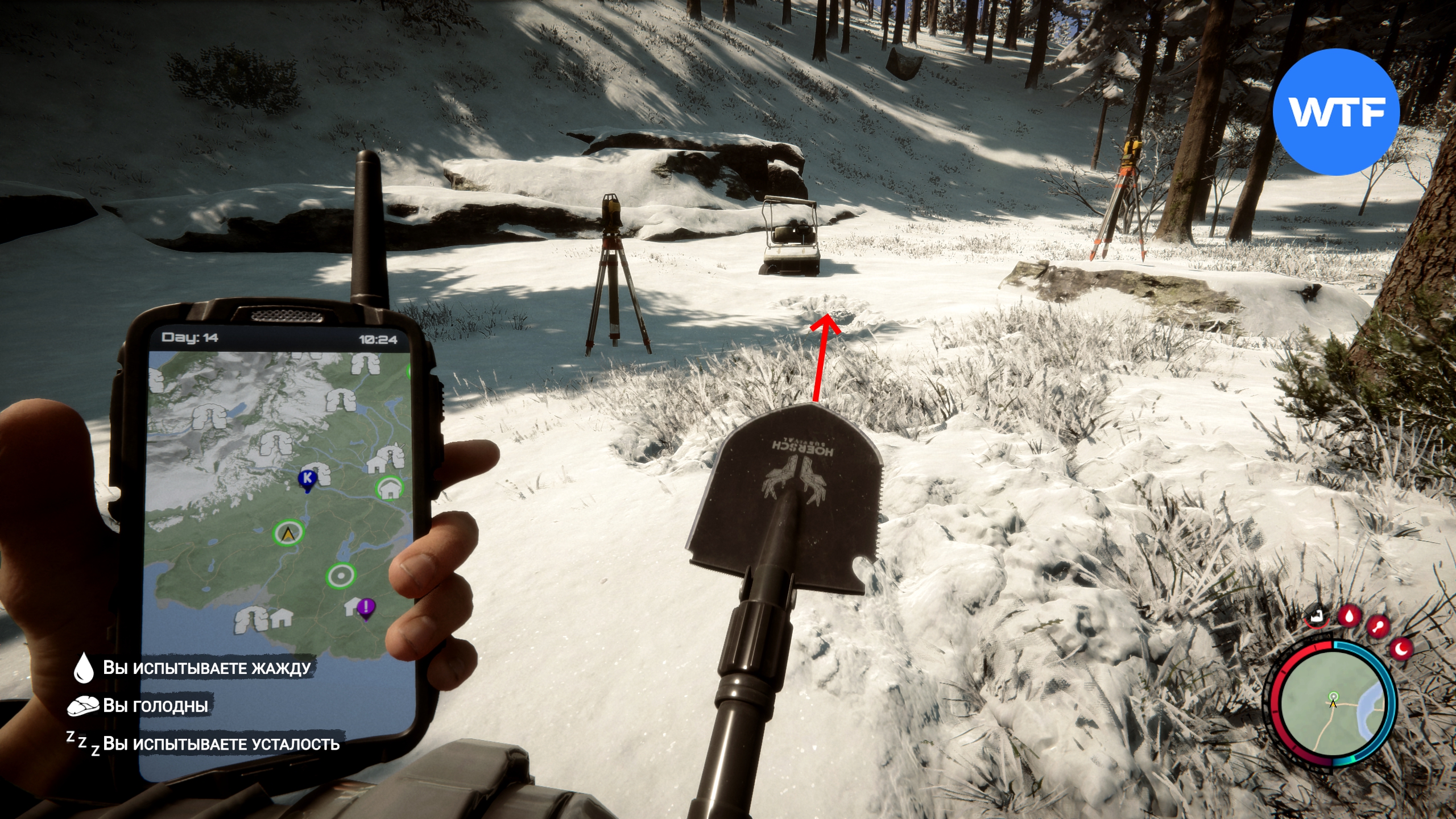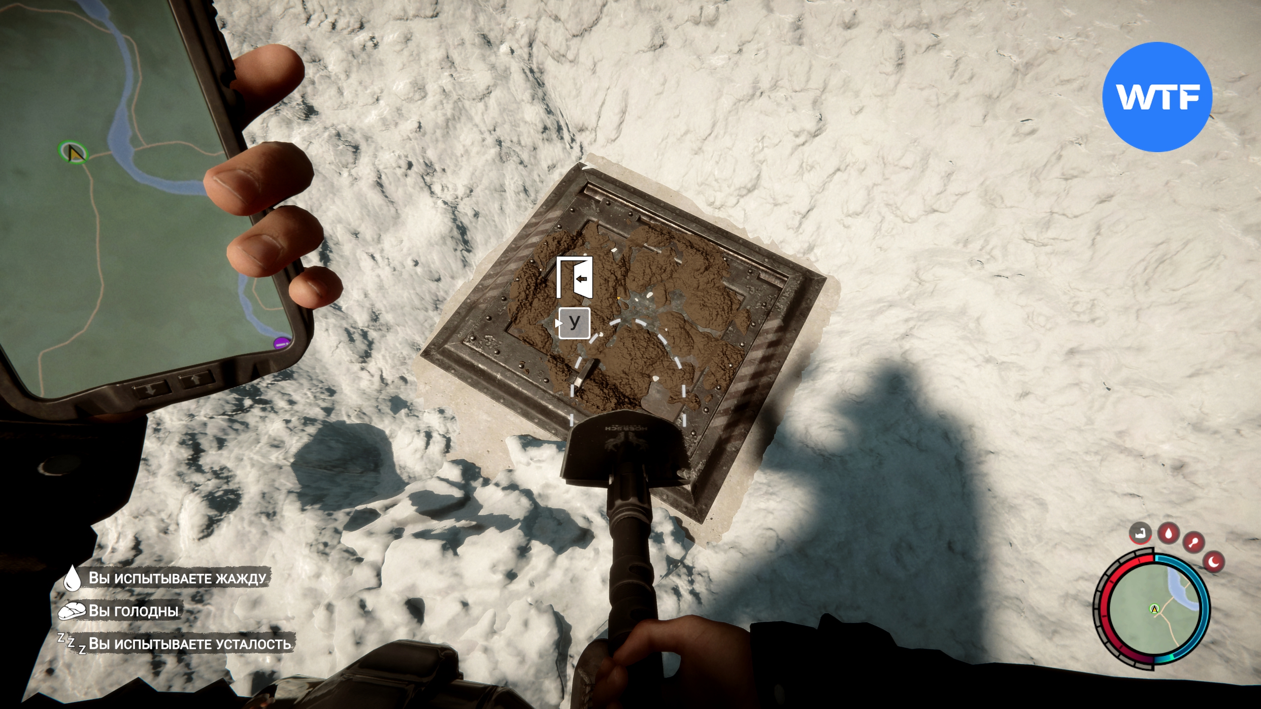 После того, как лопата окажется у вас, отправляйтесь к месту, отмеченному на GPS-навигаторе ниже. Здесь нужно раскопать люк, ориентируясь на метку зеленого маячка на вашей карте.