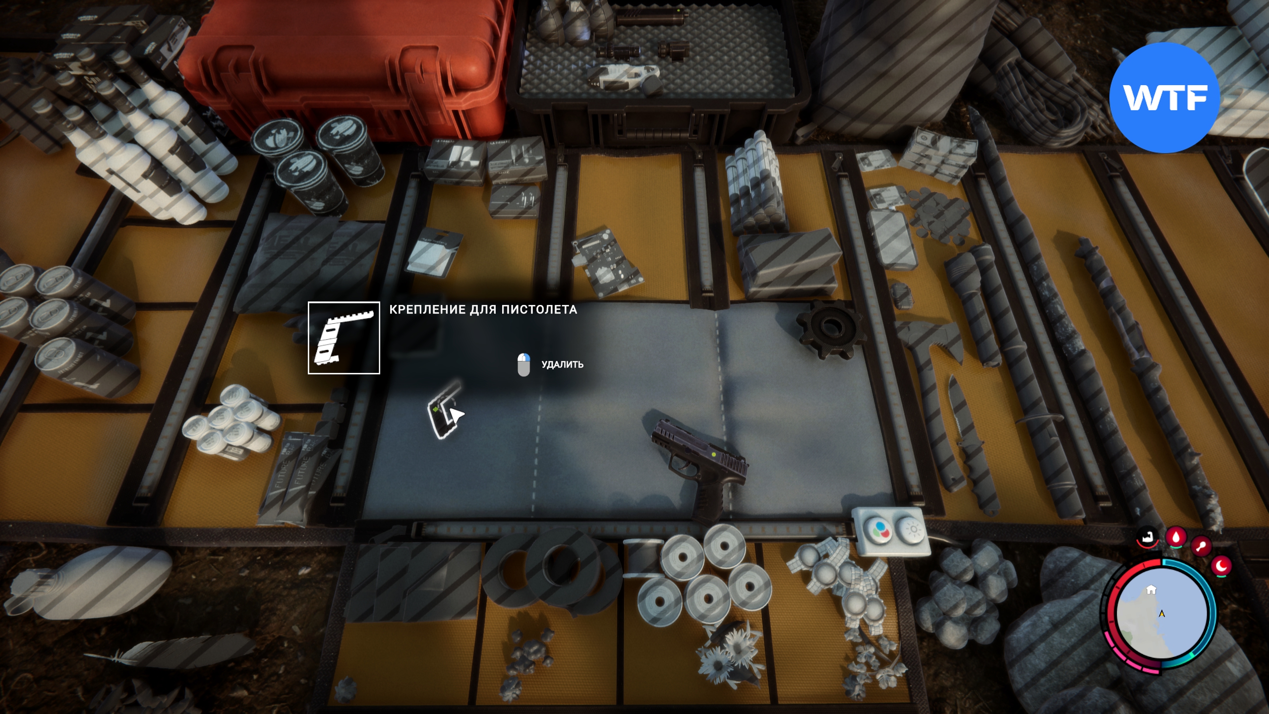 Чтобы присоединить прицел к пистолету, вам понадобится крепление для пистолета, которое мы получили в одном из предыдущих шагов. Найдите все предметы в верхнем ящике своего инвентаря и нажмите на них правой кнопкой мыши, чтобы переложить в центр. После этого вы сможете нажать на шестеренку для их объединения.