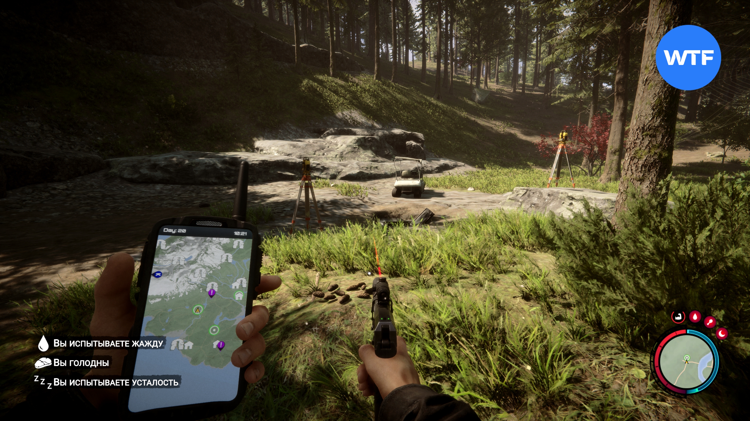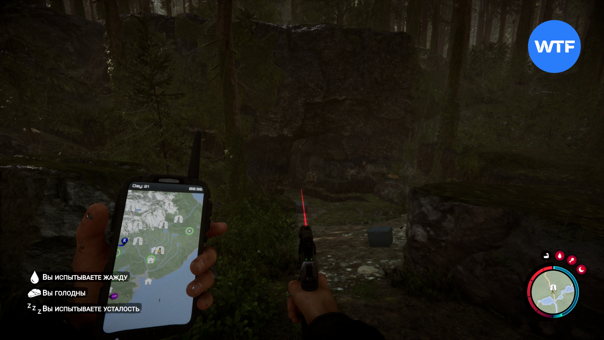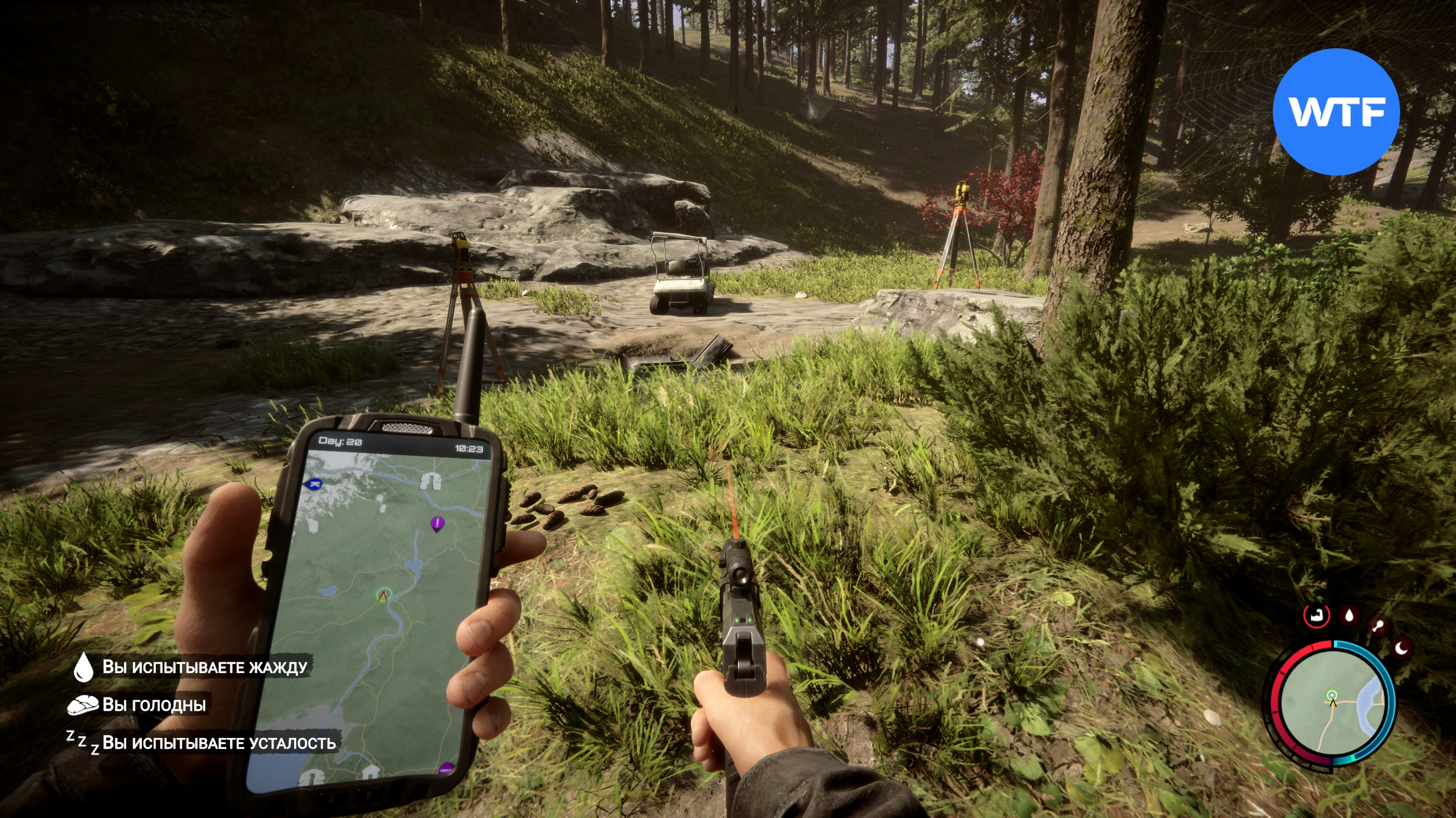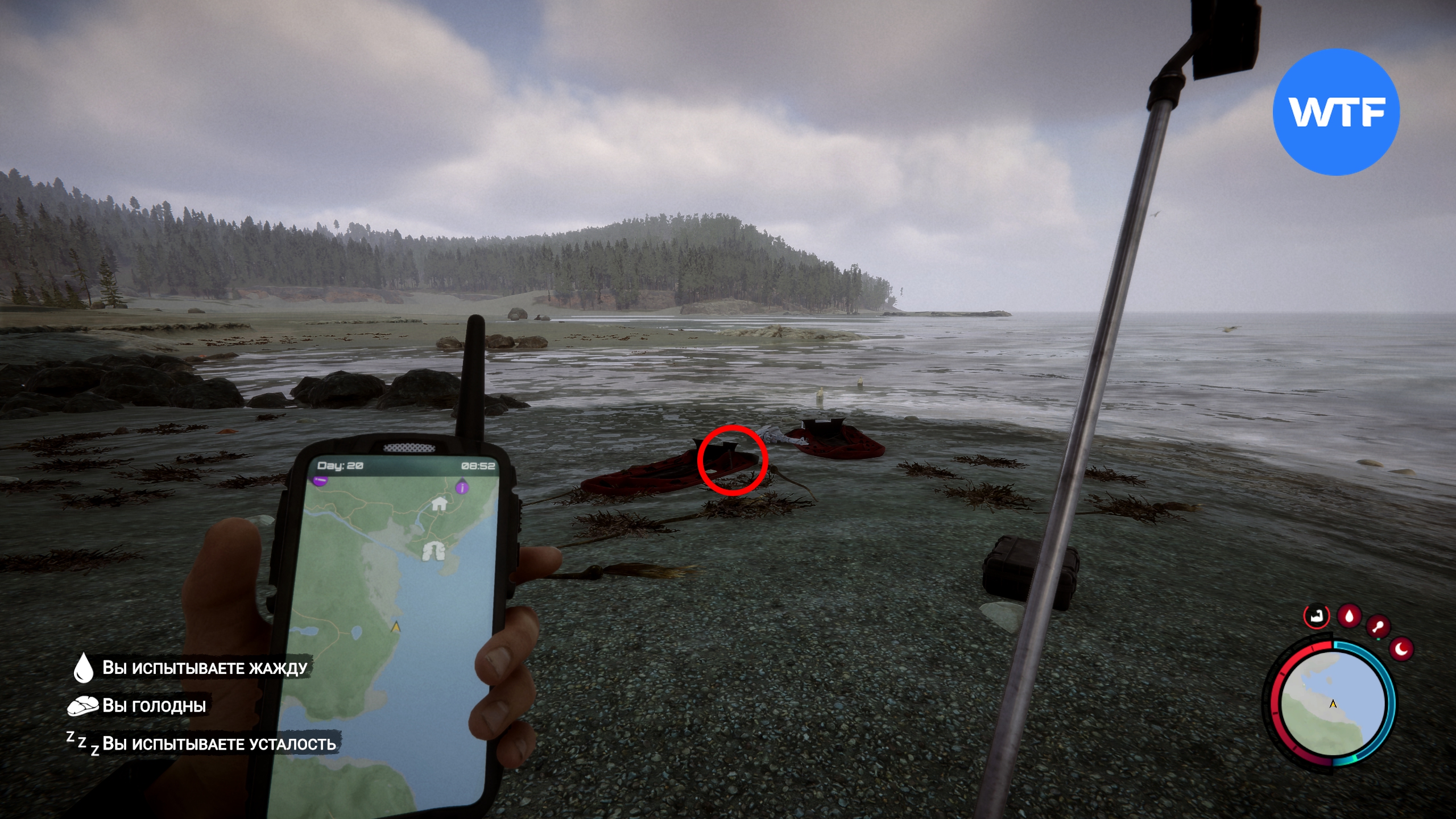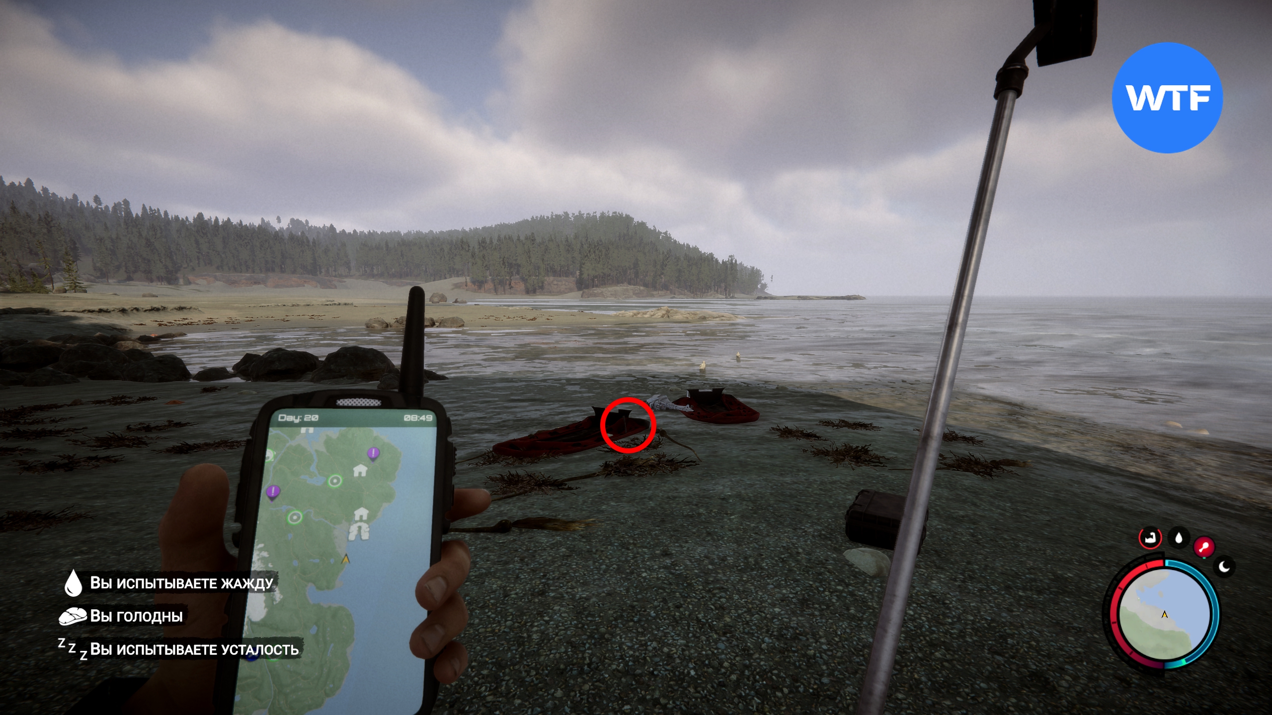 В Sons Of The Forest есть два места, где вы сможете найти пистолет. Первое место — это надувной плот, дрейфующий недалеко от берега. Ориентируйтесь на отметку восклицательного знака с навигатора ниже. Подробнее об этом оружии, а также обо всех дополнениях для него мы писали в отдельном гайде.