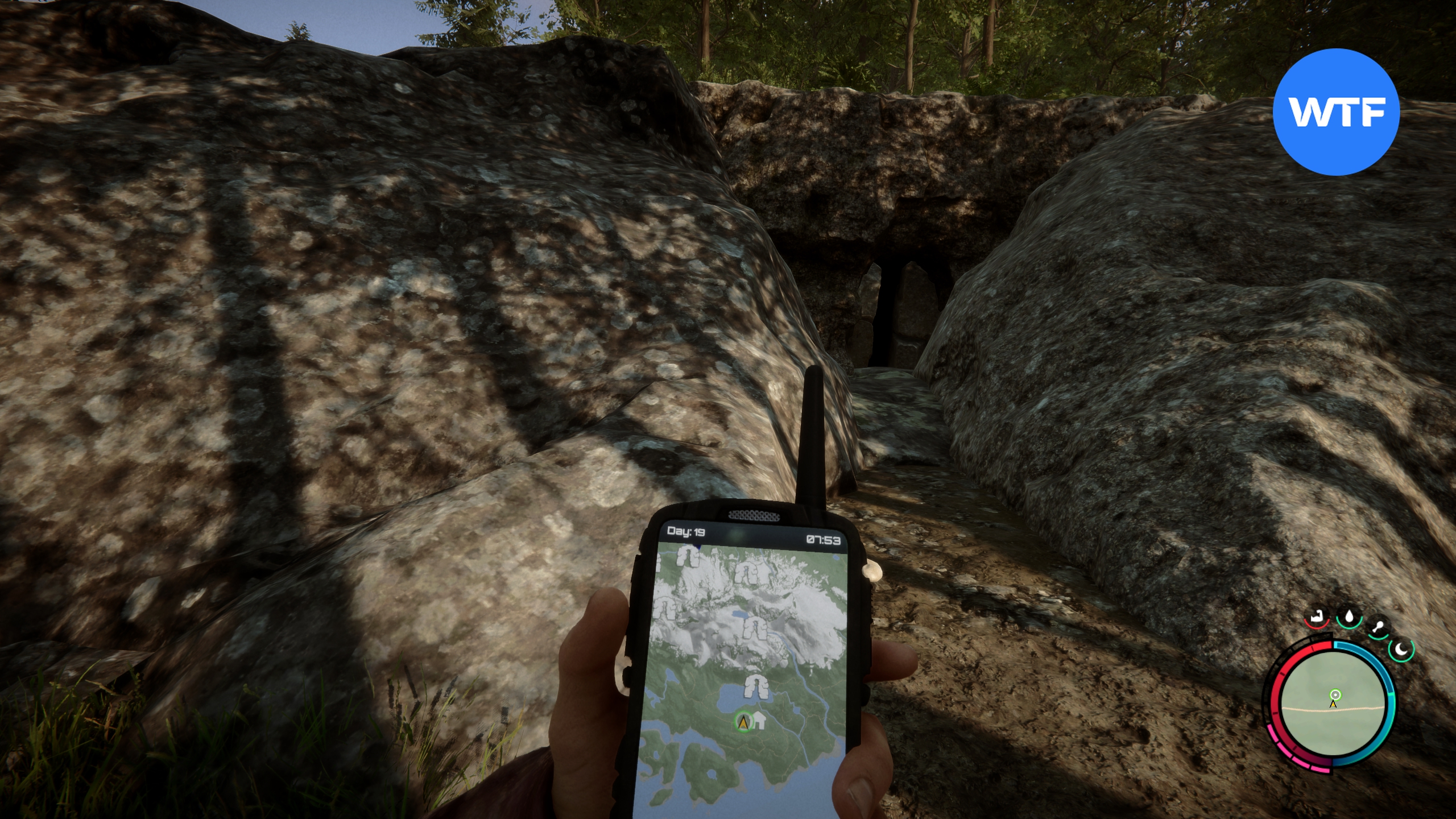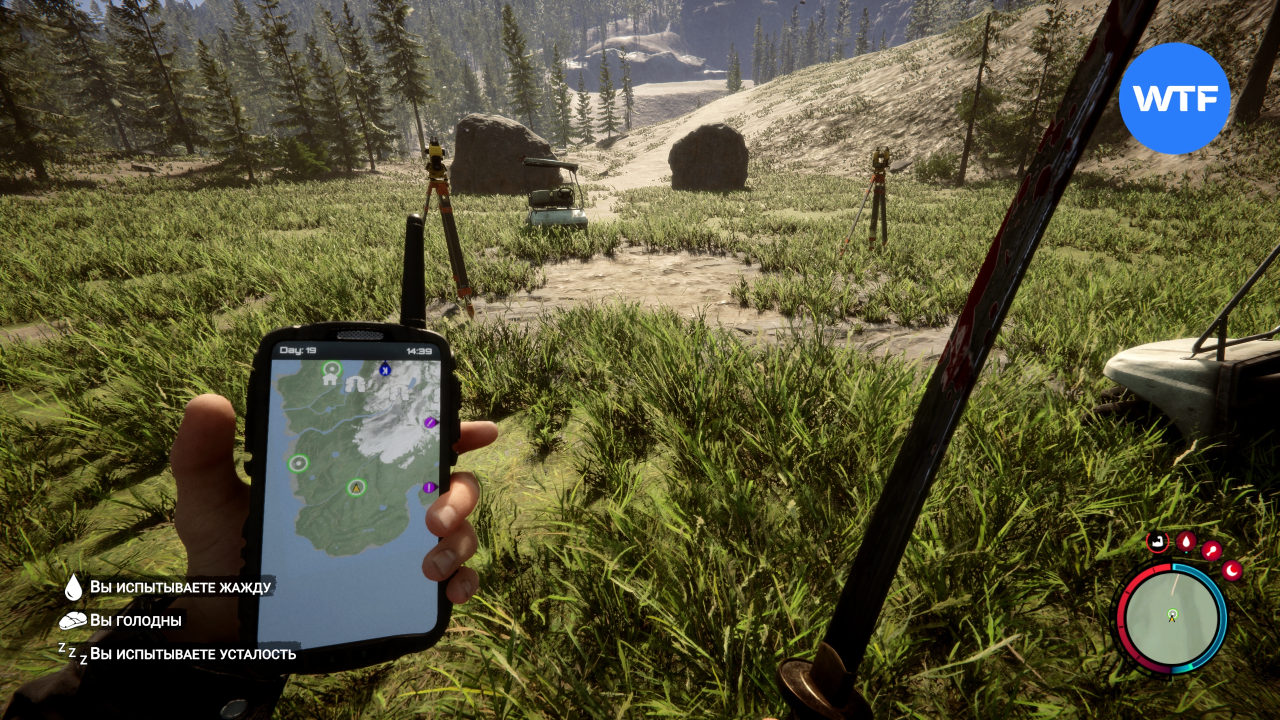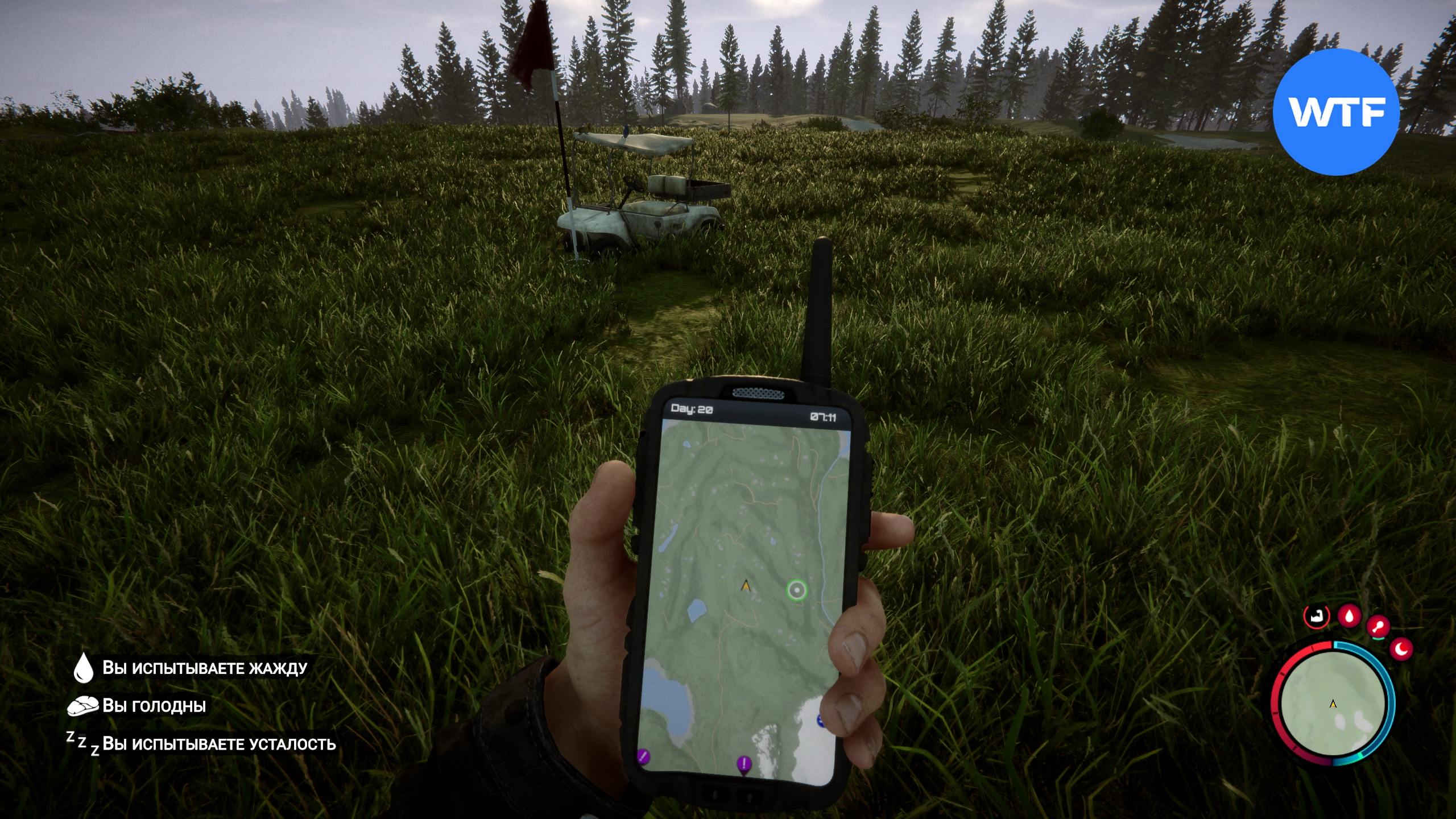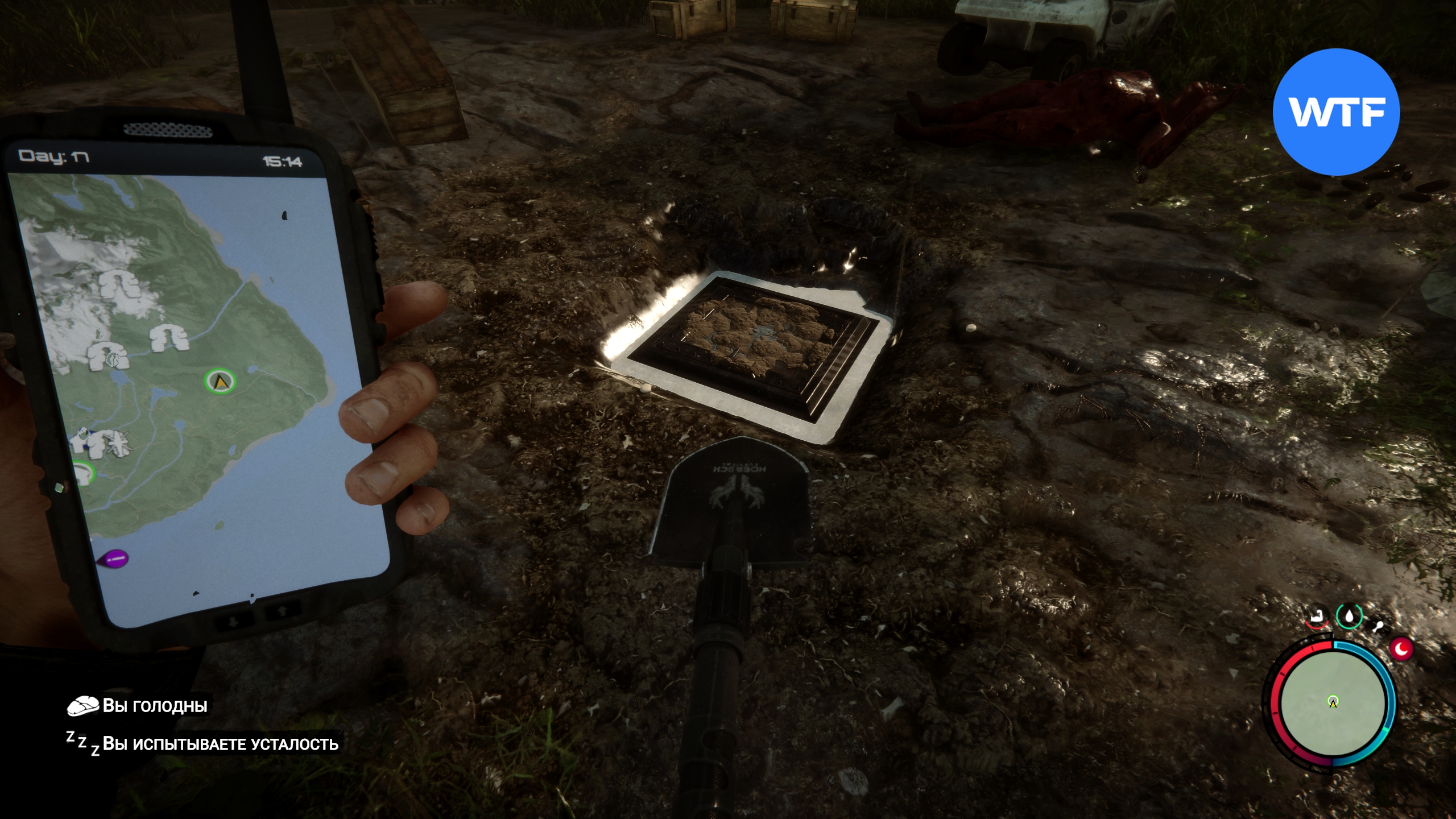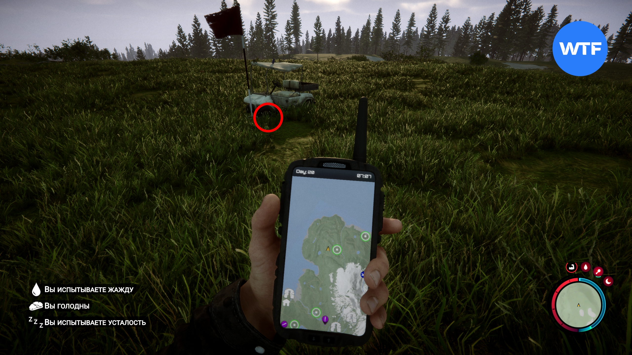 В Sons Of The Forest есть два места, где вы сможете найти пистолет. Первое место — это надувной плот, дрейфующий недалеко от берега. Ориентируйтесь на отметку восклицательного знака с навигатора ниже. Подробнее об этом оружии, а также обо всех дополнениях для него мы писали в отдельном гайде.