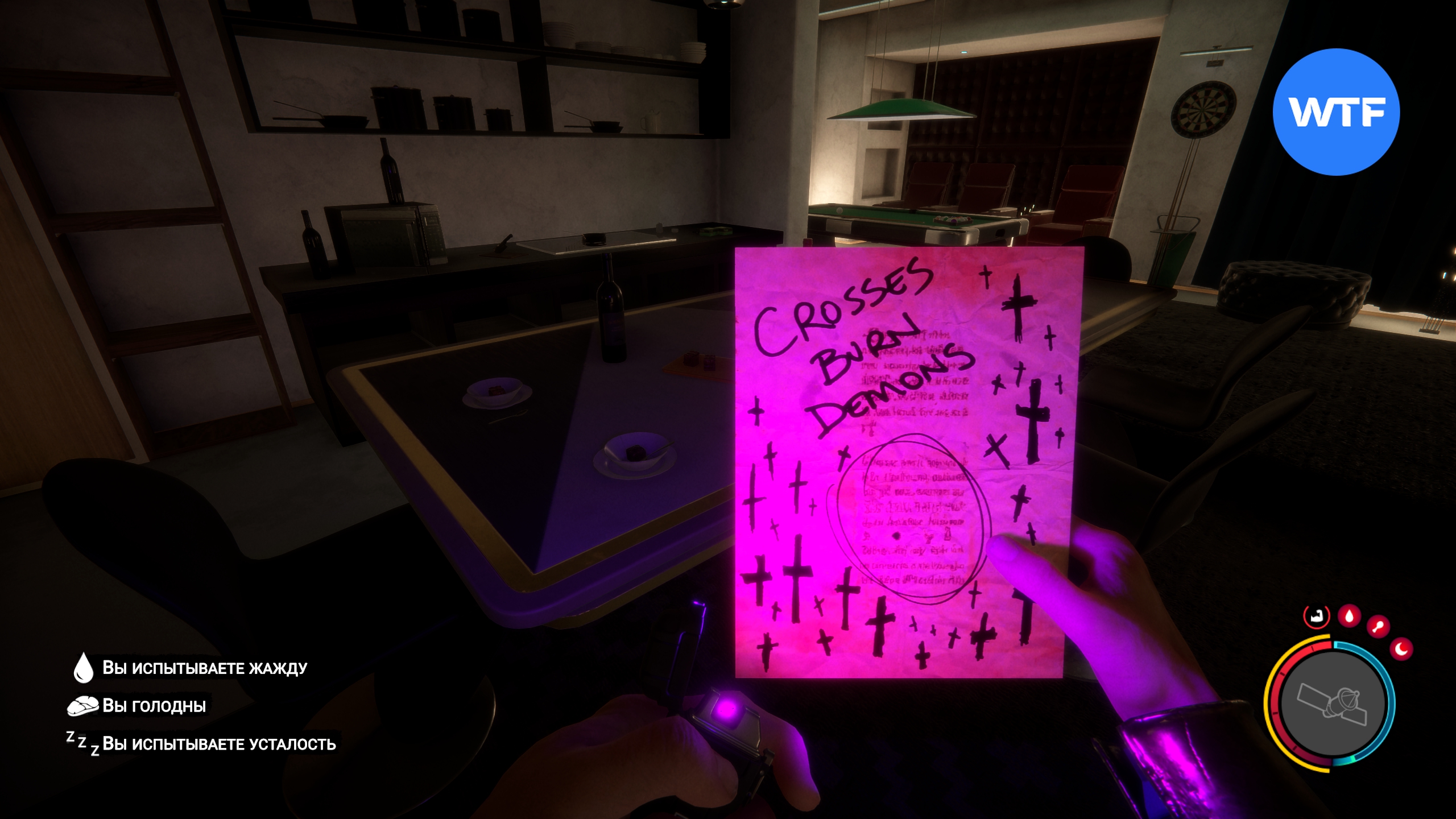 В этой же комнате вы найдете записку, в которой написано, что крест поджигает демонов. Мы проверили — и в самом деле поджигает.