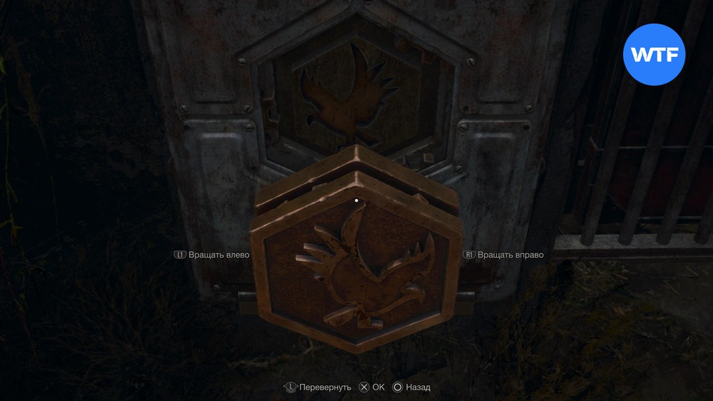 Вам нужно повернуть рисунок птицы так, как показано на скриншоте ниже, а затем вращать эмблему вправо. Таким образом, рисунок в углублении и на печати совпадут и ворота откроются.