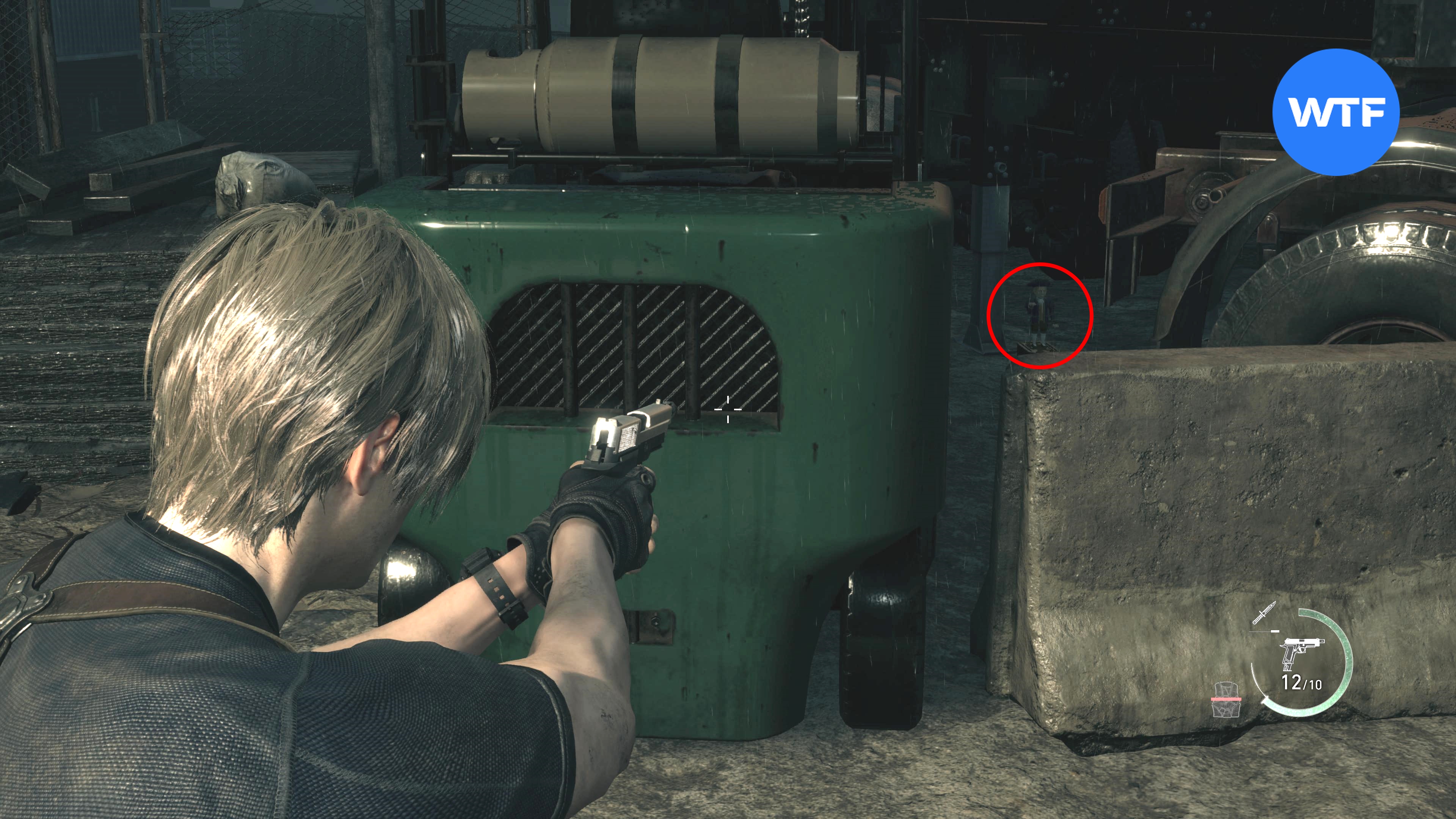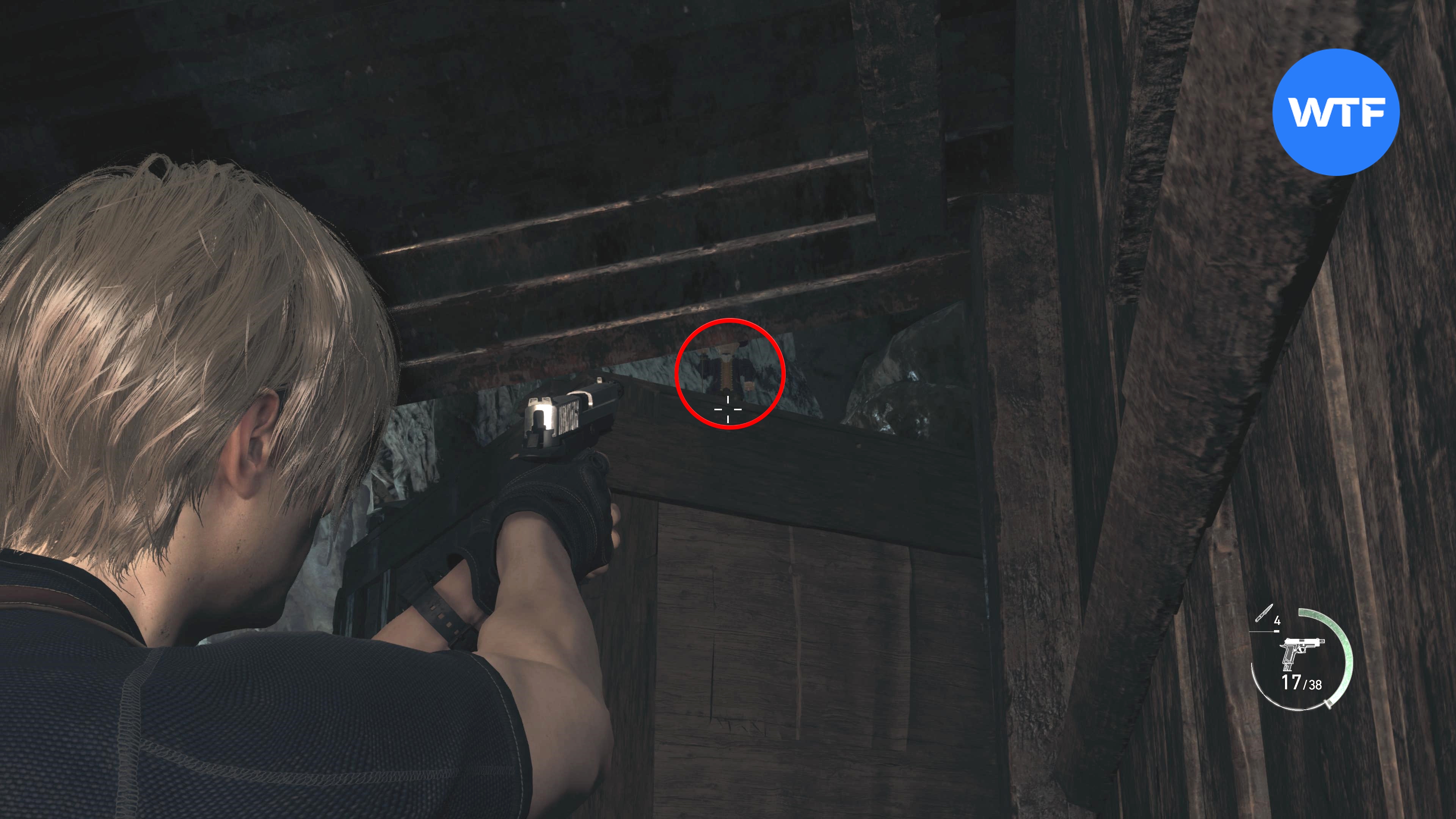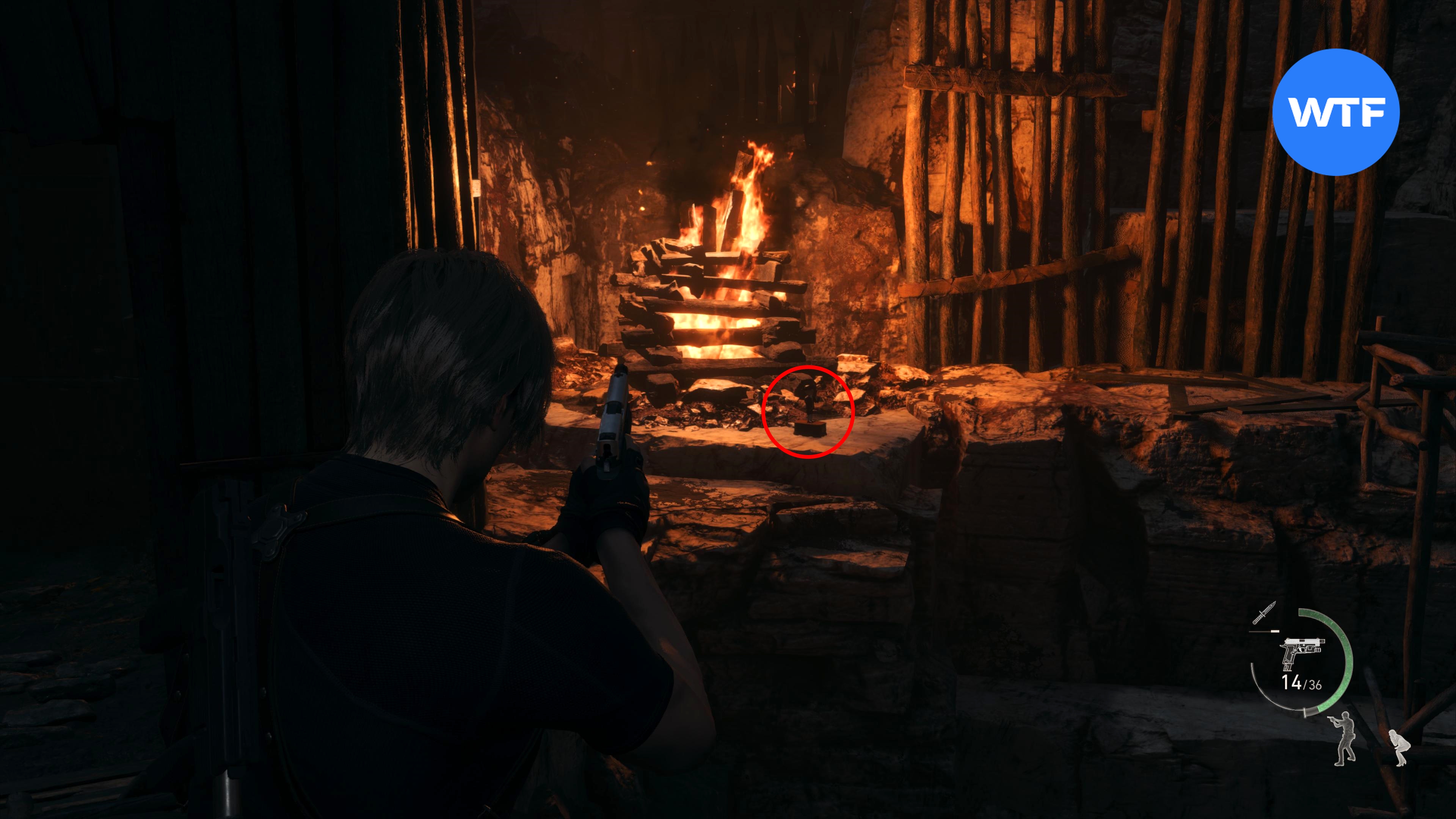 После побега с виллы доберитесь комнаты с торговцем и продолжайте идти вперед по линейному пути, пока не окажетесь в точке, отмеченной на карте ниже. Прежде чем проходить через ворота, посмотрите направо и выстрелите в фигурку заводного смотрителя, стоящего у большого костра (см. скриншот 2).