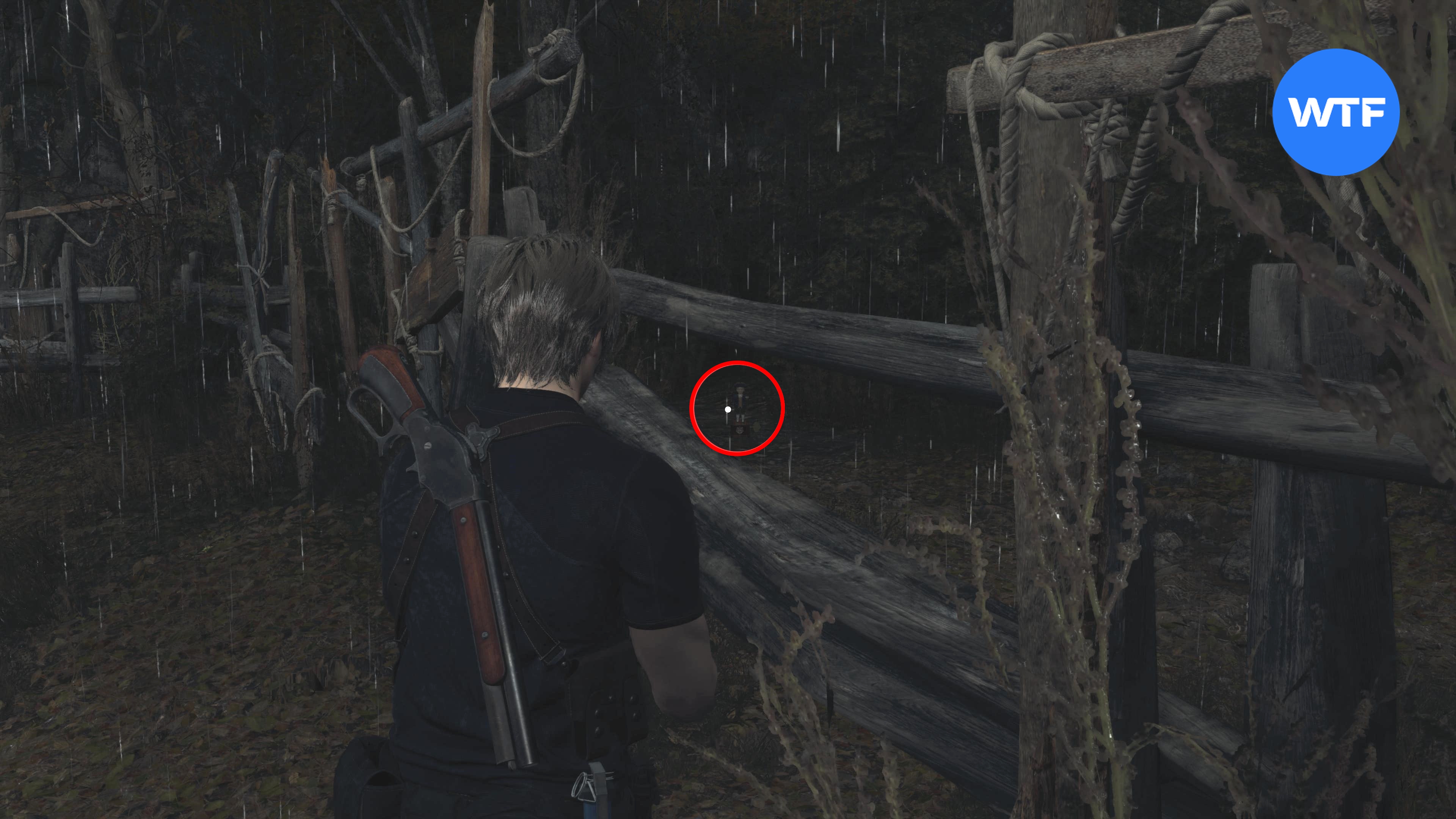 Пройдите через пещеру до самого конца, а затем зайдите в комнату справа. Поднимитесь по лестнице наверх, к алтарю в лесу. Встаньте на место, показанное на скриншоте ниже и посмотрите через доски забора (см. скриншот 2). Из-за темноты и дождя эту куклу будет достаточно трудно заметить.