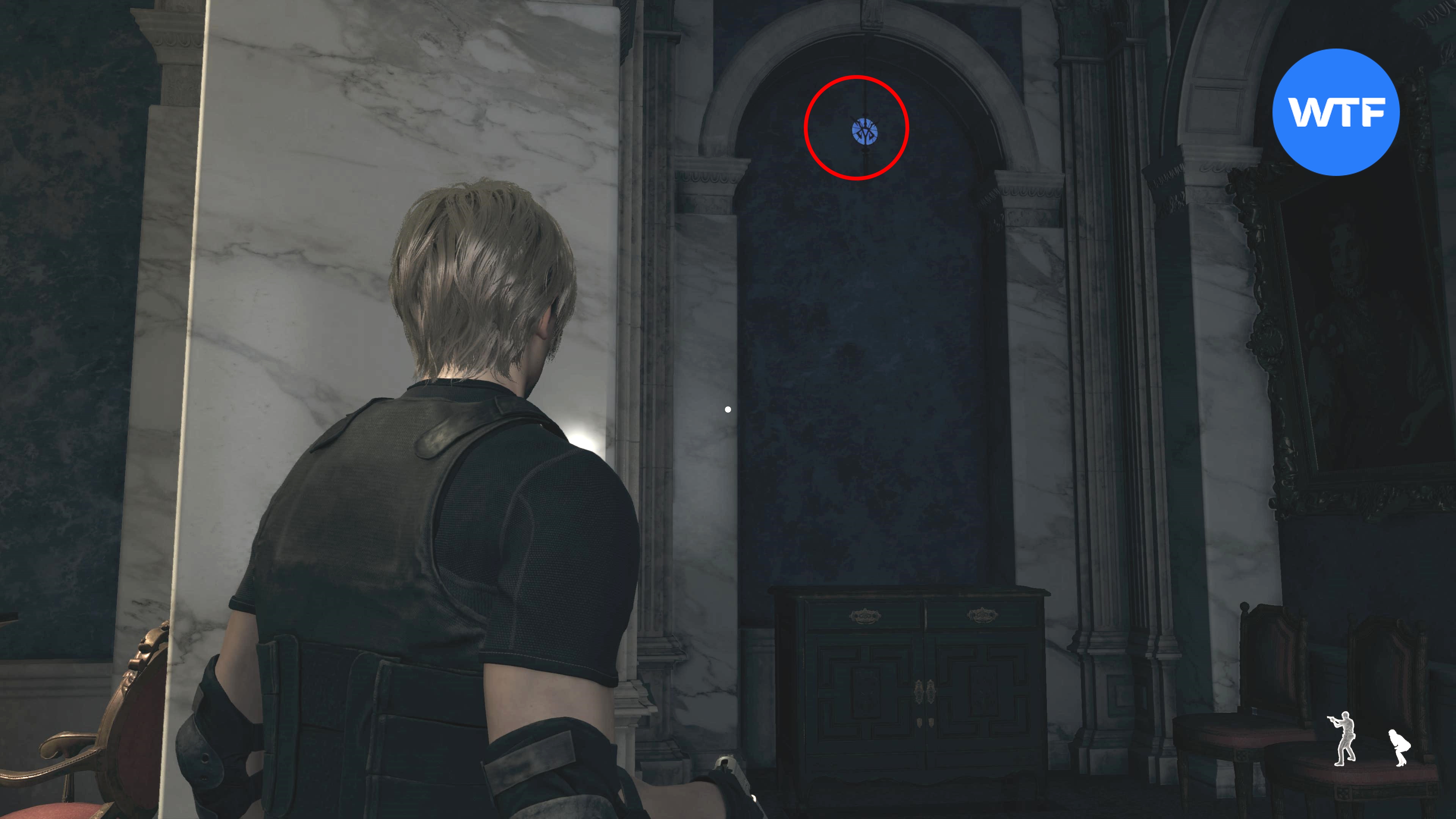 На втором этаже главного зала пройдите через дверь на северо-западе и идите в оружейную. Прежде чем прыгать вниз, стреляйте в этот медальон внутри каменной ниши.