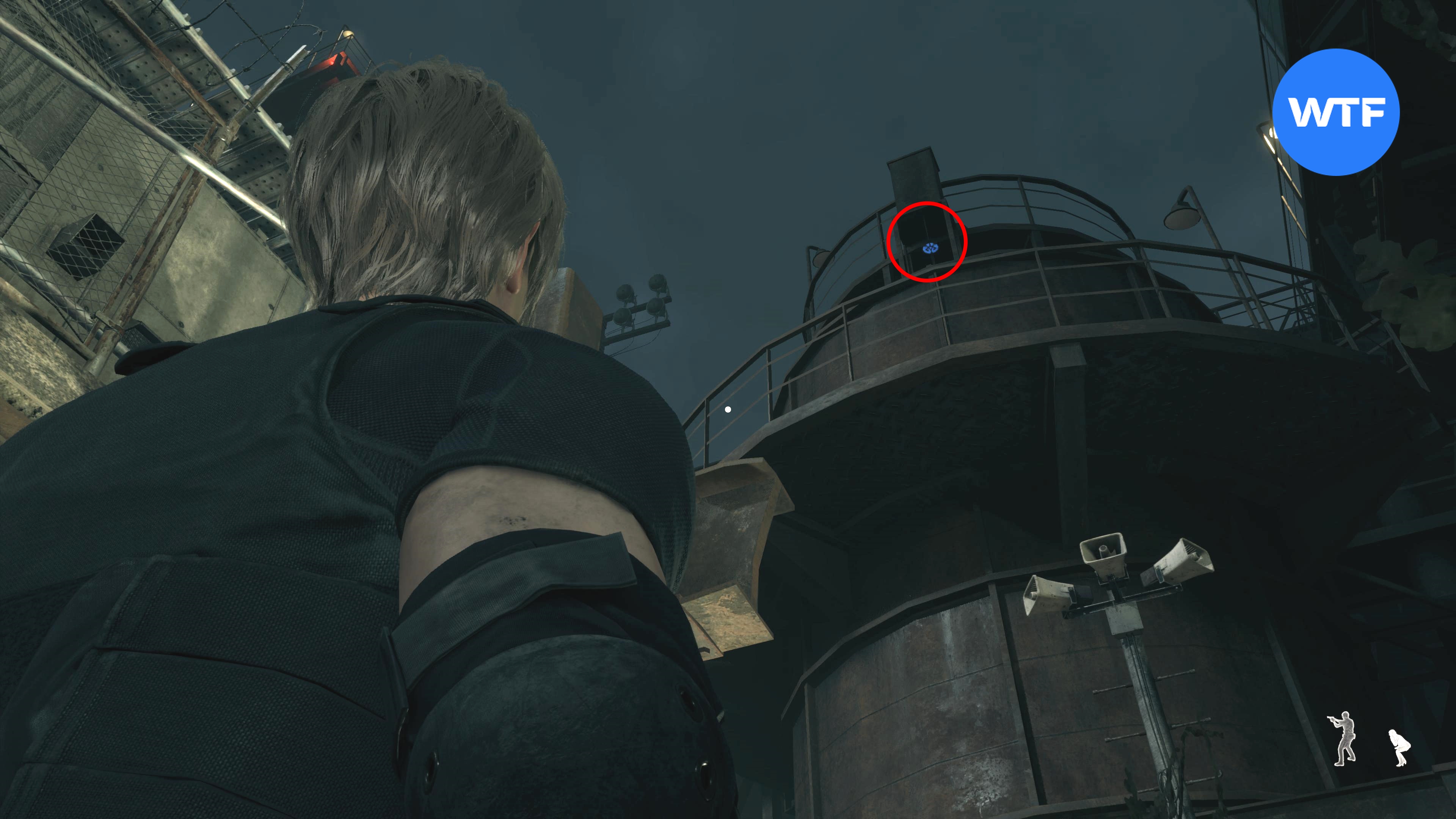 В юго-западном углу склада посмотрите наверх, чтобы увидеть этот медальон, свисающий с высокой башни на самом верху.