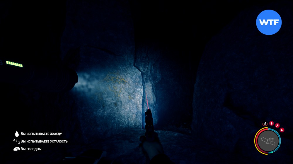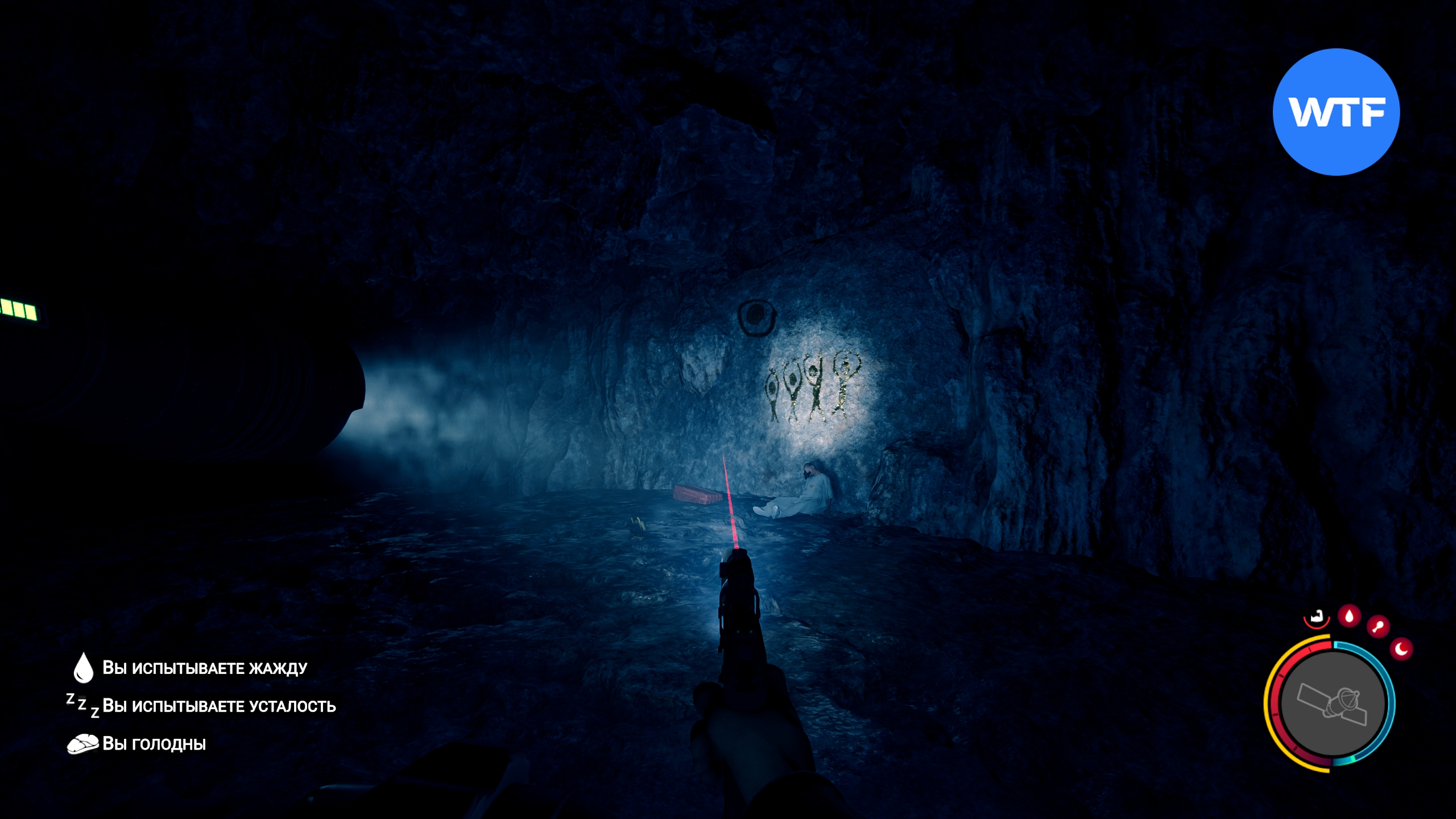 Если вы все сделали правильно, то окажетесь в большом зале. Обратите внимание на свет: это проектор подсвечивает рисунок, сделанный золотой краской на стене пещеры. Идите в сторону рисунка: прямо под ним вы увидите тело, на голове которого и будут надеты очередные очки ночного видения.