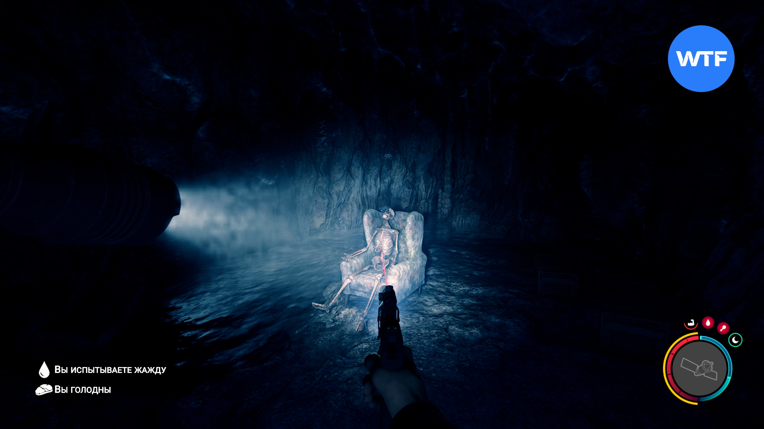 Заходите внутрь и никуда не спешите. Недалеко от входа в пещеру вы наткнетесь на скелет, развалившийся в большом кресле. Очки ночного видения будут надеты прямо на его череп. Обратите внимание, что если в вашем инвентаре уже есть прибор ночного видения, то вторые очки могут не появиться в нужном месте.