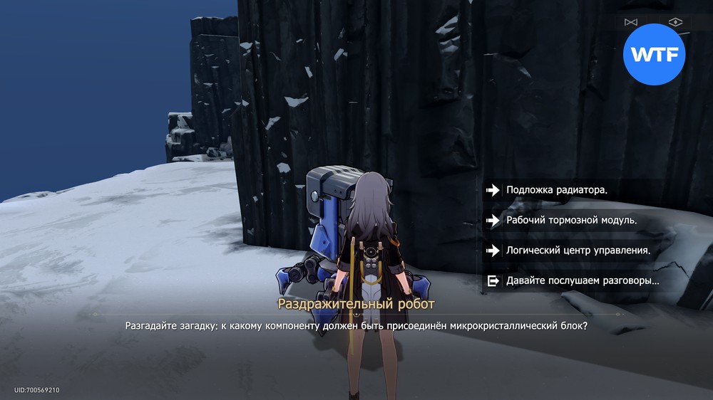 Второй робот будет более раздражительным и задаст вам вопрос про микрокристаллический блок. Правильный ответ можно узнать из спора двух рабочих рядом. Внимательно прослушайте весь диалог, чтобы получить верный ответ.