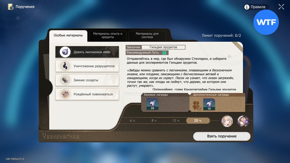 Чем больше срок, который вы выберете для выполнения поручения, тем больше наград вы получите. Также обратите внимание на рекомендуемый путь: отправив на задание двух персонажей пути Эрудиция вы получите дополнительные награды.