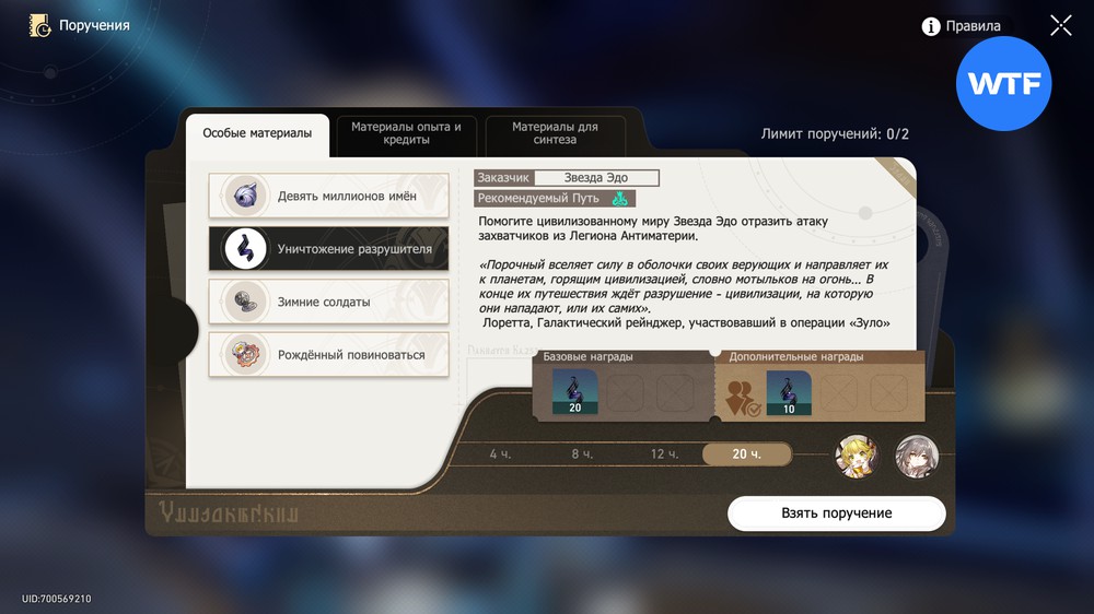 Чем больше срок, который вы выберете для выполнения поручения, тем больше наград вы получите. Также обратите внимание на рекомендуемый путь: отправив на задание двух персонажей пути Разрушения вы получите дополнительные награды.