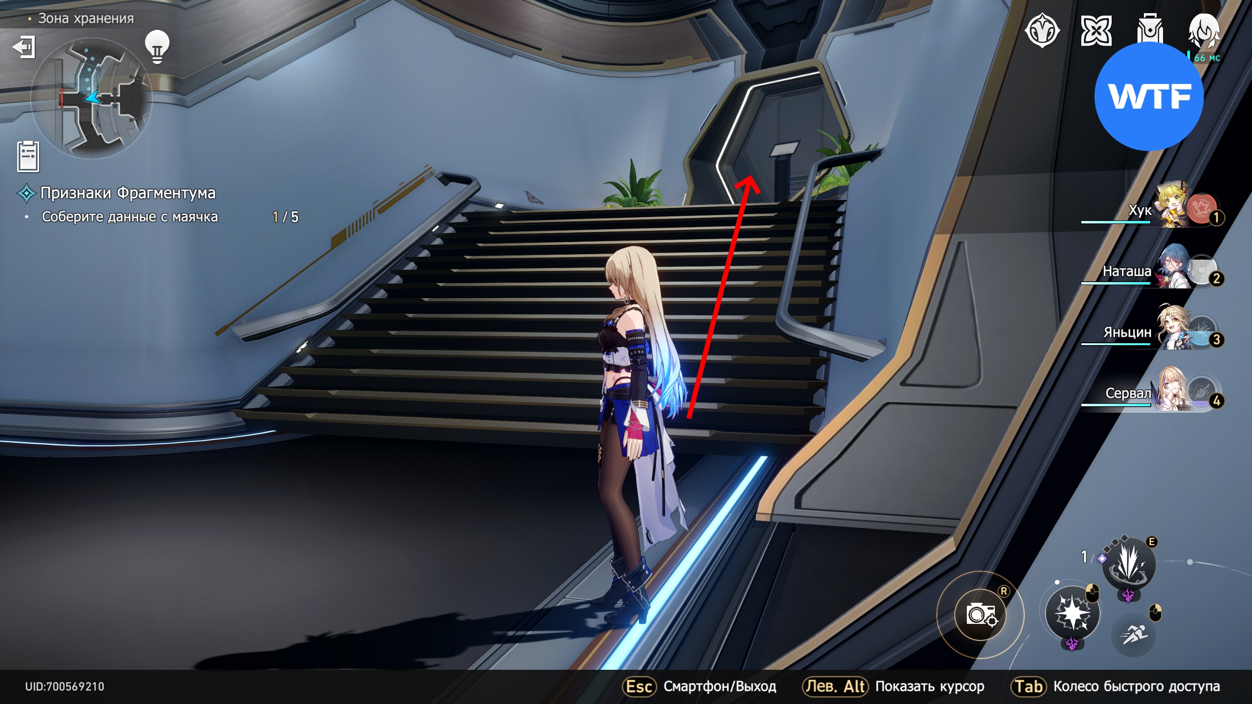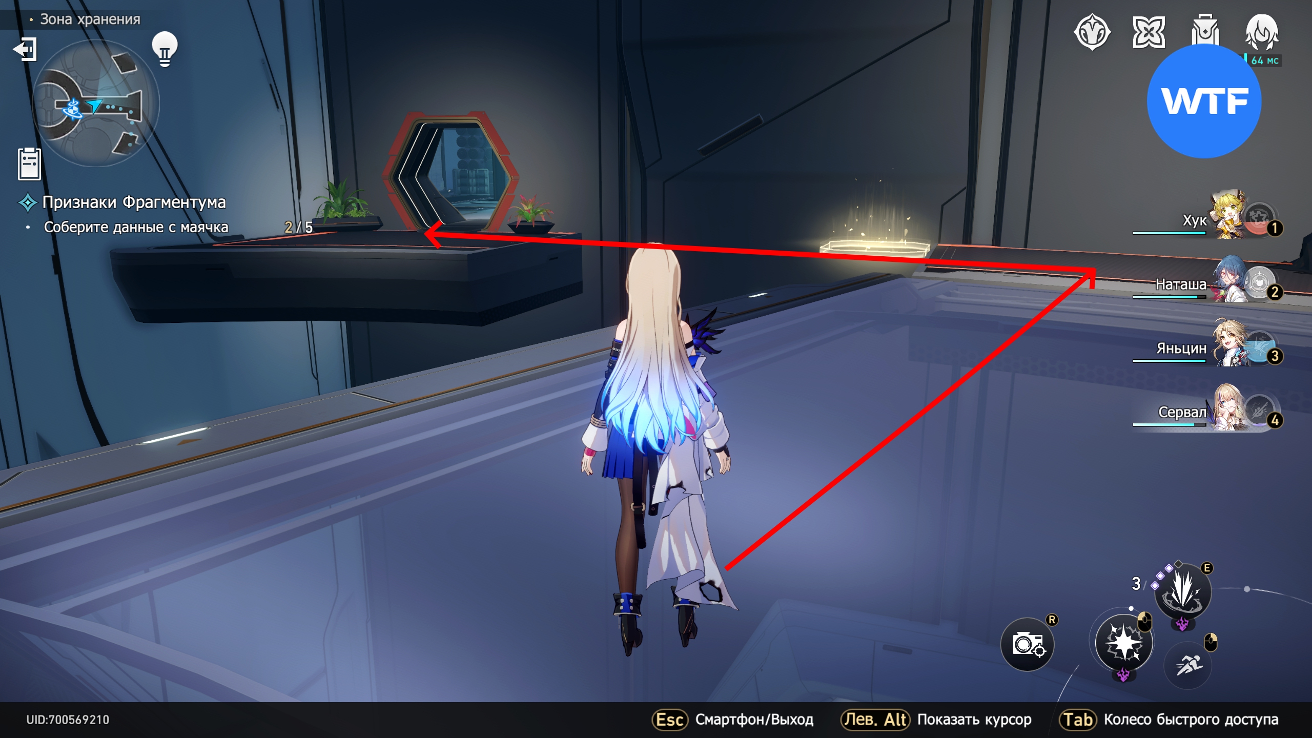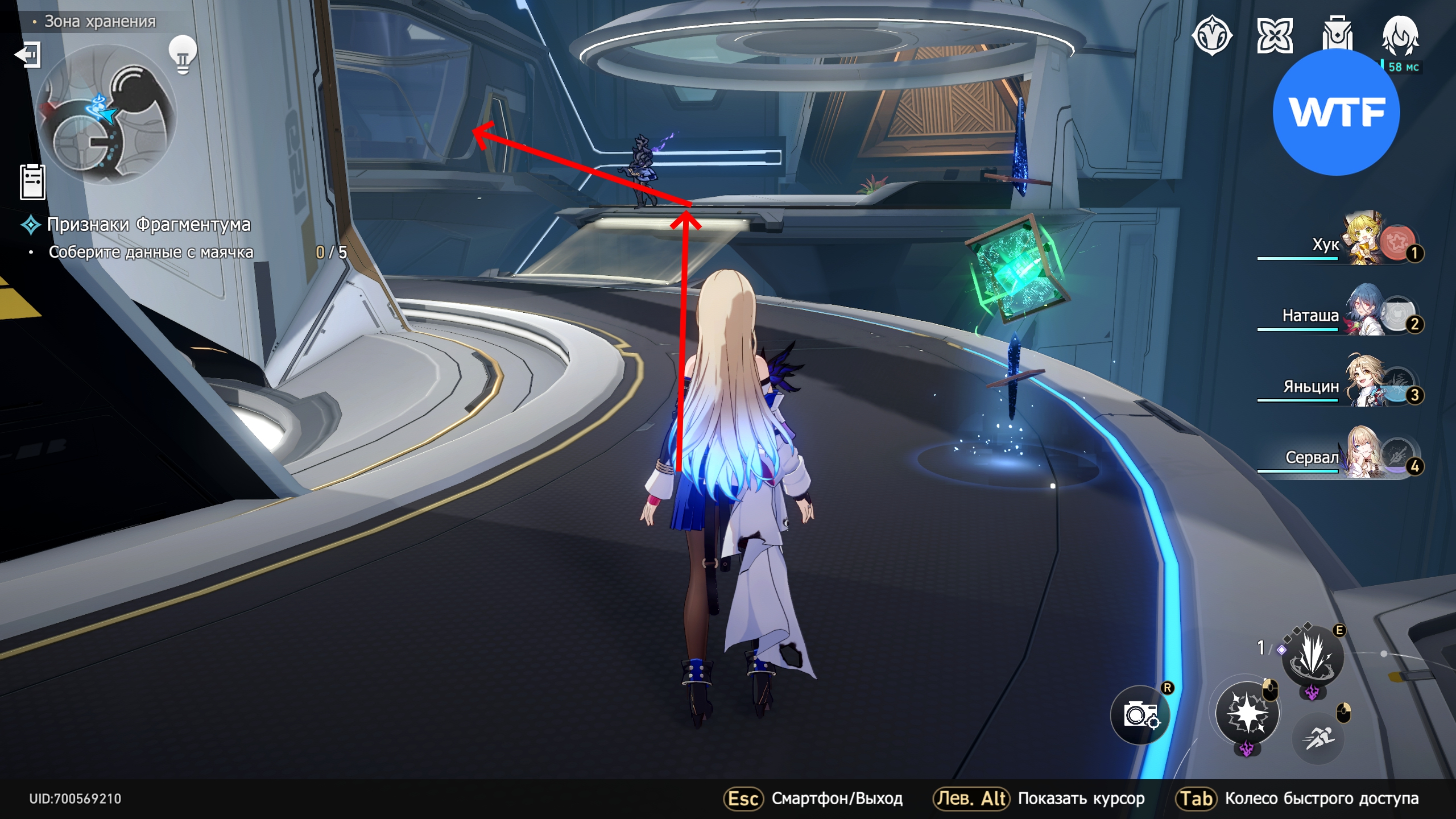 Теперь идите в единственный доступный вам проход мимо большой светящейся голограммы. Пройдя через арку, развернитесь и посмотрите наверх, чтобы найти второго Вуббабу с маячком прямо над ней.