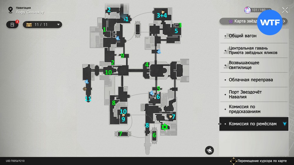 Для вашего удобства все сундуки мы нанесли на карту ниже и пронумеровали. Всего в Комиссии по ремеслам можно найти 10 обычных сундуков (отмечены зелеными цифрами), одну свинку-копилку пространства (отмечена зеленой звездочкой) и 11 сундуков с особо ценным лутом (отмечены голубым цветом).