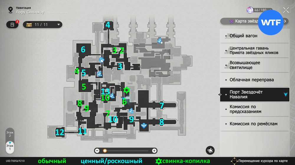 Для удобства на картах локаций все обычные сундуки отмечены зелеными цифрами, свинки-копилки пространства — зелеными звездочками, а сундуки с особо ценным лутом — голубыми цифрами.