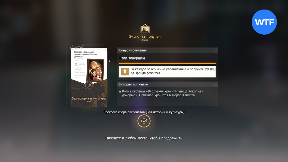 Вернувшись в музей и повесив картину на стену, вы получите бонус в размере 5 000 ед. фонда развития за каждое завершение управления.
