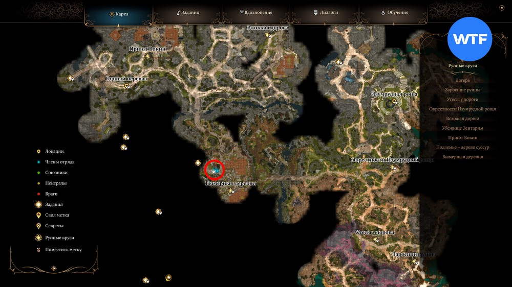 До Вымершей деревни можно добраться, следуя по дороге на запад от рунного круга Окрестности Изумрудной рощи. Войдя в деревню, направляйтесь в сторону большой мельницы, чтобы найти там гоблинов и гнома.