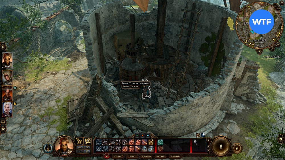 После этого обойдите мельницу с обратной стороны и зайдите внутрь через разрушенную стену. У основания лестницы вы увидите два рычага. Наведите на них мышку, чтобы прочитать надписи.