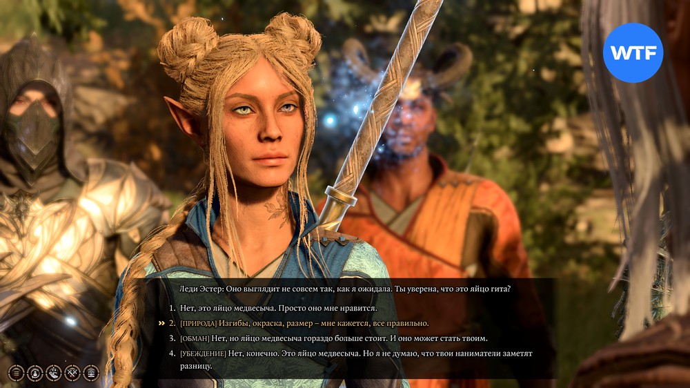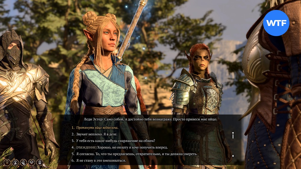 Леди Эстер расскажет вам, что ищет яйцо гитьянки и предложит ей в этом помочь. Если согласитесь, начнется квест «Украсть яйцо гитьянки». Если Лаэзель находится в группе, она этот выбор не одобрит.