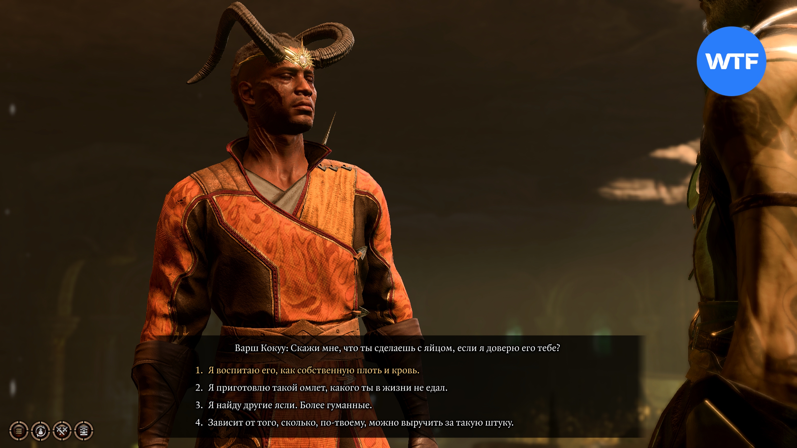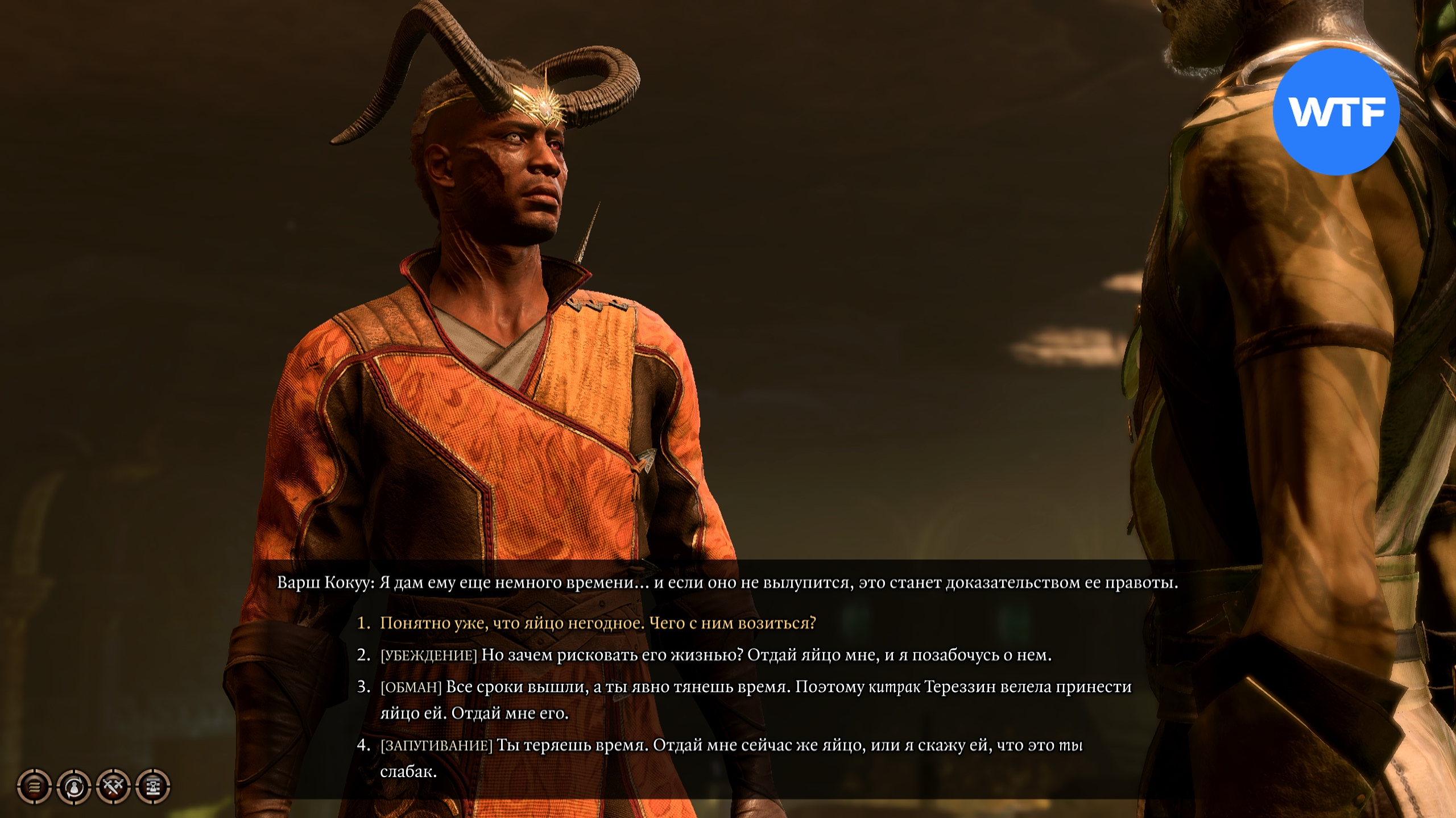 В диалоге вы должны пройти скрытую проверку на Проницательность, чтобы получить возможность убедить попечителя отдать вам яйцо. Он будет готов на это пойти, так как малыш давно должен было вылупиться и теперь китрак настаивает на его уничтожении.