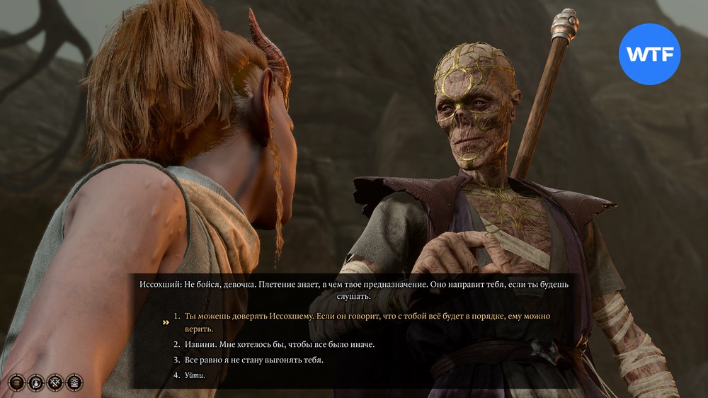 После этого вы сможете продолжить разговор, к которому у нас подключился другой житель лагеря — Иссохший. Он сказал, что девочка должна научиться путям волшебства, но при этом в лагере ей оставаться не стоит.