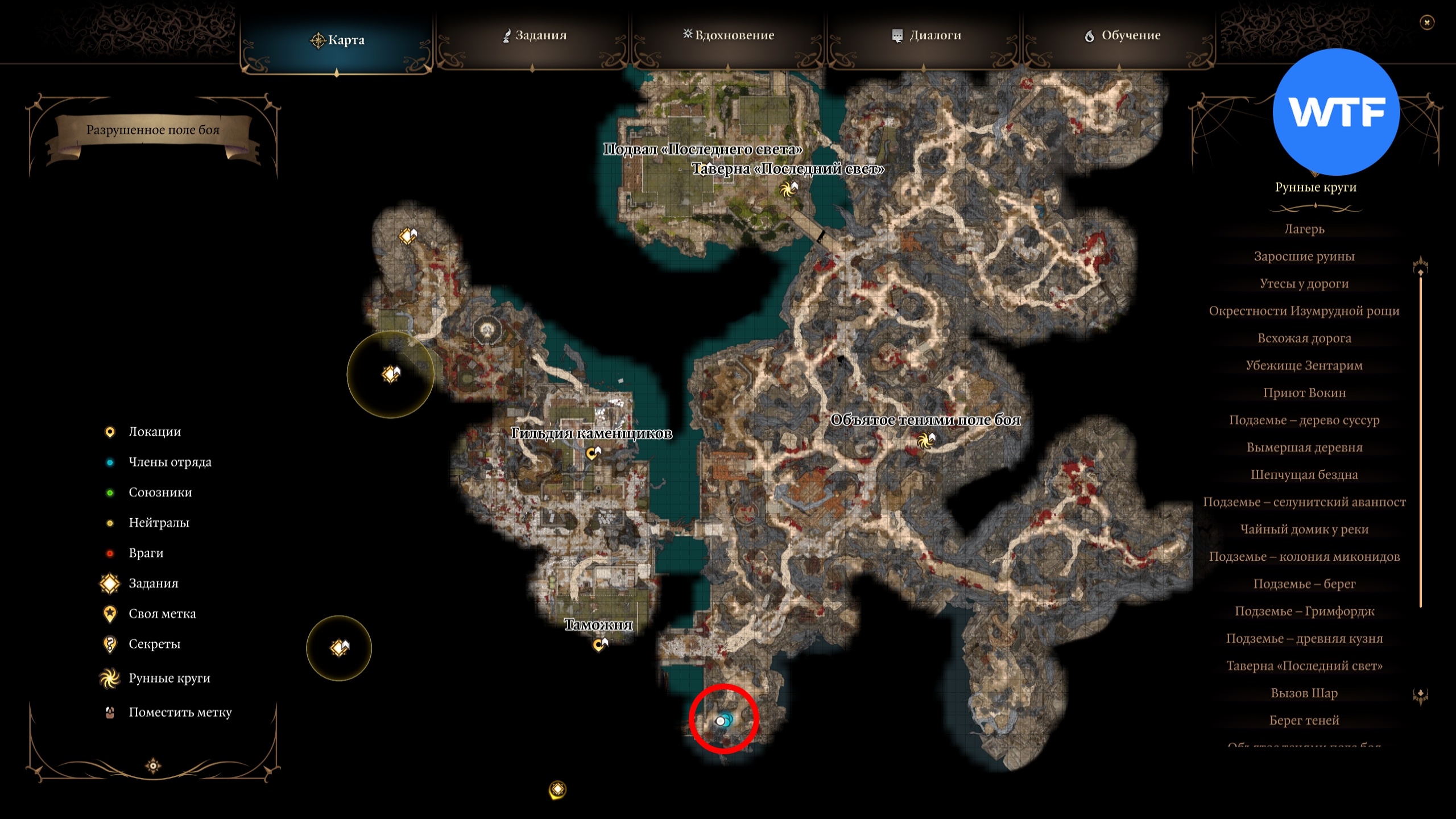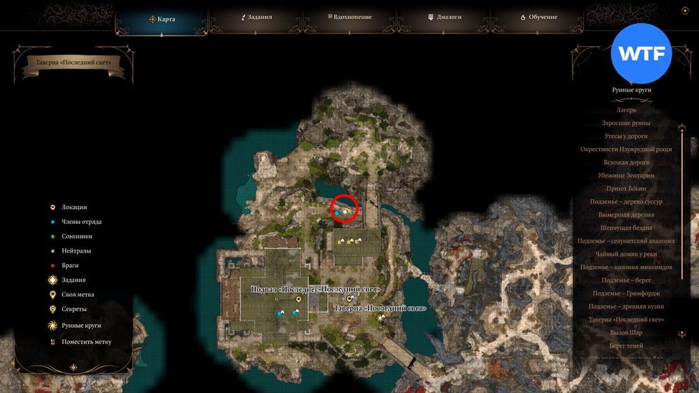 Если вы не сможете найти его на привычном месте в главном зале таверны, то стоит проверить точку к юго-востоку от Таможни со скриншота ниже. В какой-то момент нам пришлось спасать его там от теней, так как он хотел отправиться в Лунные Башни самостоятельно.