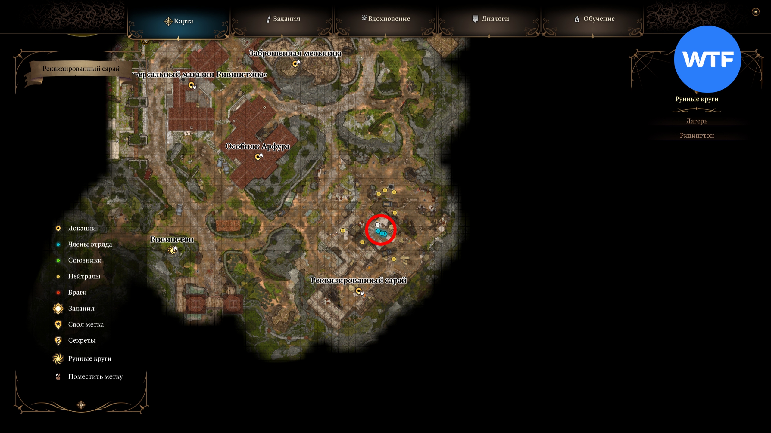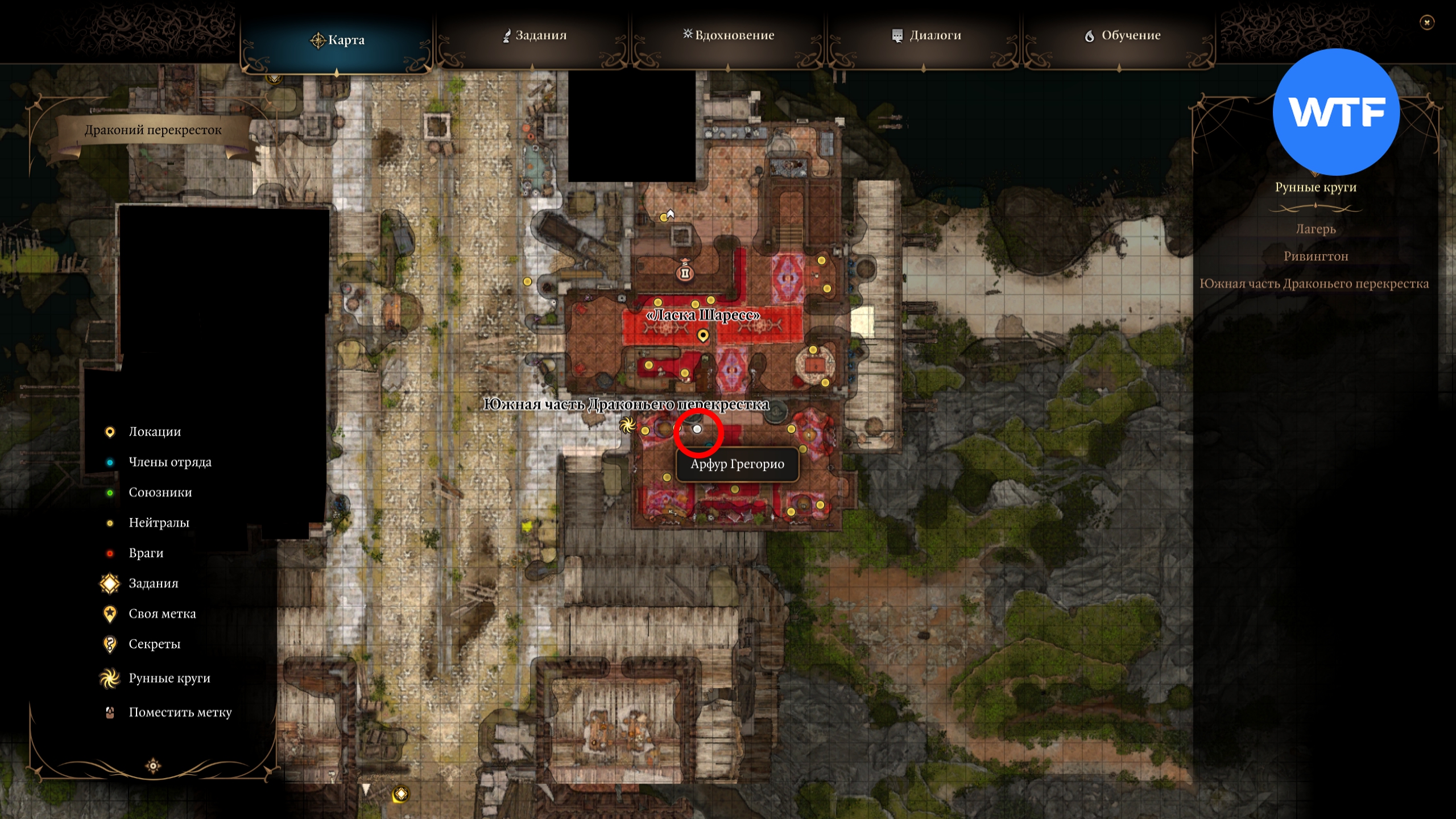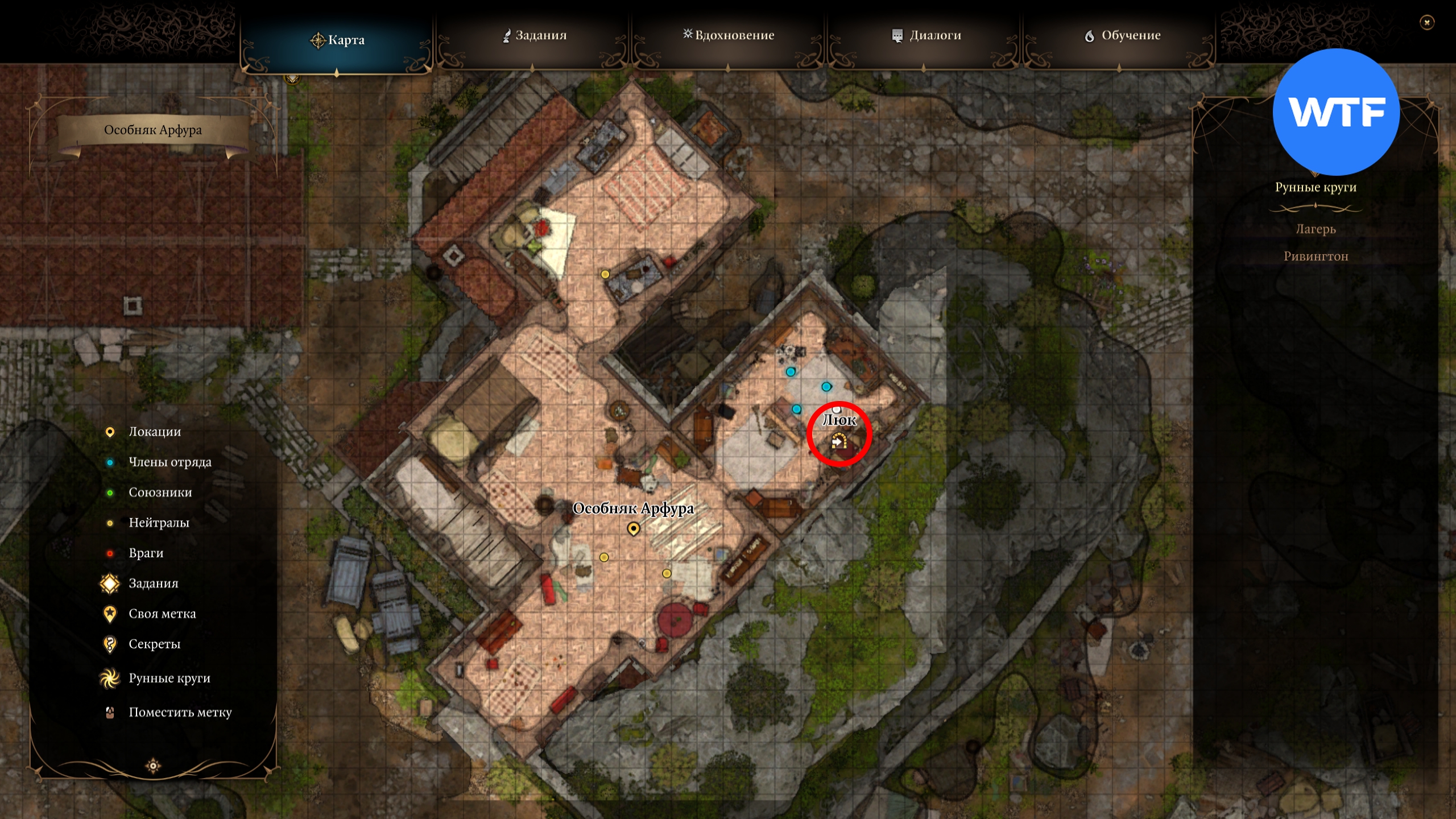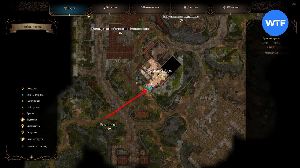 Особняк Арфура находится прямо напротив рунного круга «Ривингтон». Подойдя ко входу, вы застанете хозяина и его охрану, которые спорят с незваными гостями, не желающими покидать дом.