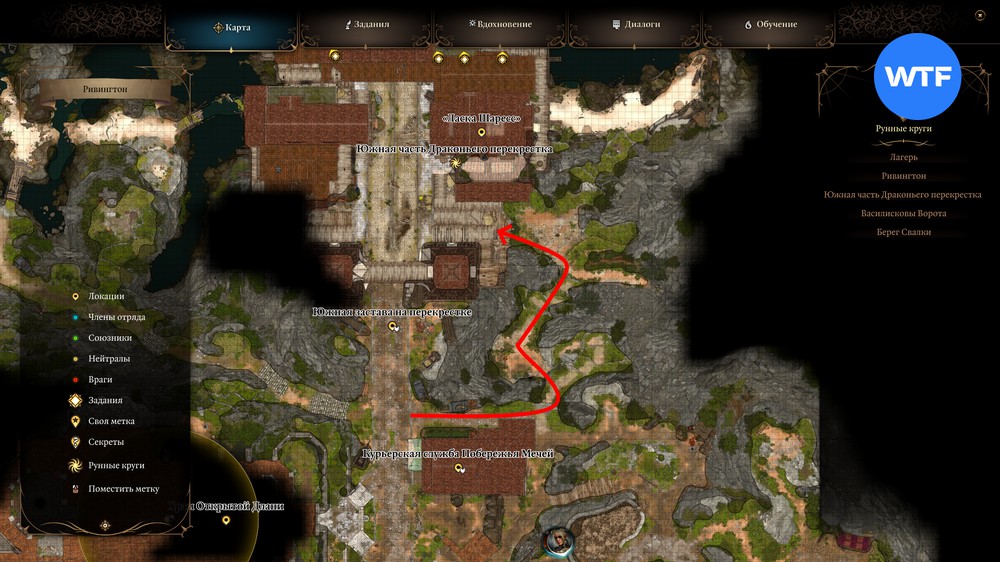 От рунного круга «Ривингтон» идите на север по главной дороге до Южной заставы на перекрестке. Через неё вас почти наверняка не пропустит стража, поэтому придется идти в обход.