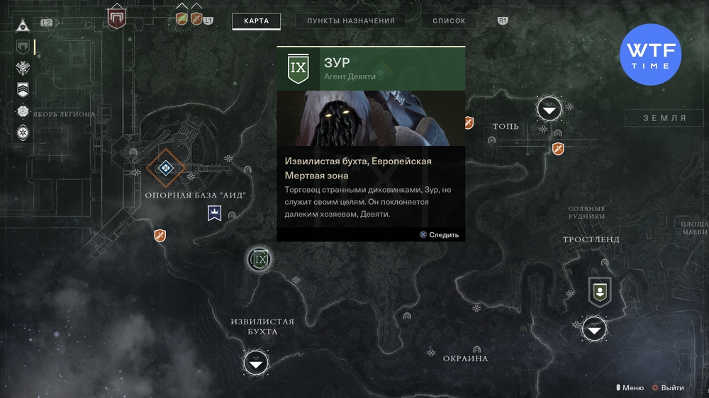 На этот раз Зур высадился на высоком утесе на Земле, готовьтесь как следует попрыгать. Вам нужна локация Извилистая бухта, ехать туда лучше на Спэрроу. Задержится Агент Девяти здесь на четыре дня и улетит домой за новыми товарами в полдень вторника.