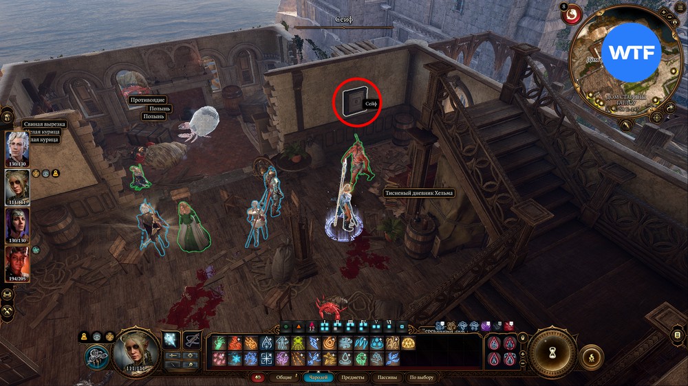 Сейф находится в этой же комнате, на стене. Обязательно соберите все, что лежит внутри, а также прочитайте обе книги. После этого вам станет доступен новый рецепт — Погибель карги.
