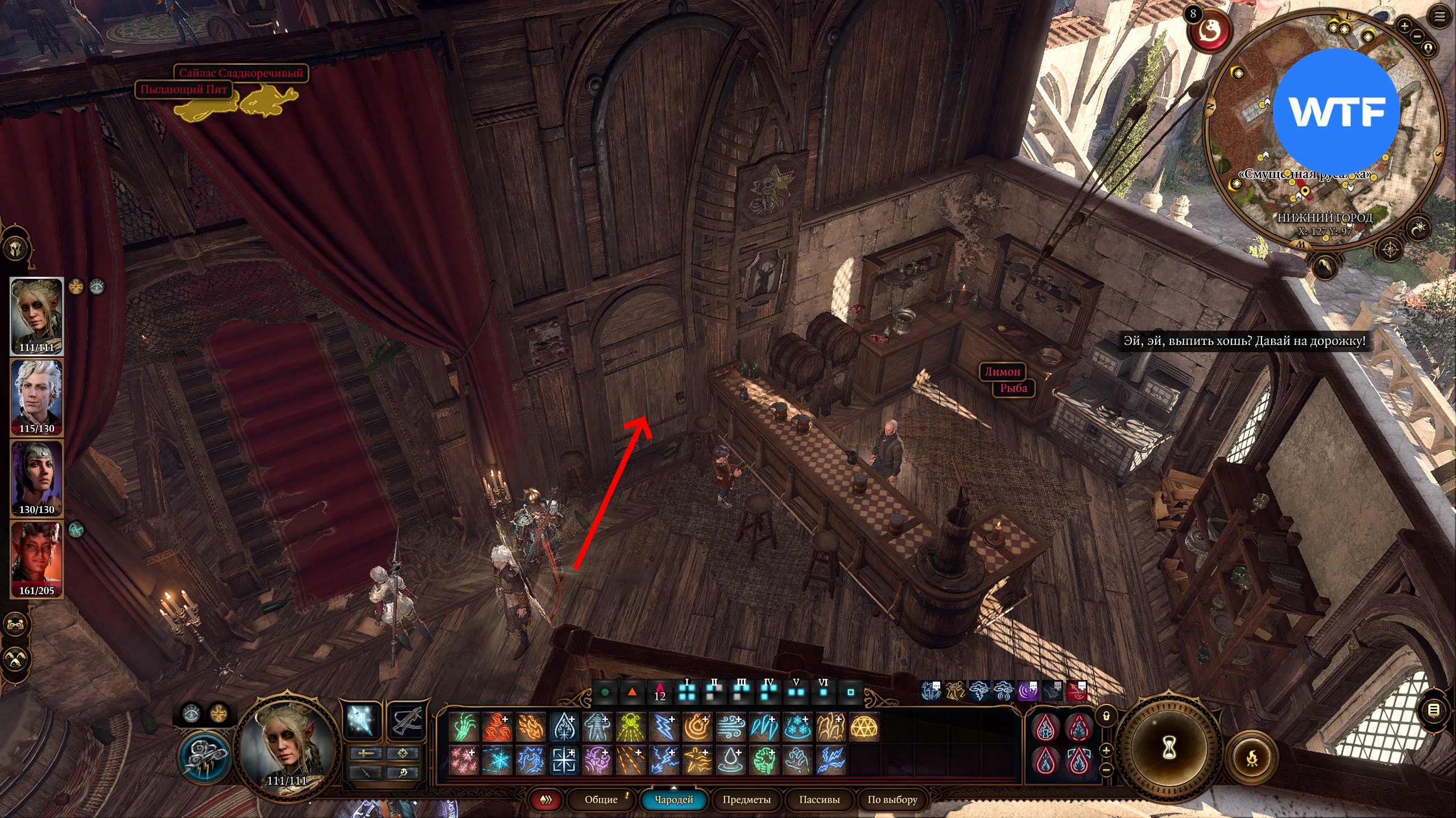 Чтобы найти Логово карги, спуститесь на первый этаж «Смущенной русалки» и пройдите через дверь слева от бара. Внутри забирайтесь прямо на бочки и пройдите проверку, чтобы понять что стена — это иллюзия (см. скриншот 2).