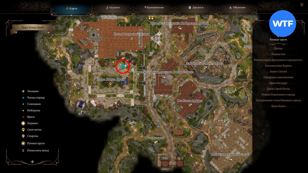 Добравшись до Ривингтона в начале третьего акта, следуйте по дороге на север от рунного камня, чтобы найти Цирк Конца Дней по левой стороне. Внутри идите в северо-восточный угол, где готовится выступление клоуна.