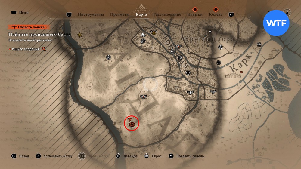 От Дома мудрости вам нужно двигаться на юг в сторону Окрестностей Багдада. Двигайтесь вперед до тех пор, пока не доберетесь до места, отмеченного на скриншоте ниже. Место раскопок находится именно там.