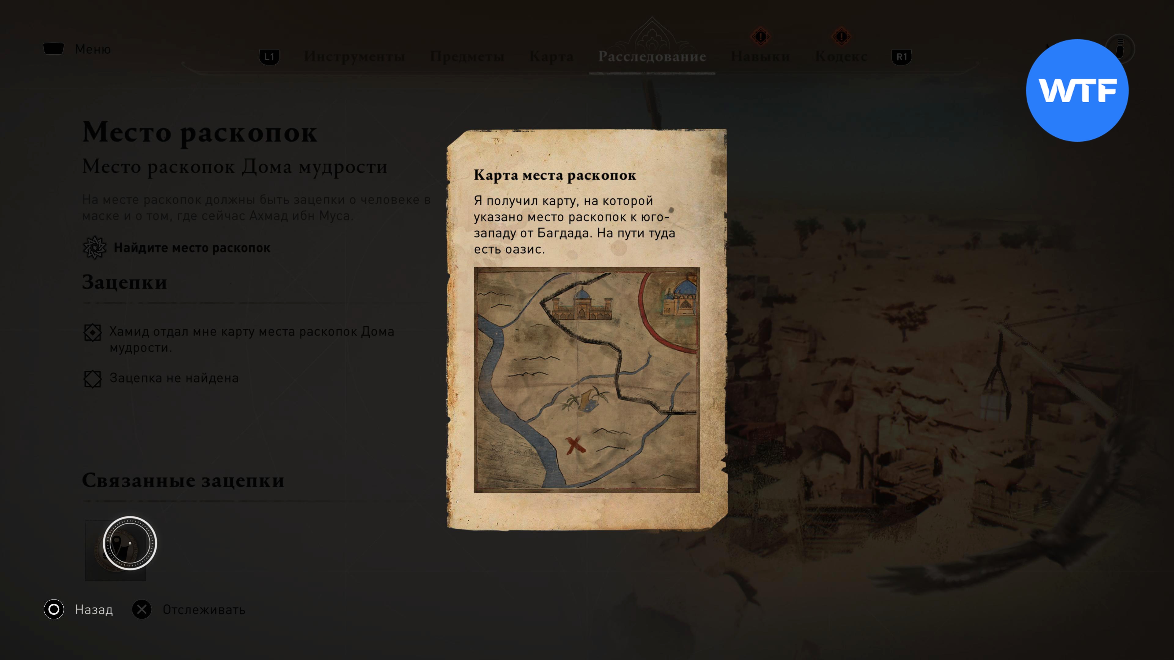 После того, как вы справитесь с засадой и поговорите с Хамидом, необходимо зайти в меню расследований и исследовать новый предмет, Карту места раскопок. Из неё вы узнаете, что место, в котором проводятся раскопки, расположено к юго-западу от Багдада, а на пути туда есть оазис.