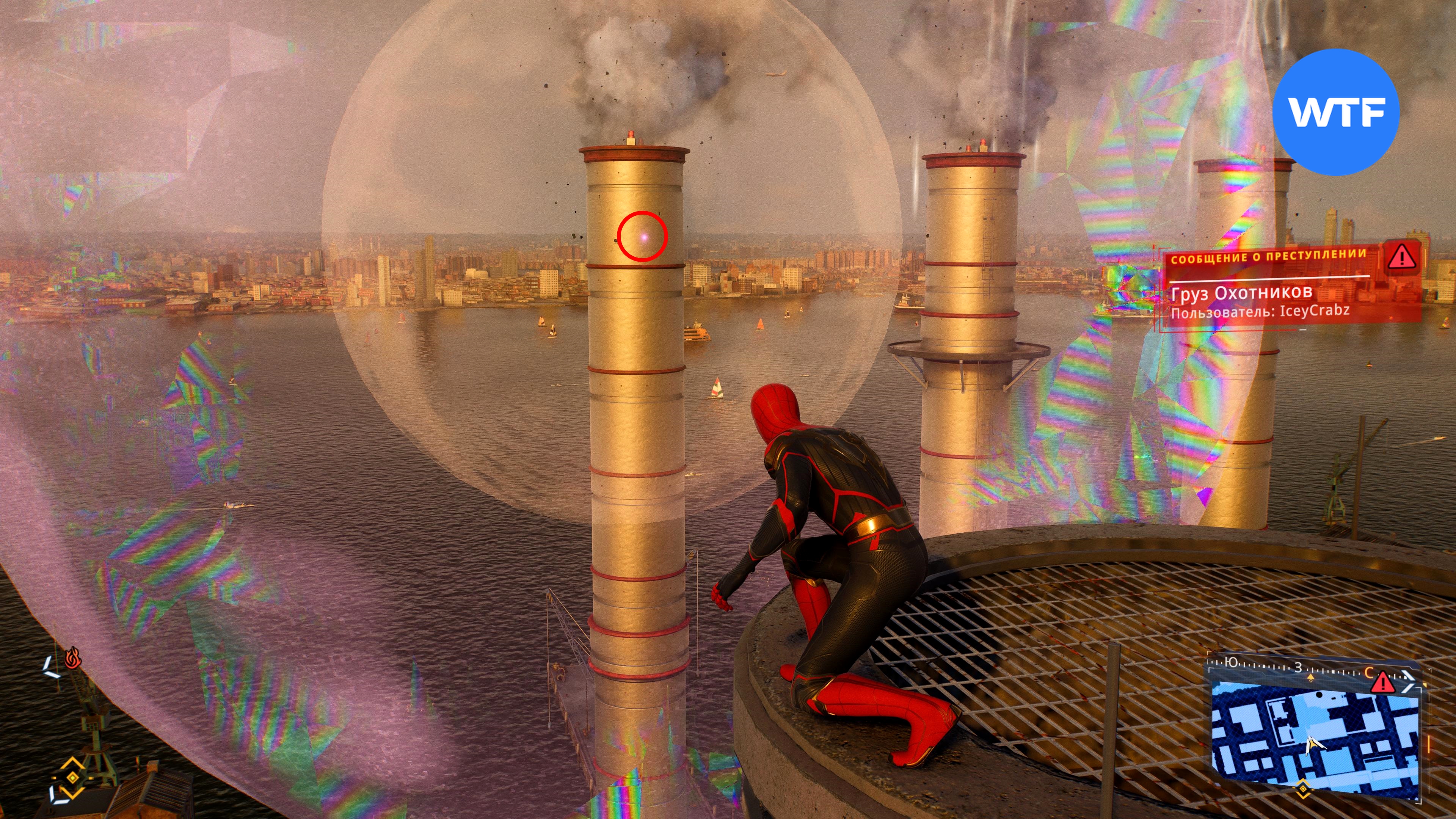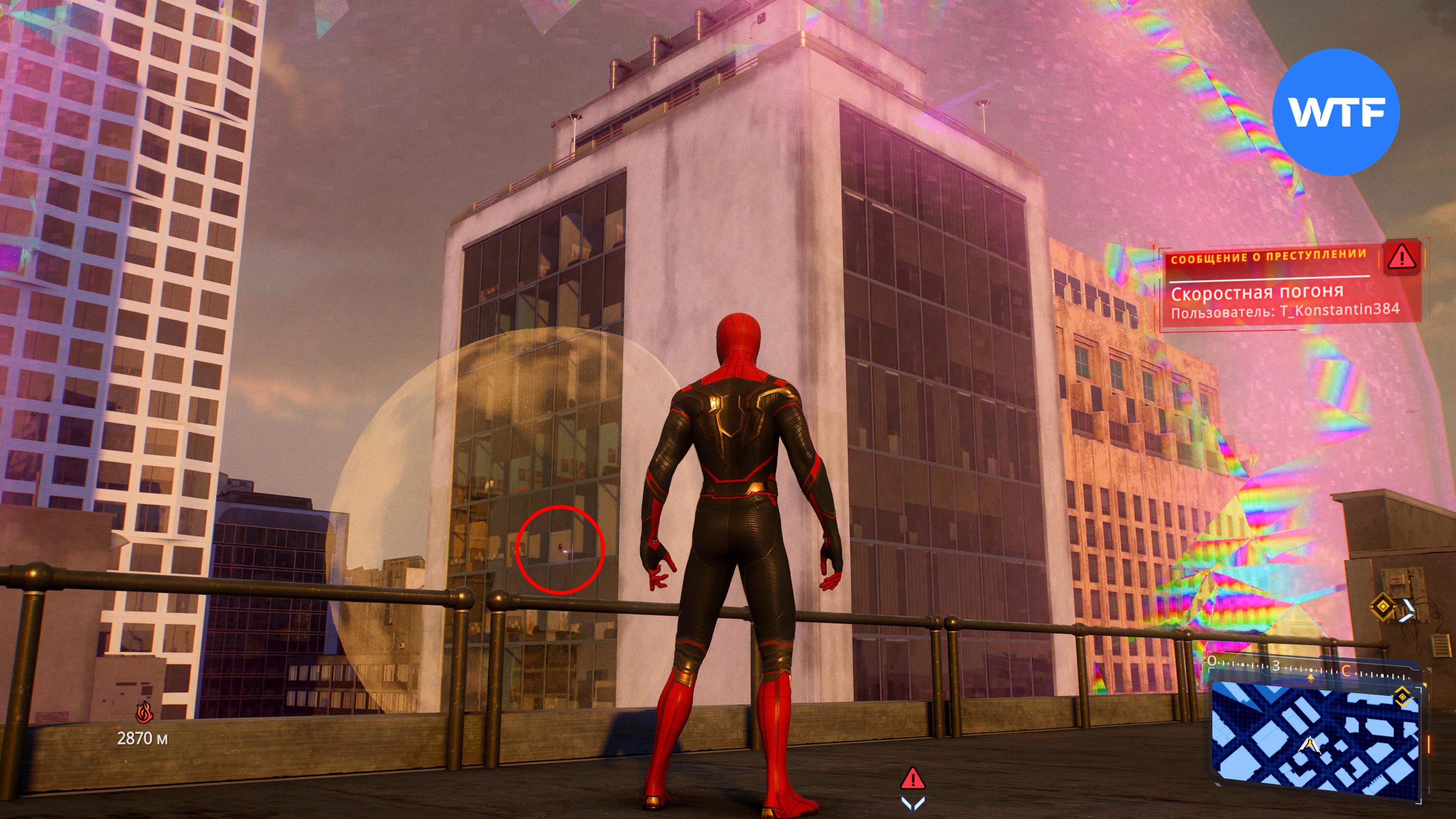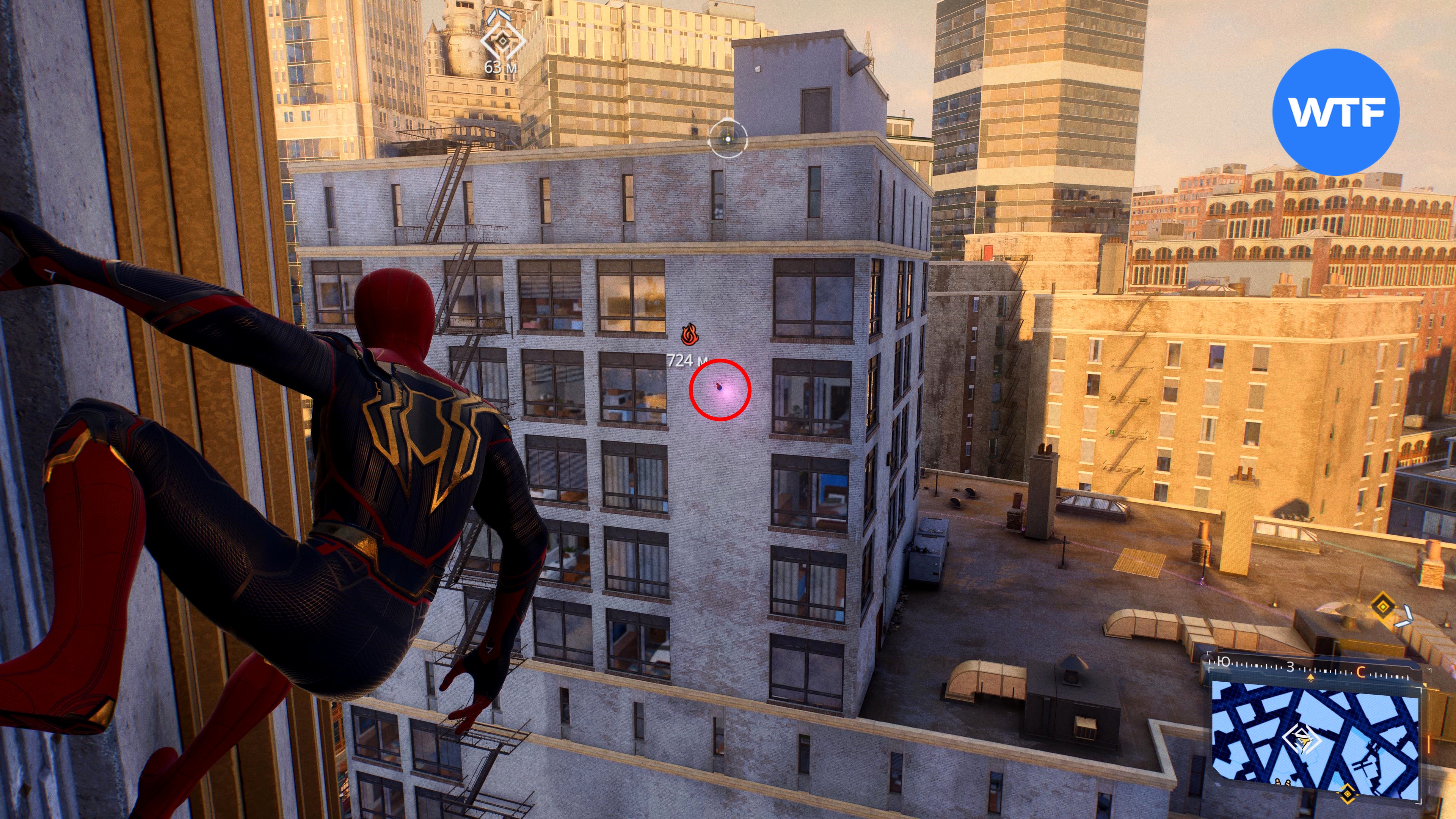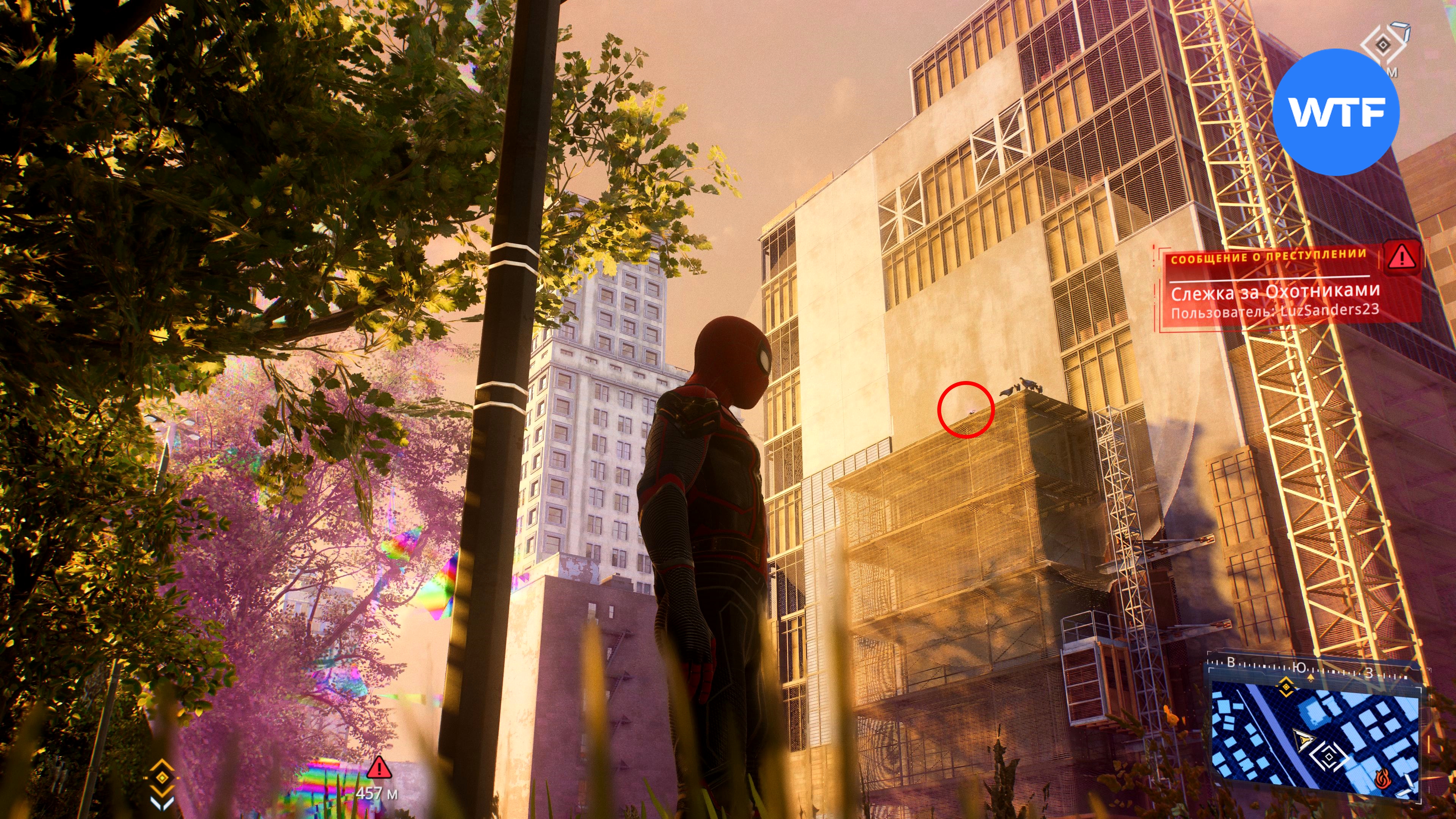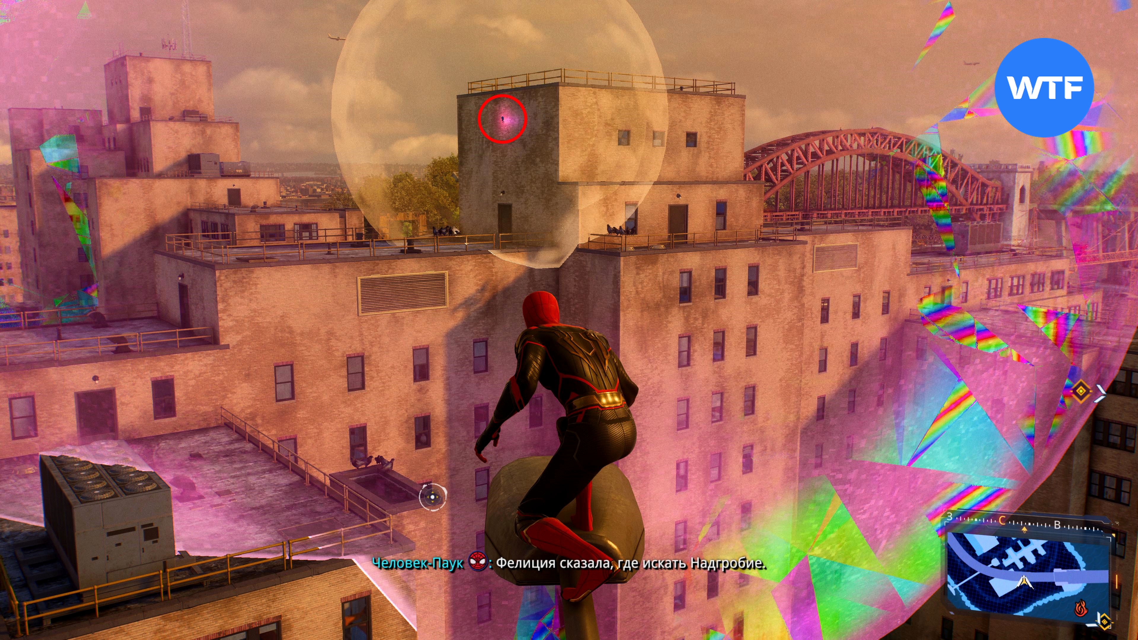 Еще один паукобот парит в северо-восточной части района Адская кухня. На скриншоте ниже метка стоит на здании с воздушным потоком, с которого к нему будет удобно спланировать. Примерное направление полета показано на втором скриншоте.