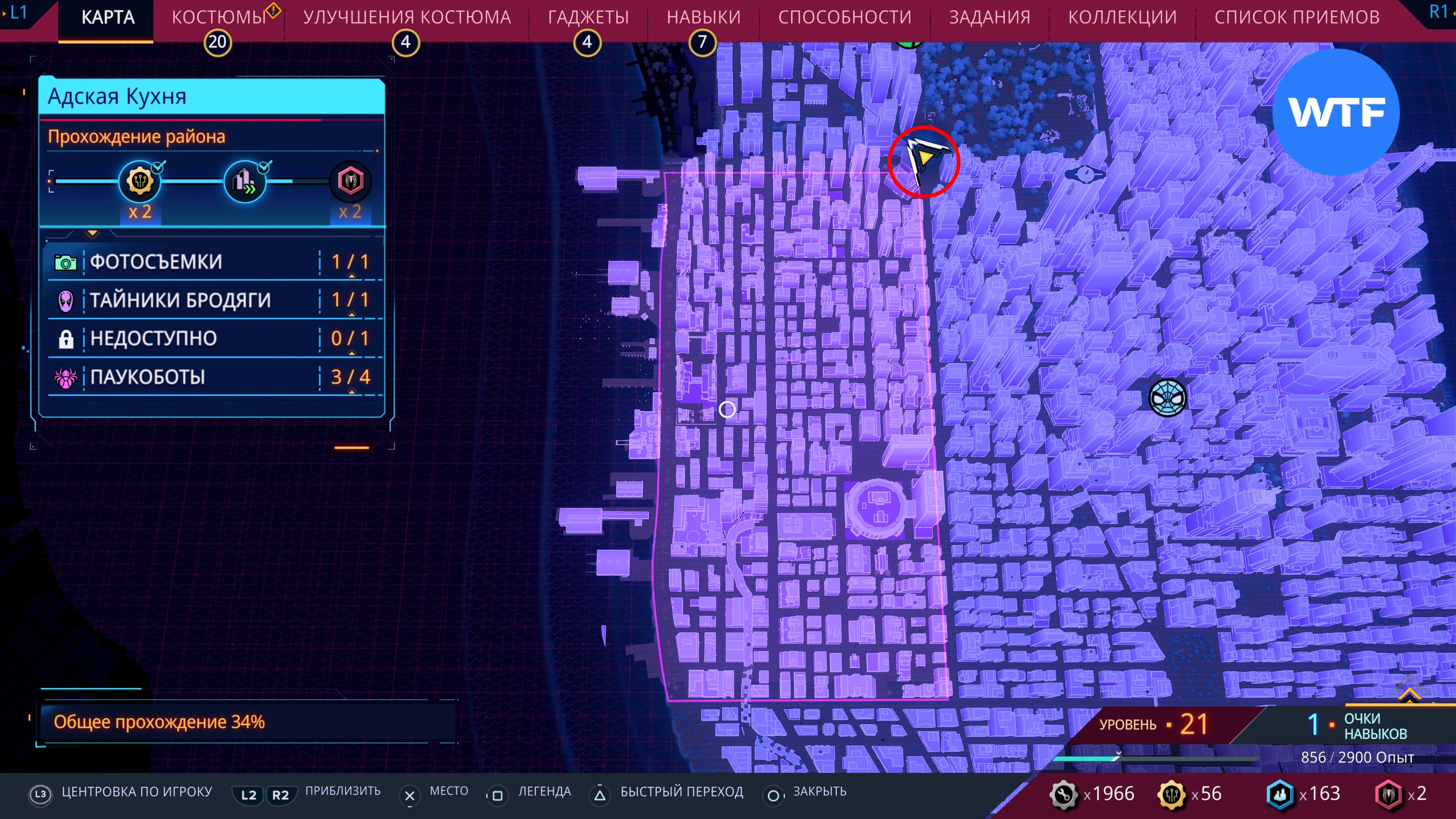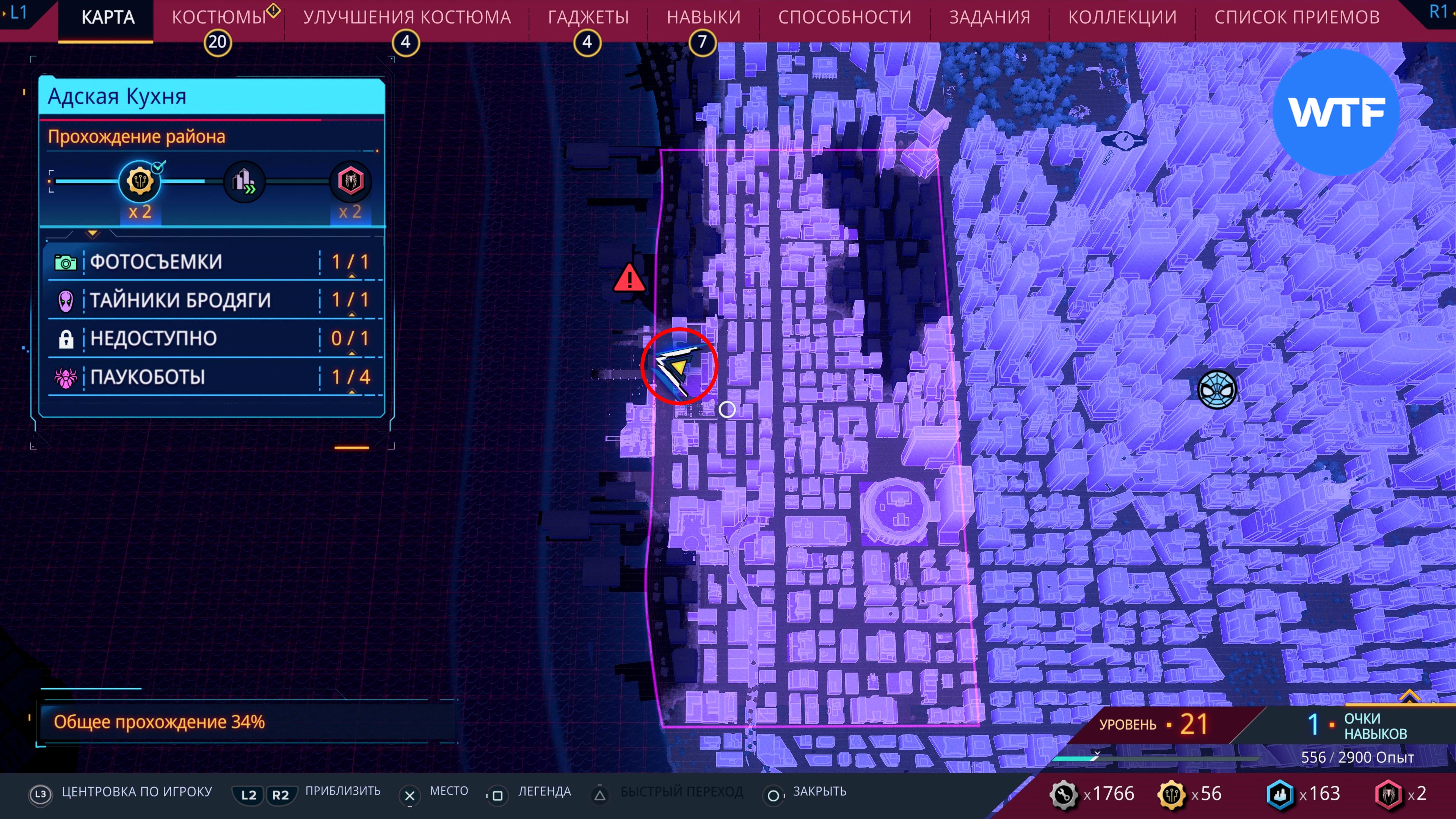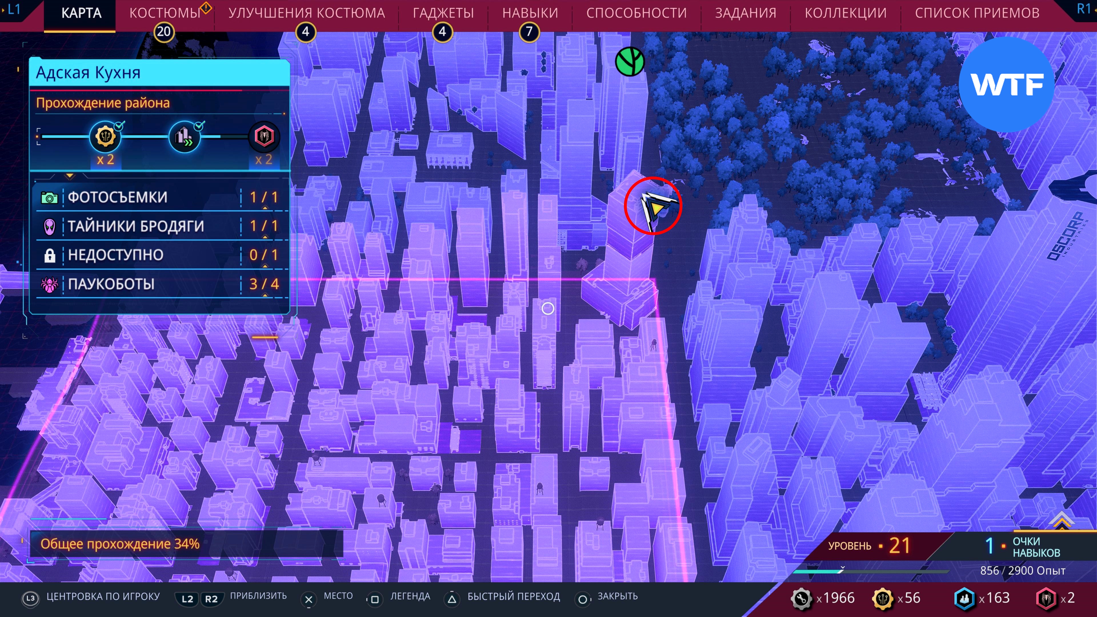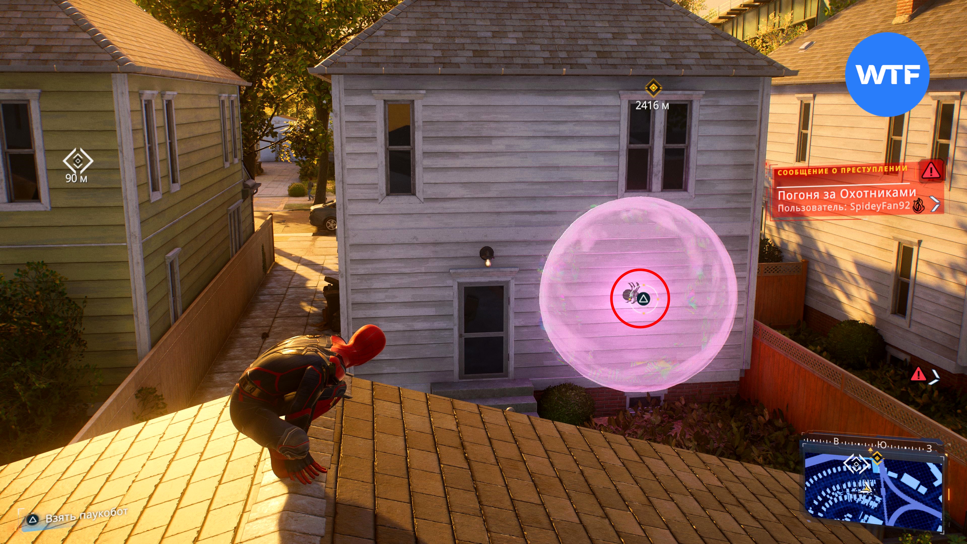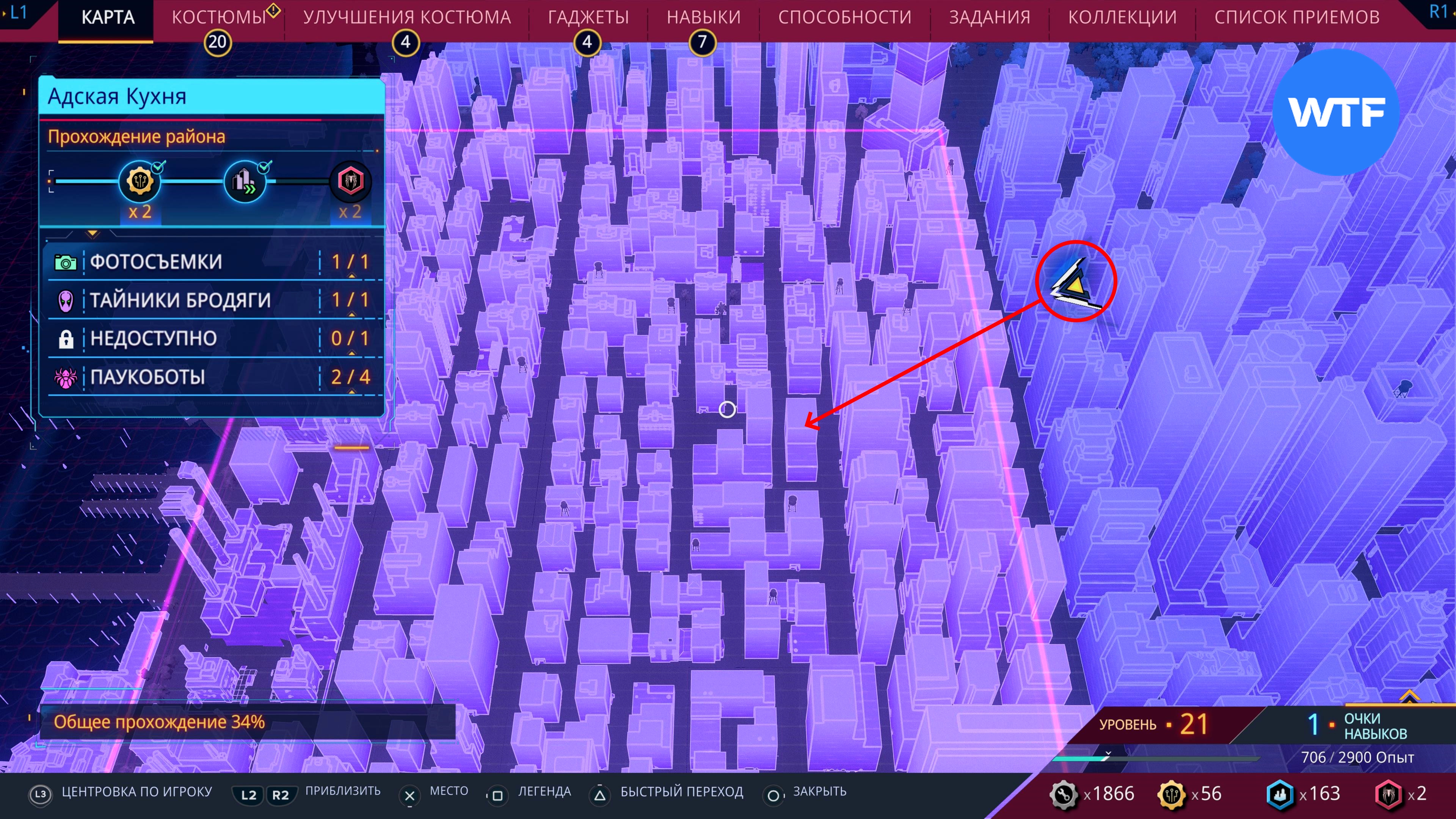Еще один паукобот парит в северо-восточной части района Адская кухня. На скриншоте ниже метка стоит на здании с воздушным потоком, с которого к нему будет удобно спланировать. Примерное направление полета показано на втором скриншоте.