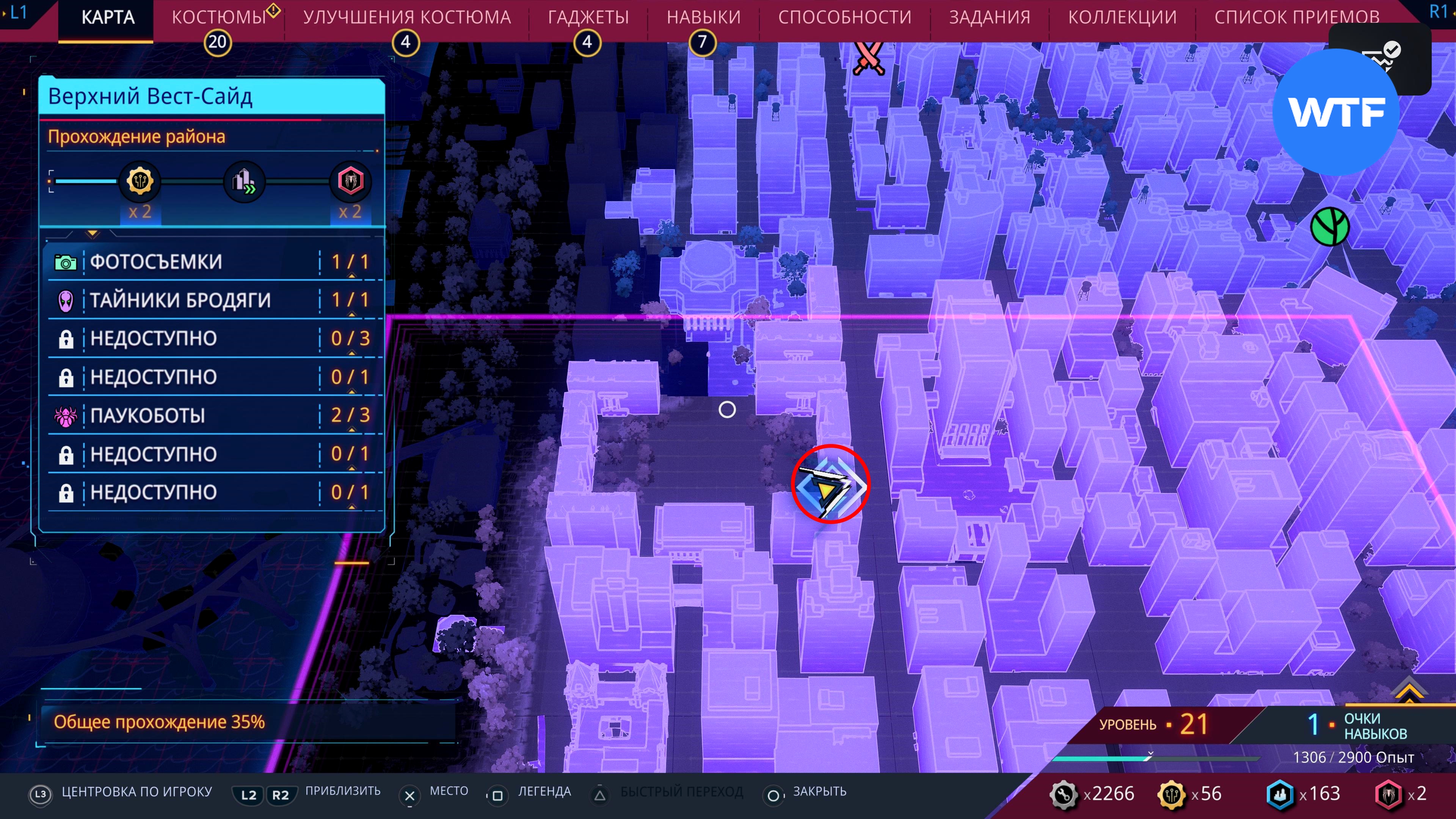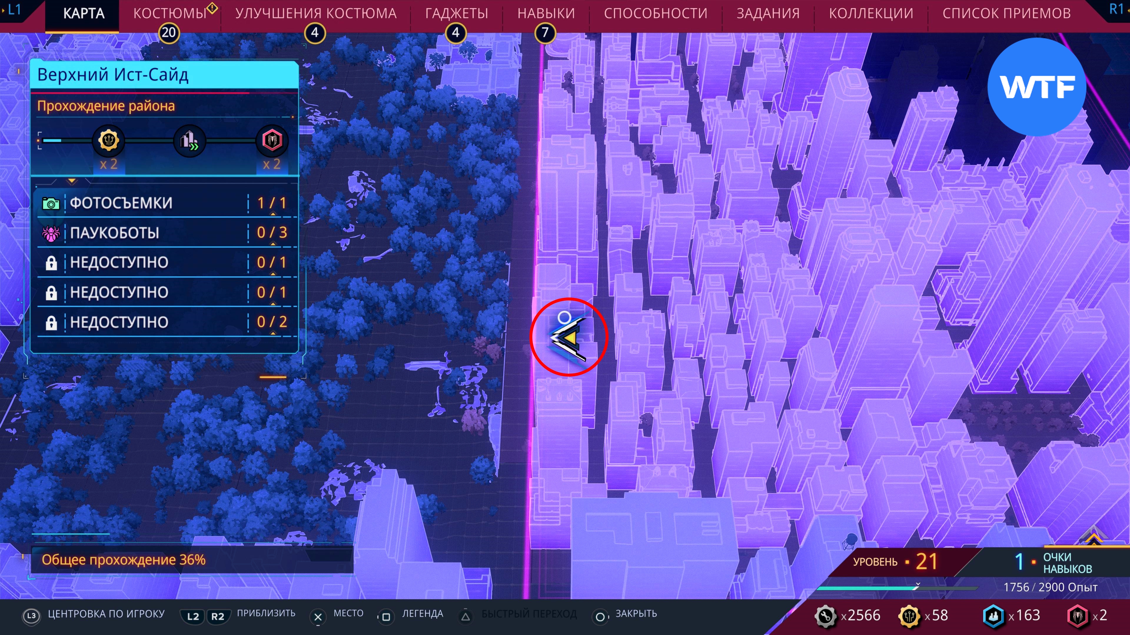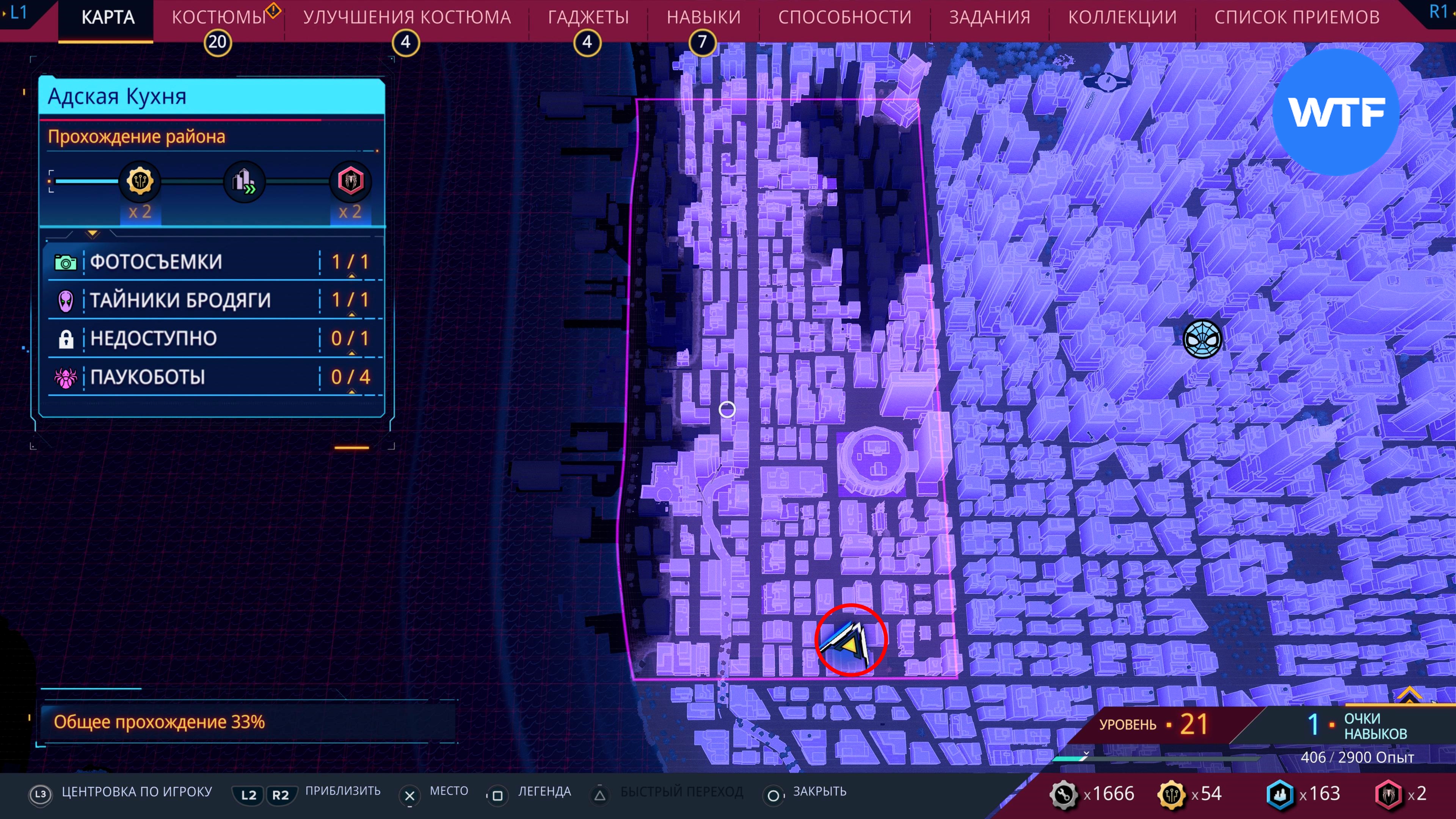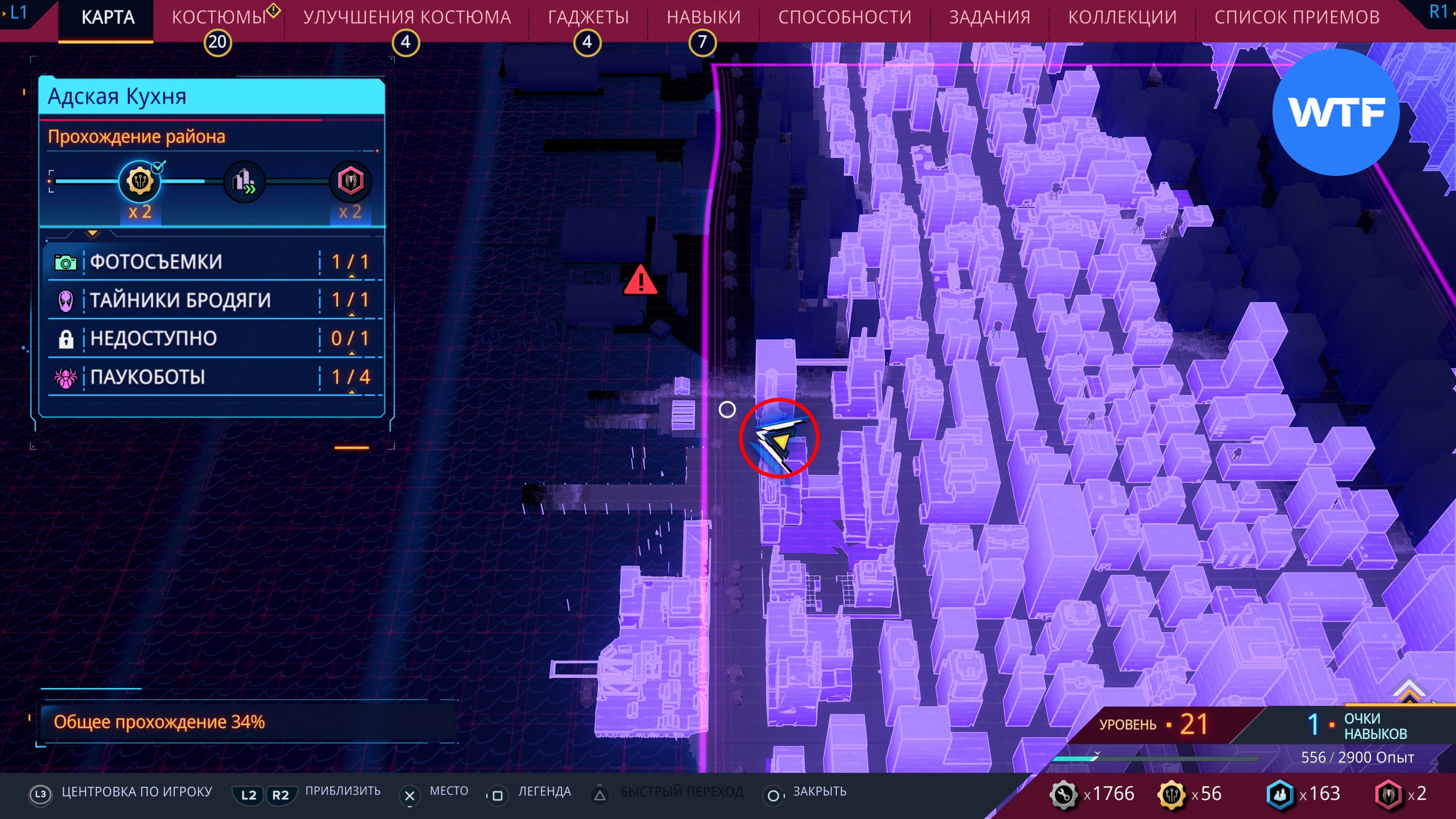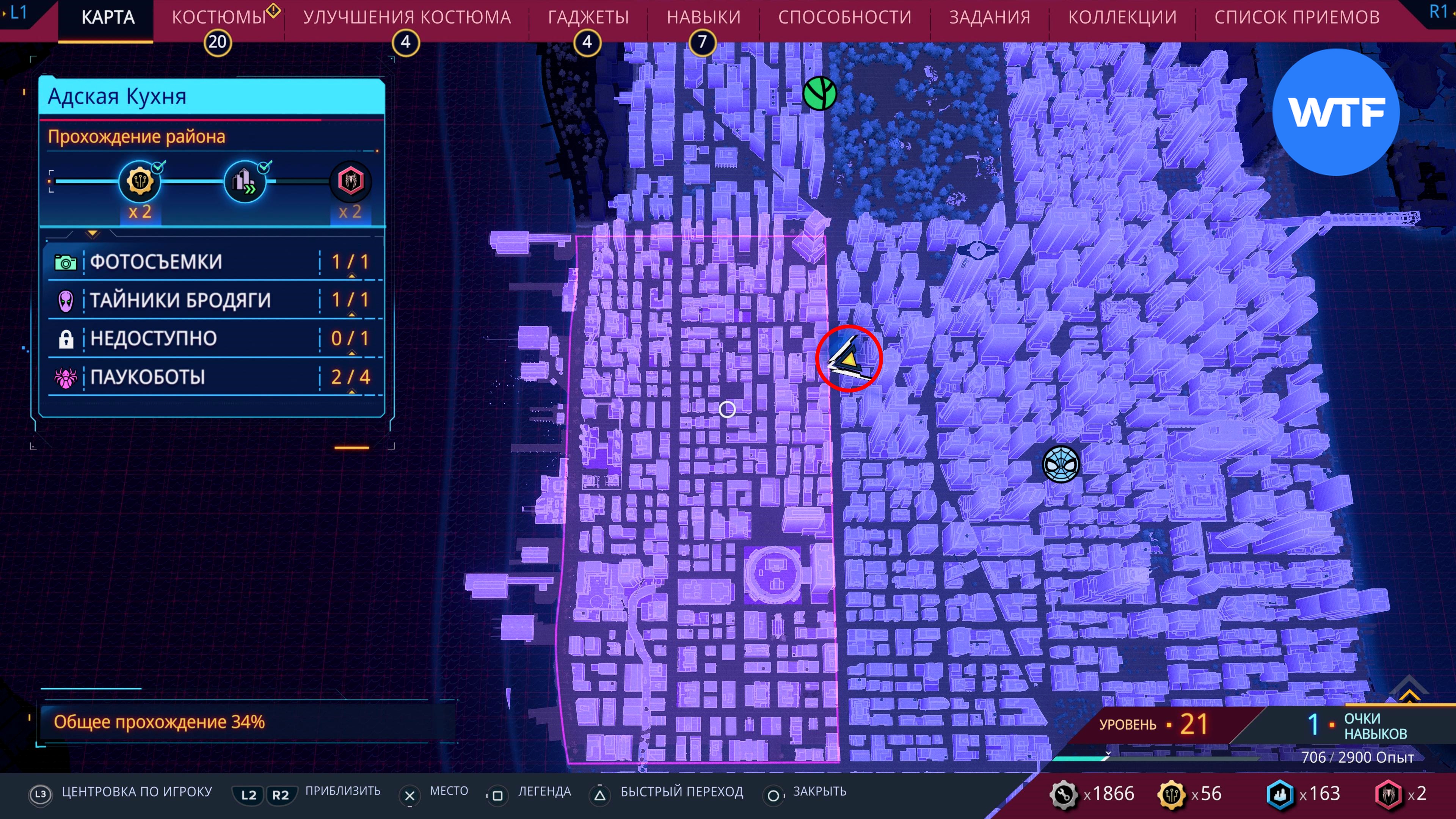 Еще один паукобот парит в северо-восточной части района Адская кухня. На скриншоте ниже метка стоит на здании с воздушным потоком, с которого к нему будет удобно спланировать. Примерное направление полета показано на втором скриншоте.