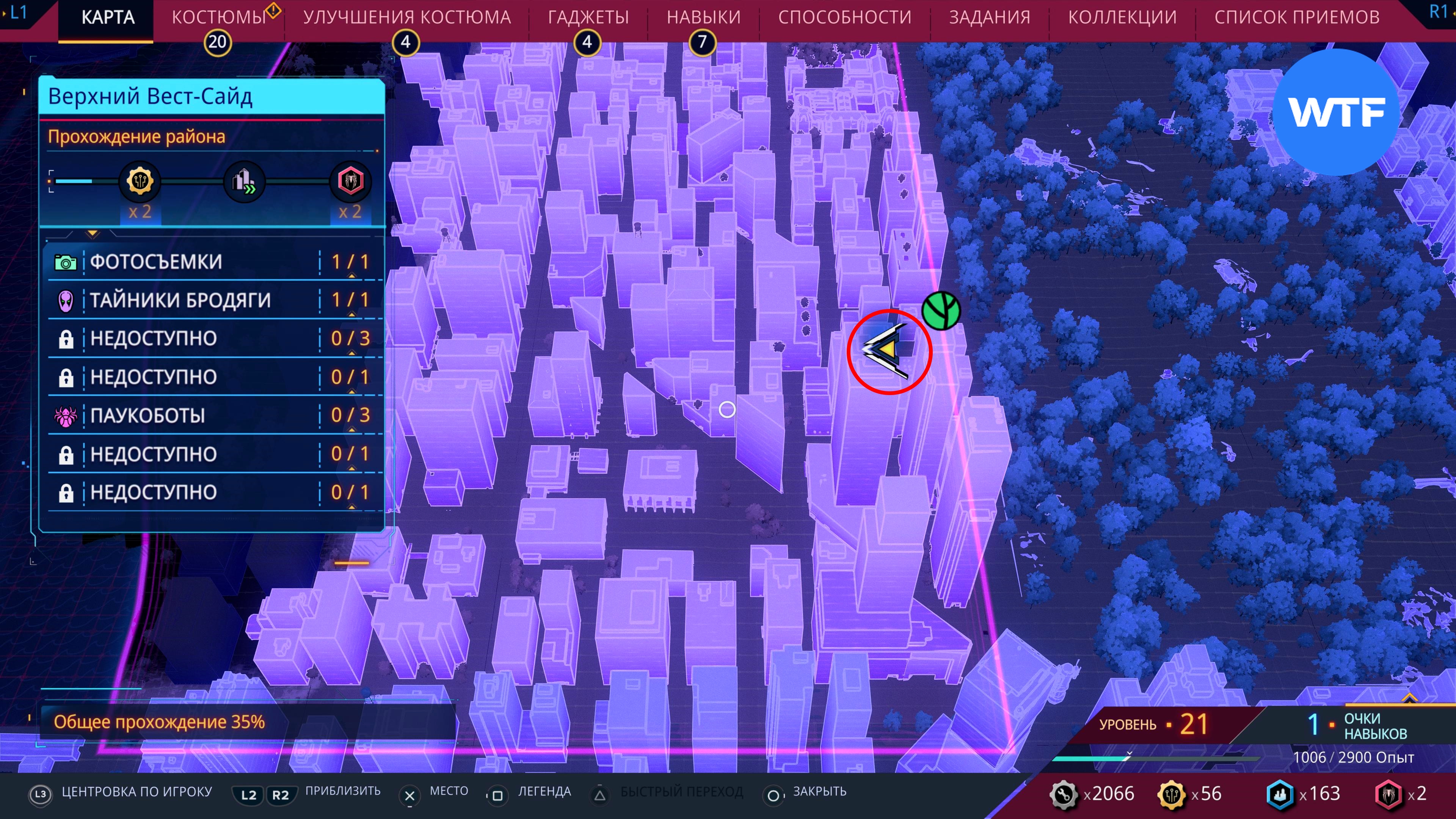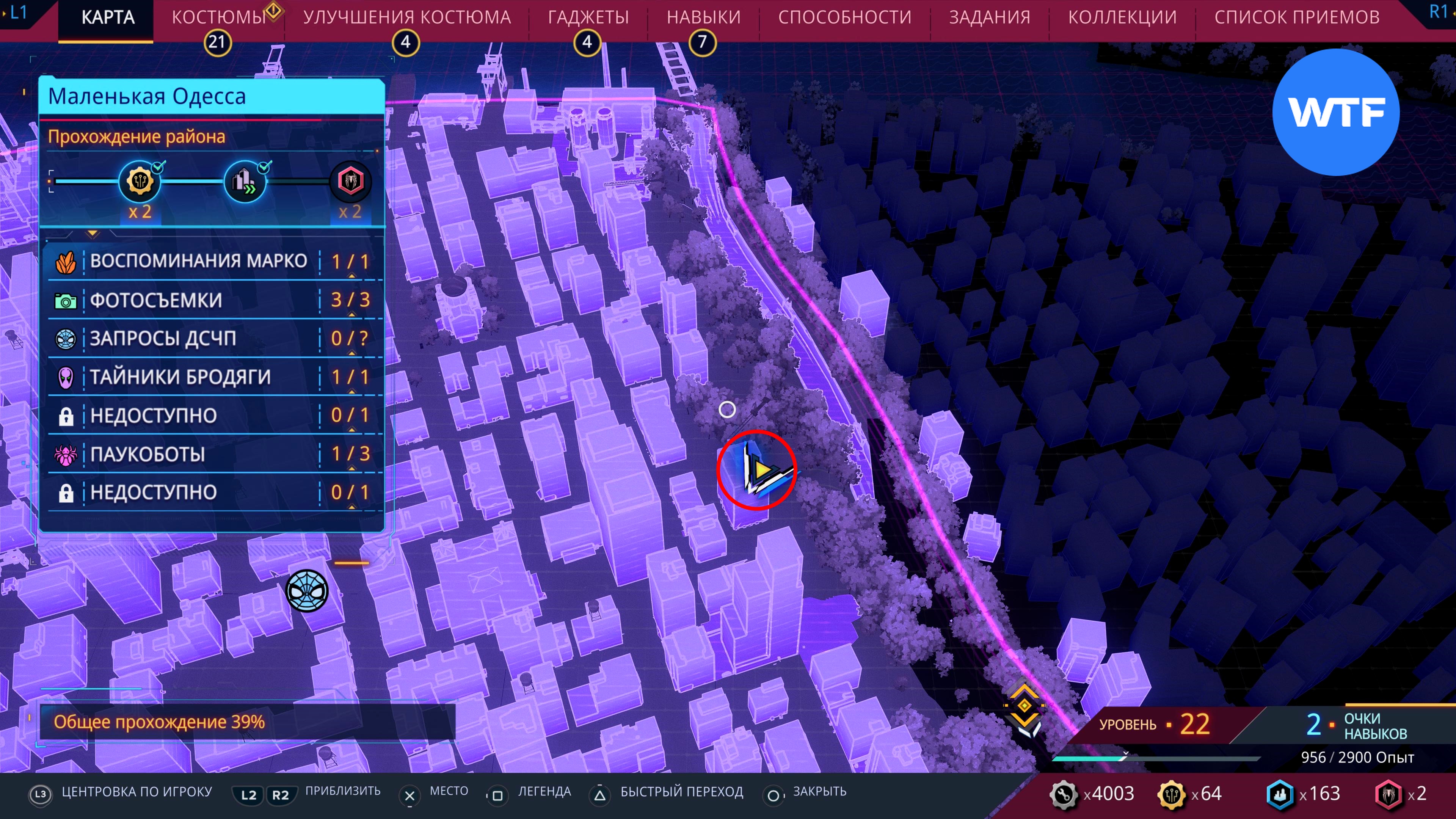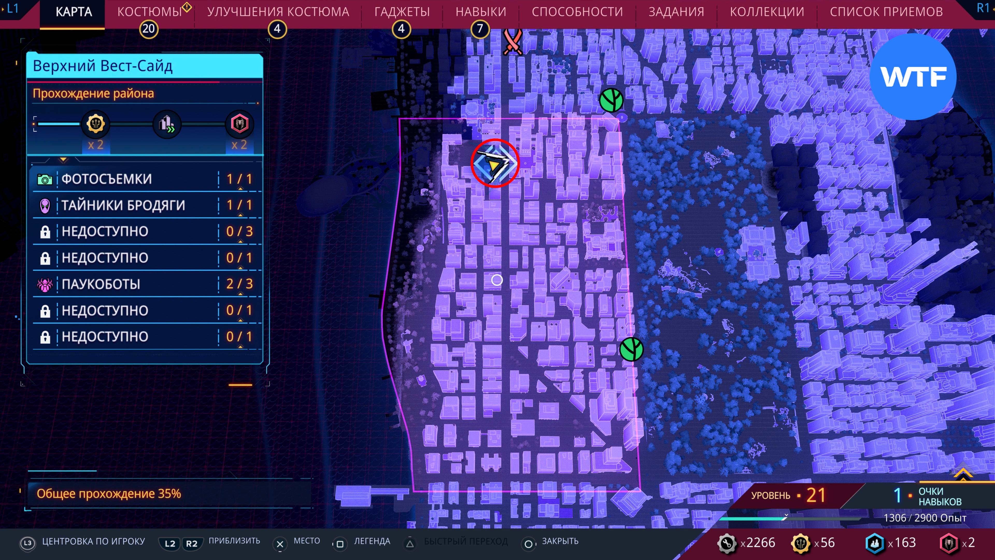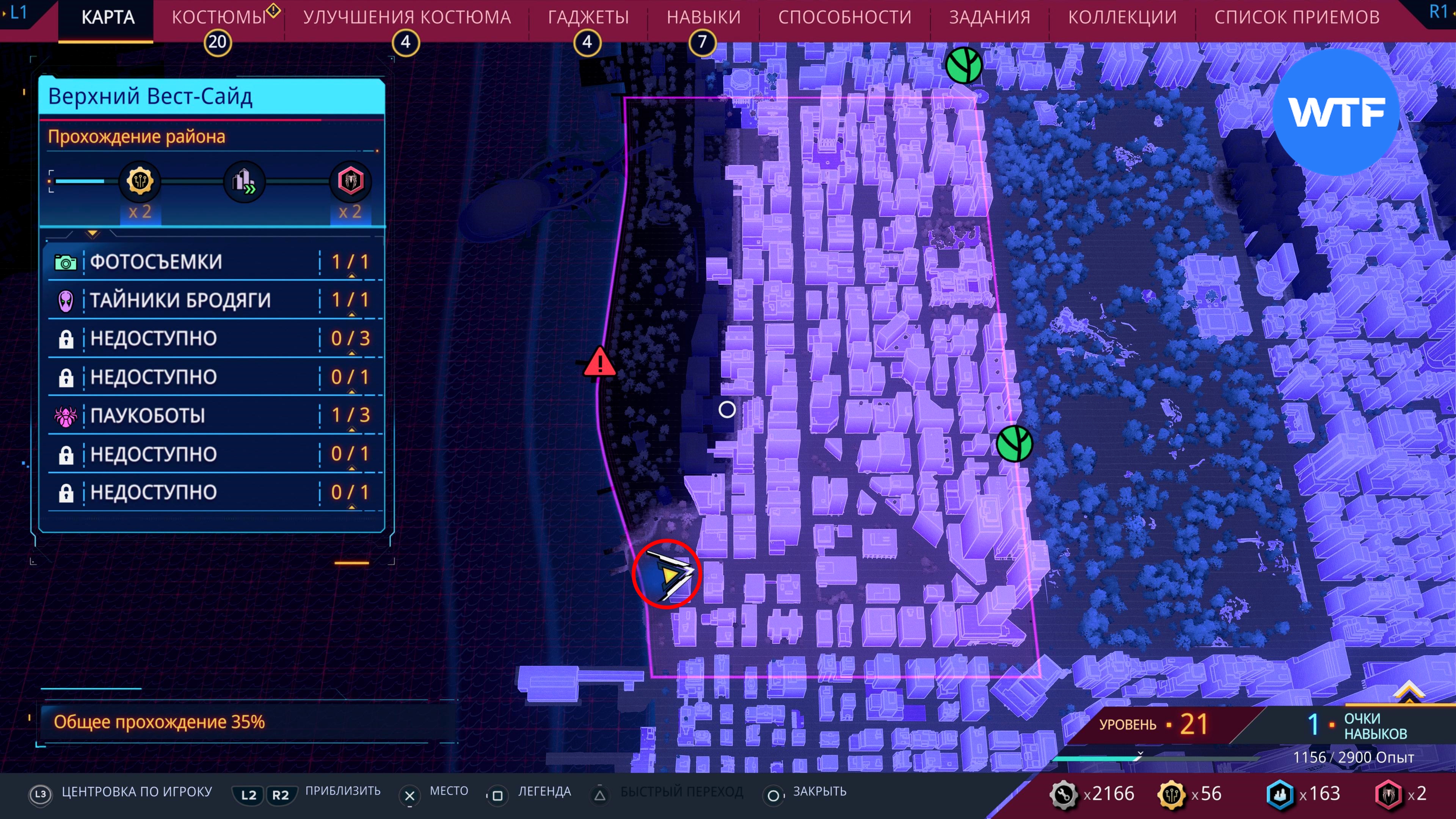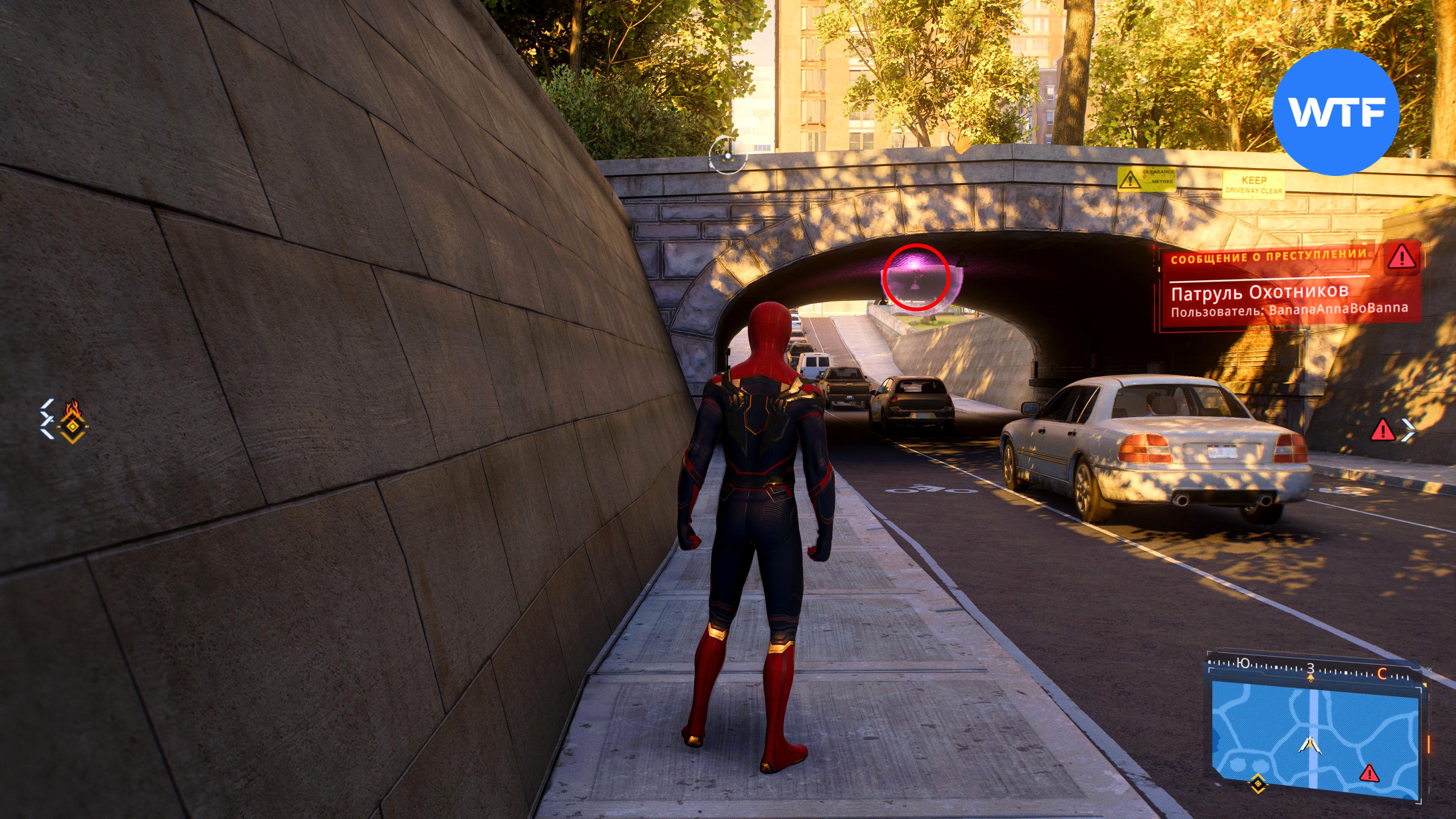 Еще один паукобот парит в северо-восточной части района Адская кухня. На скриншоте ниже метка стоит на здании с воздушным потоком, с которого к нему будет удобно спланировать. Примерное направление полета показано на втором скриншоте.