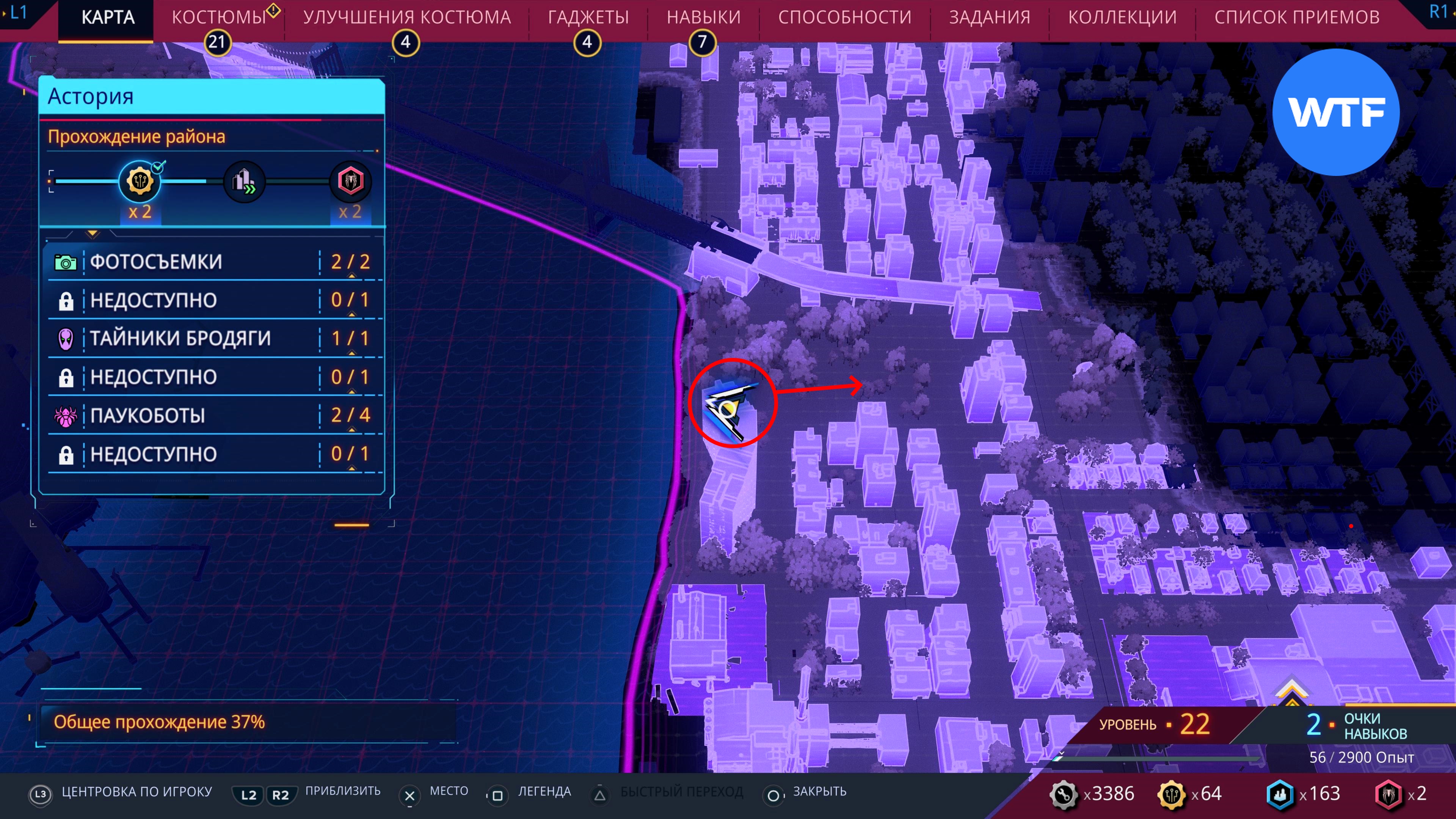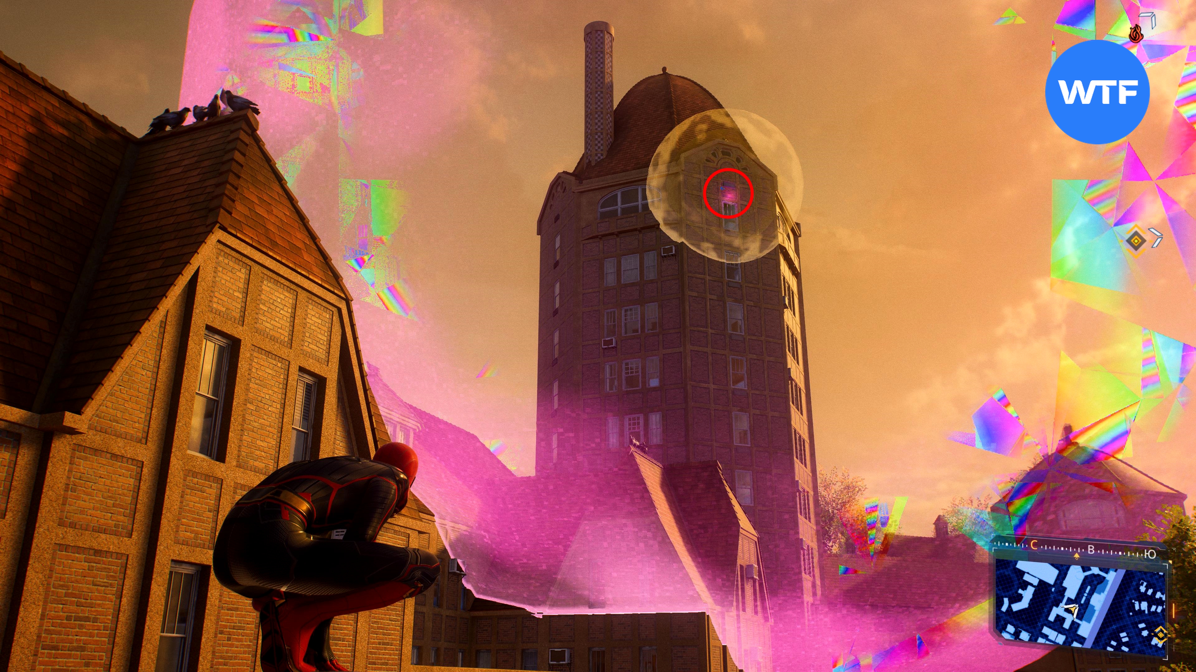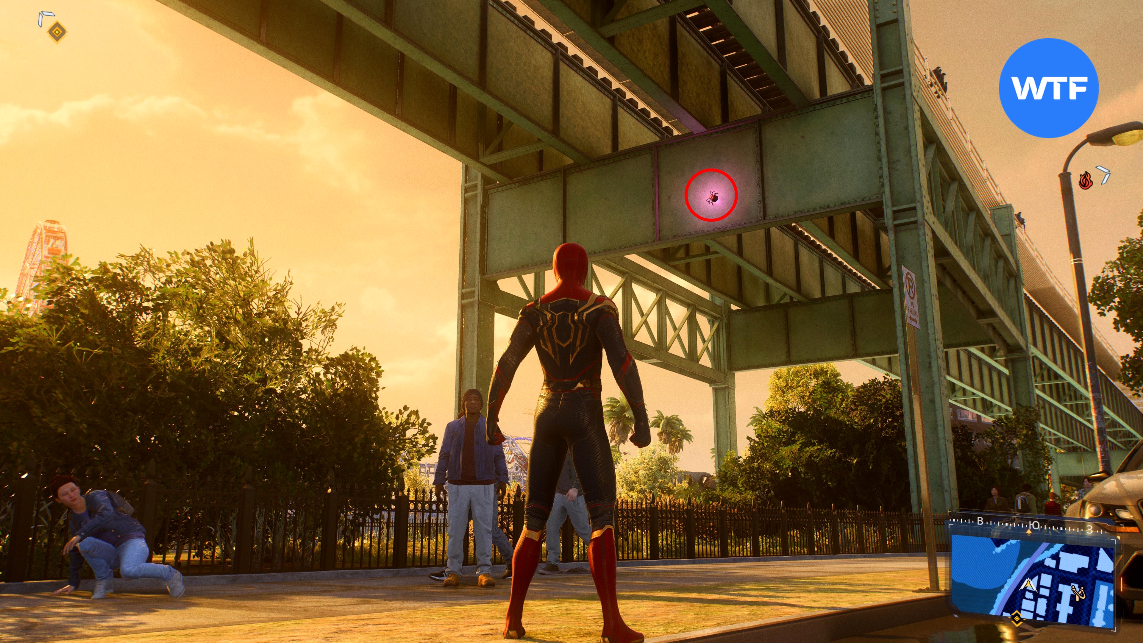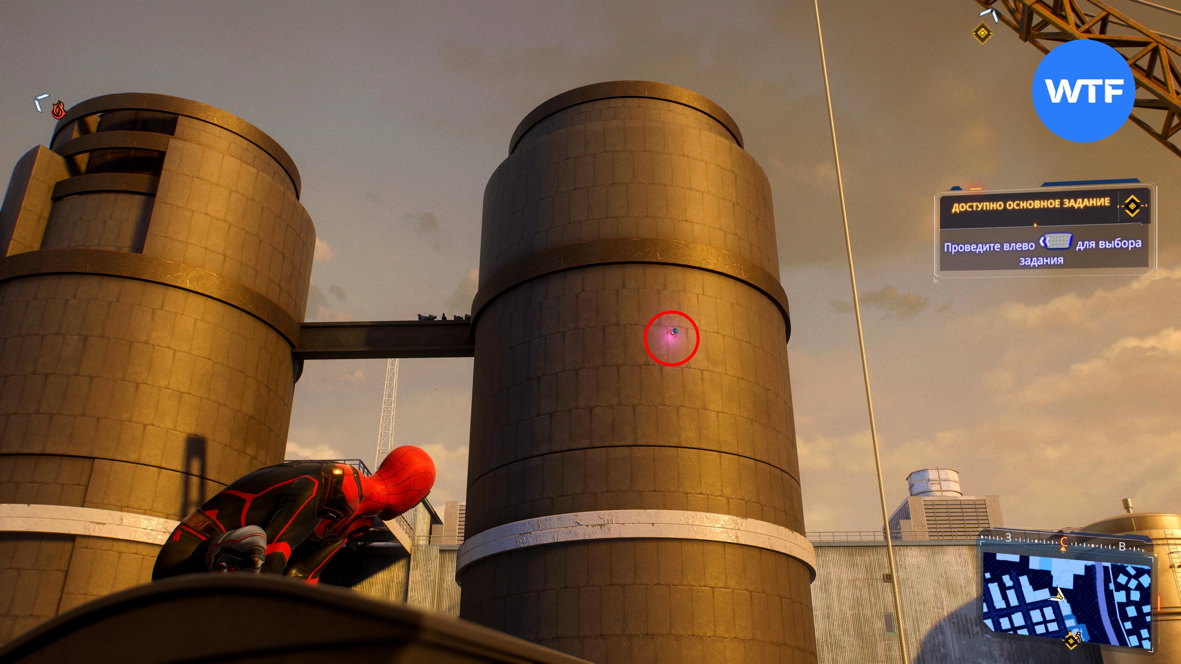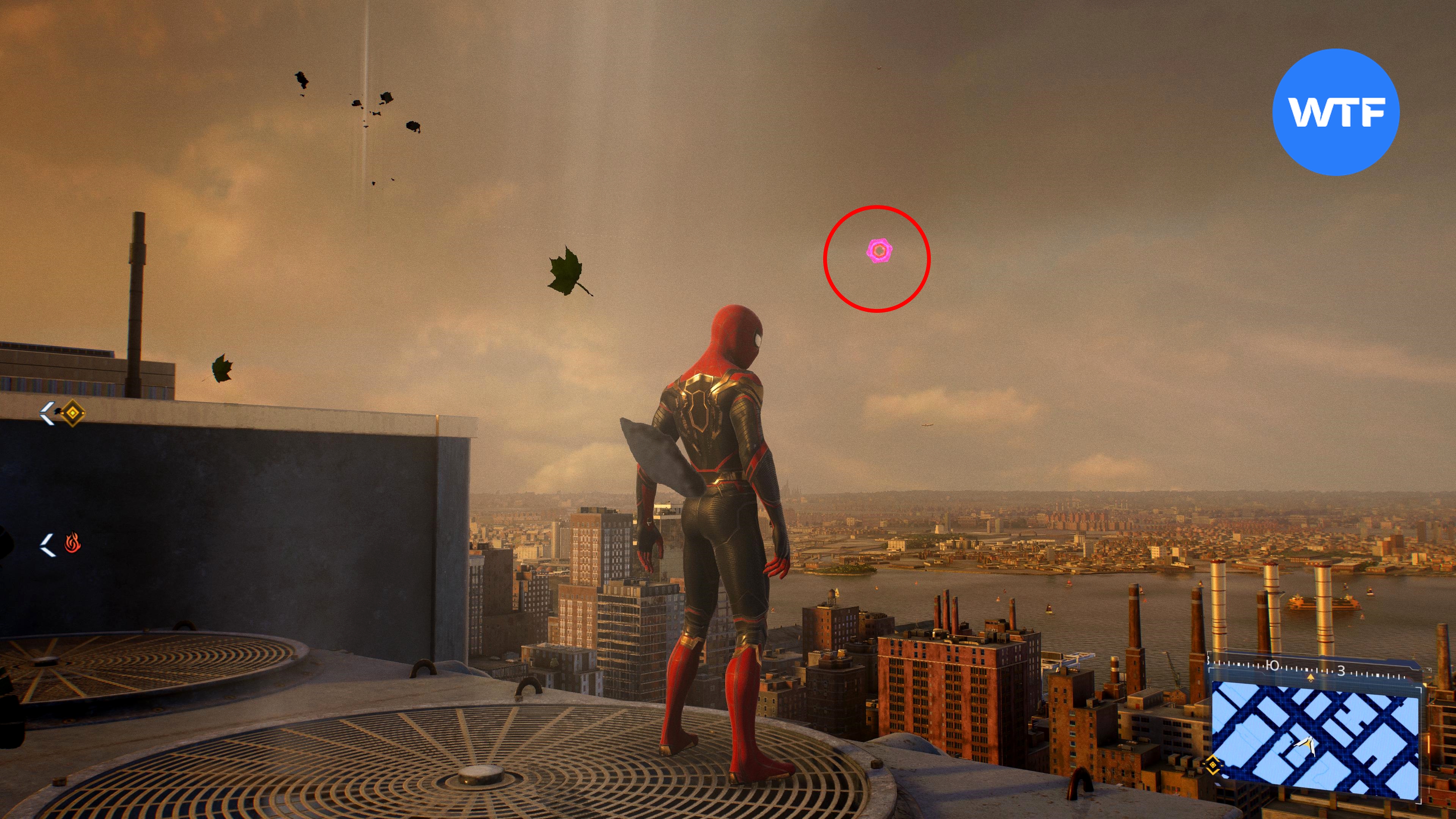 Теперь отправляйтесь в Чайна-таун и заберитесь на высокое здание, показанное на карте. Оттуда посмотрите в направлении моста, с этой точки вы должны заметить паукобота высоко над землей. Используйте крылья, чтобы до него добраться.