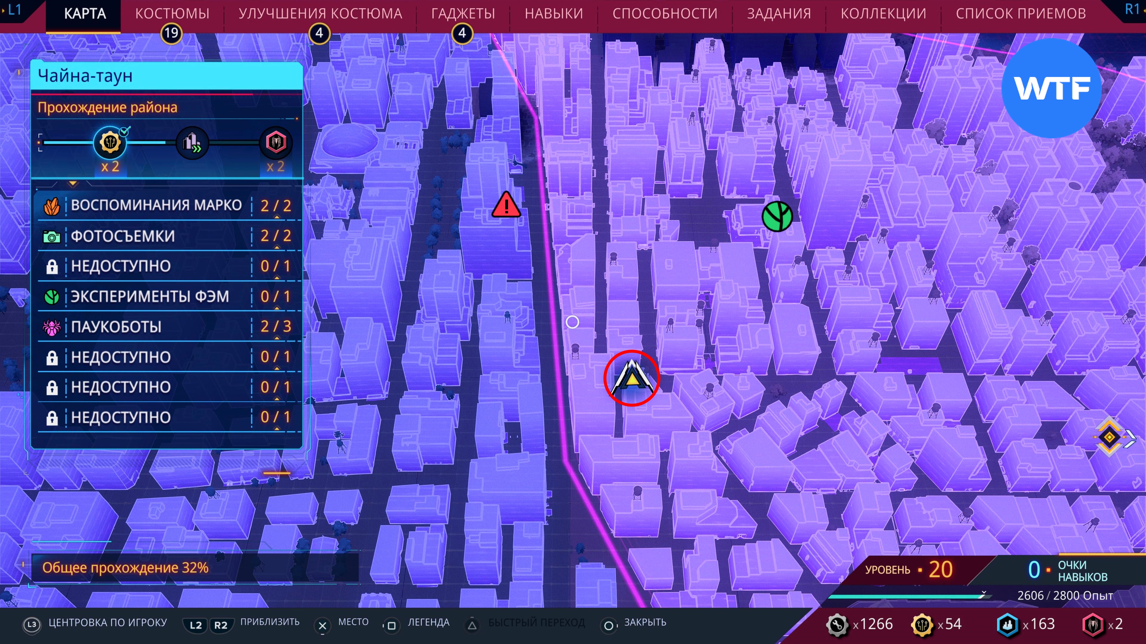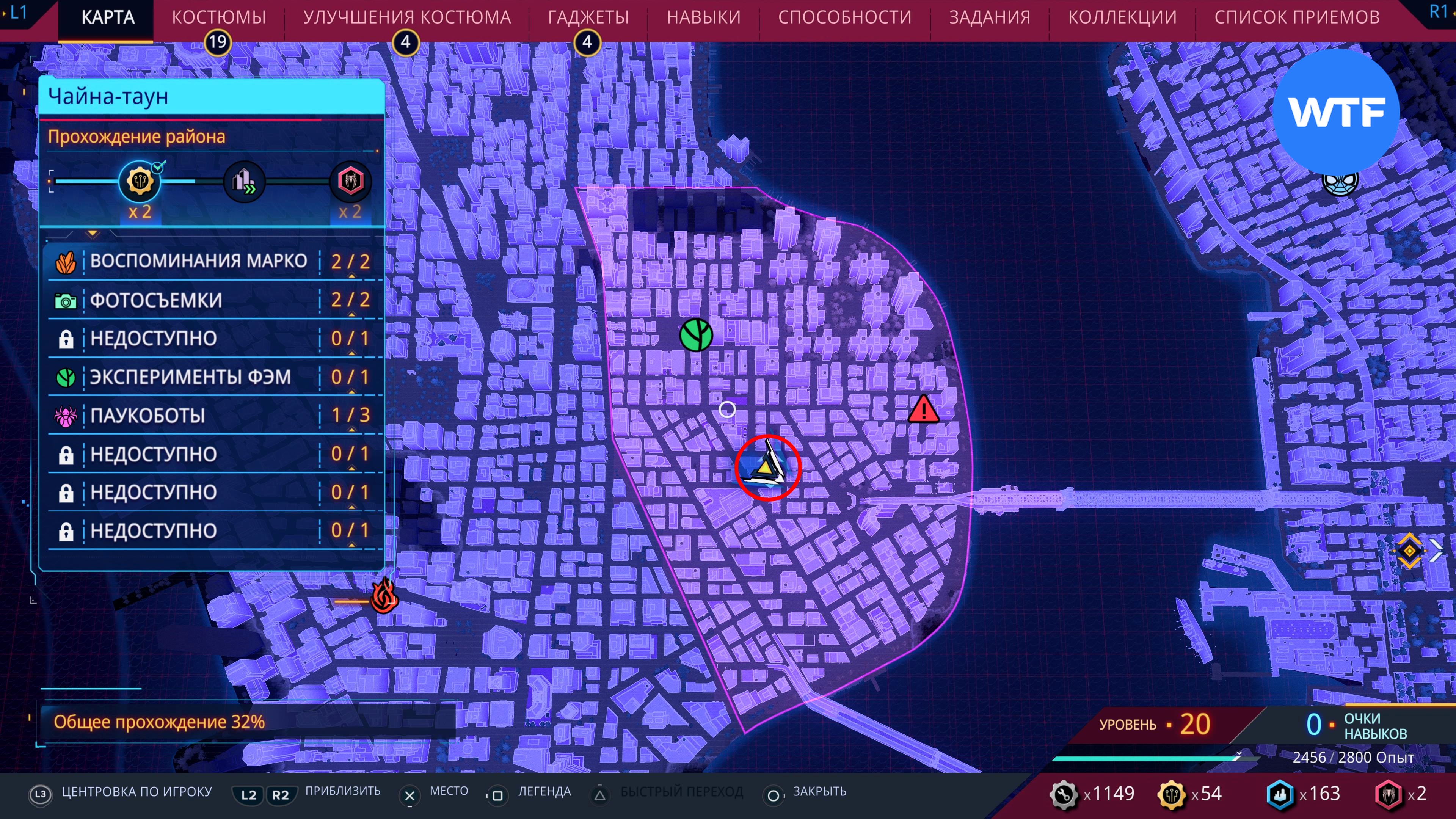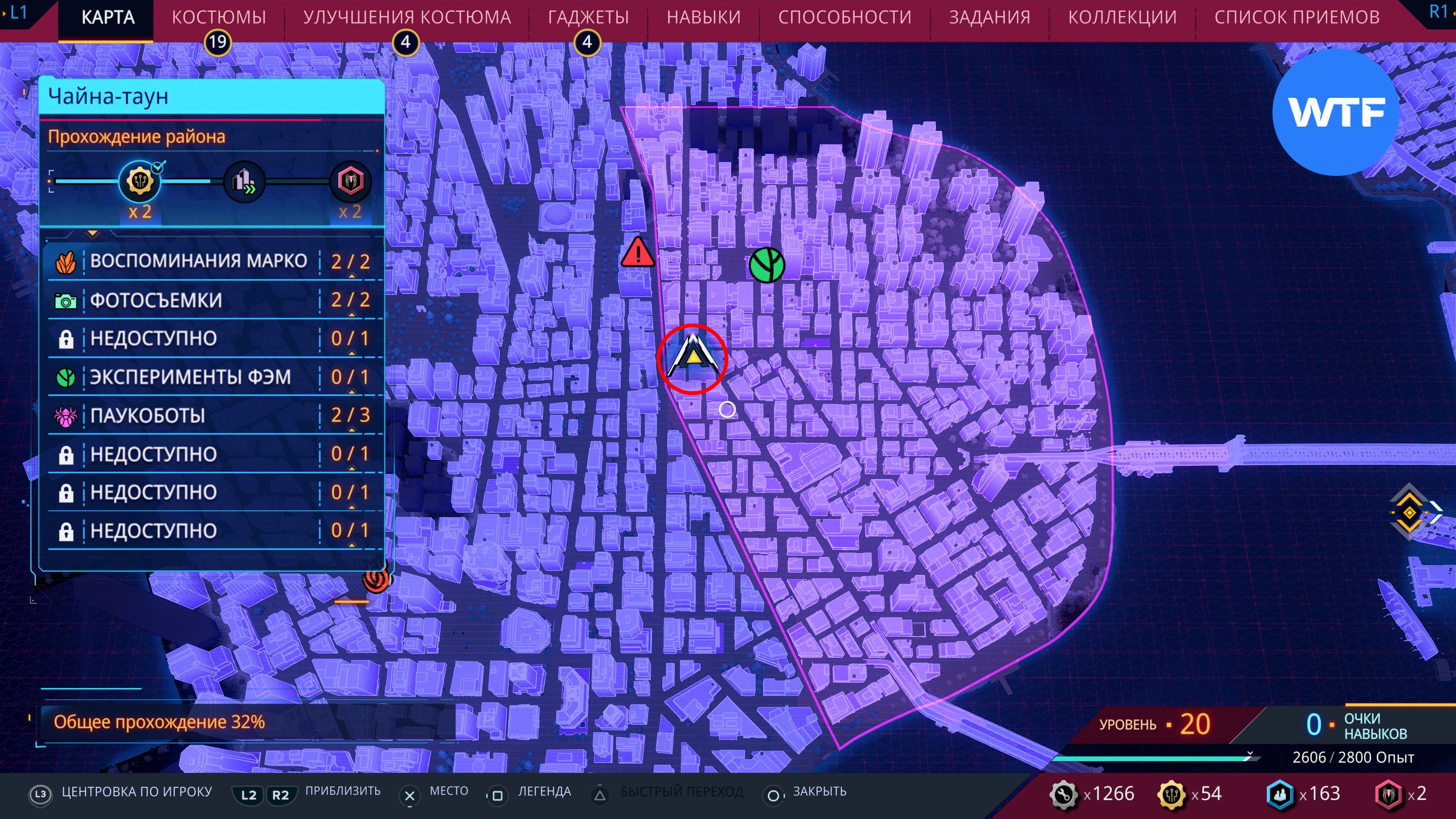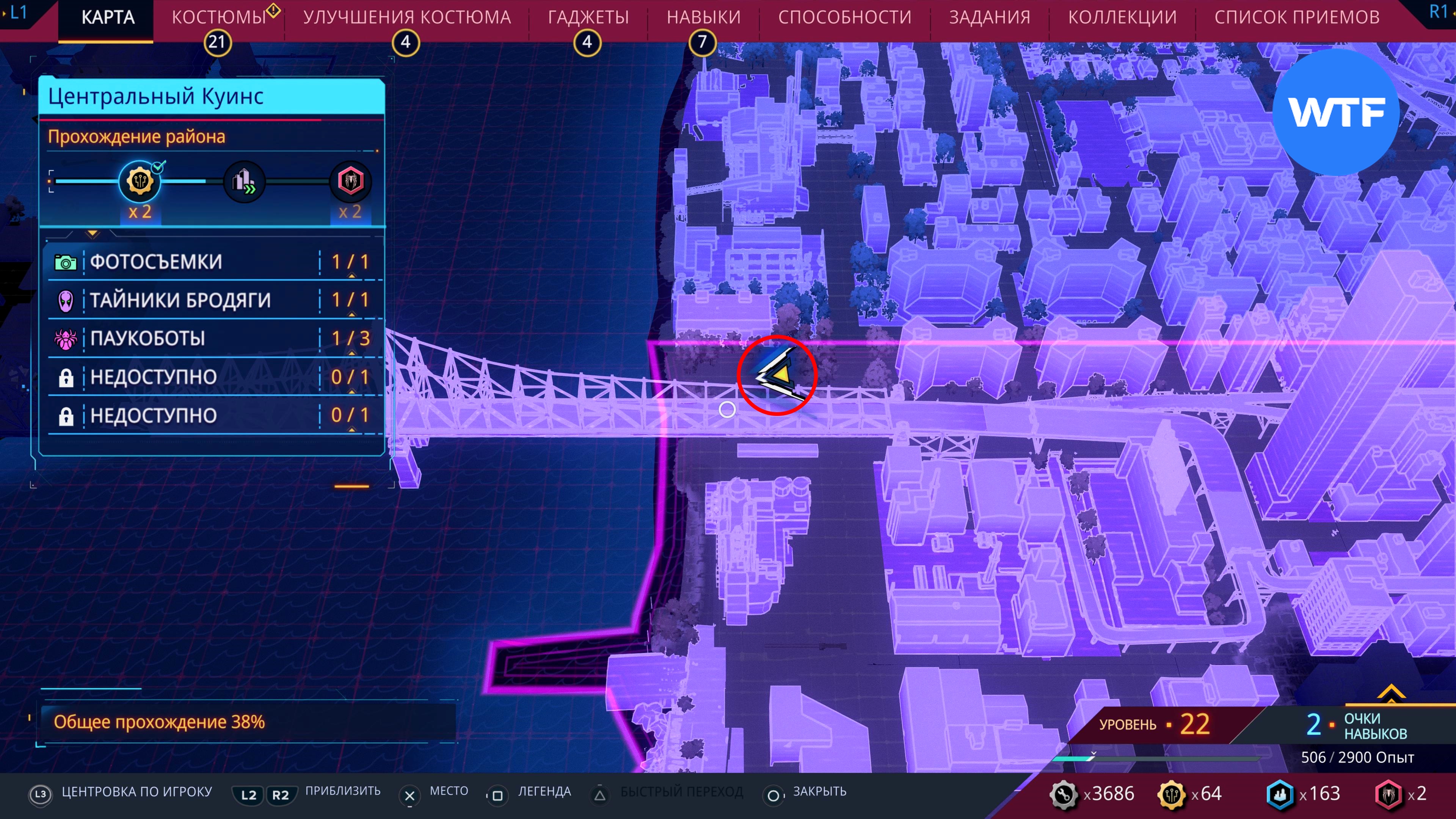 Теперь отправляйтесь в Чайна-таун и заберитесь на высокое здание, показанное на карте. Оттуда посмотрите в направлении моста, с этой точки вы должны заметить паукобота высоко над землей. Используйте крылья, чтобы до него добраться.