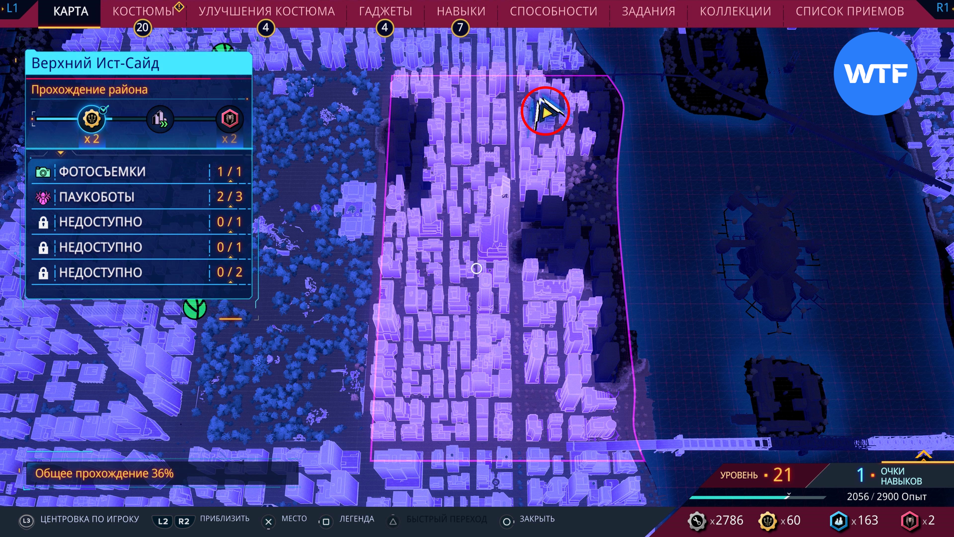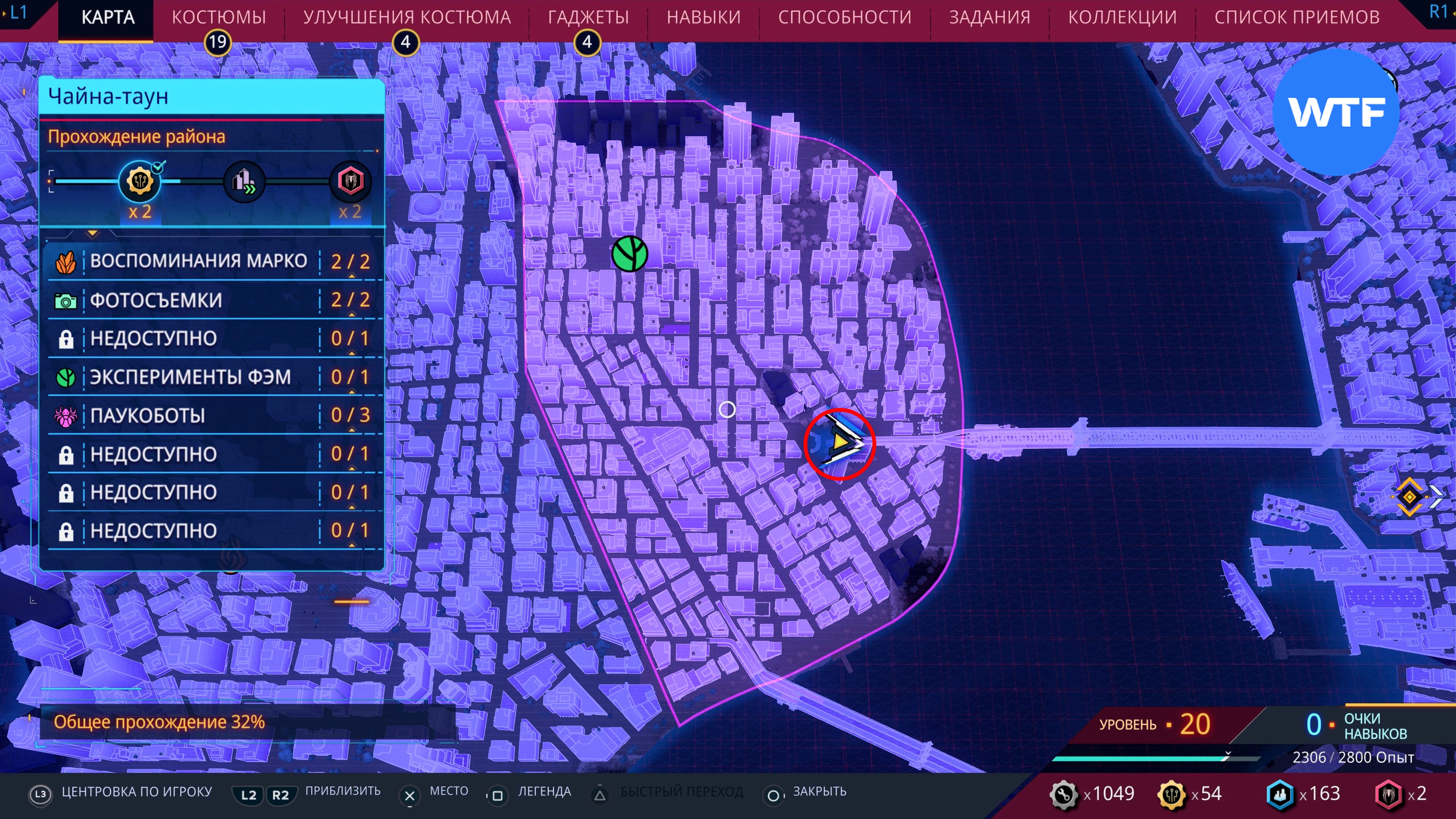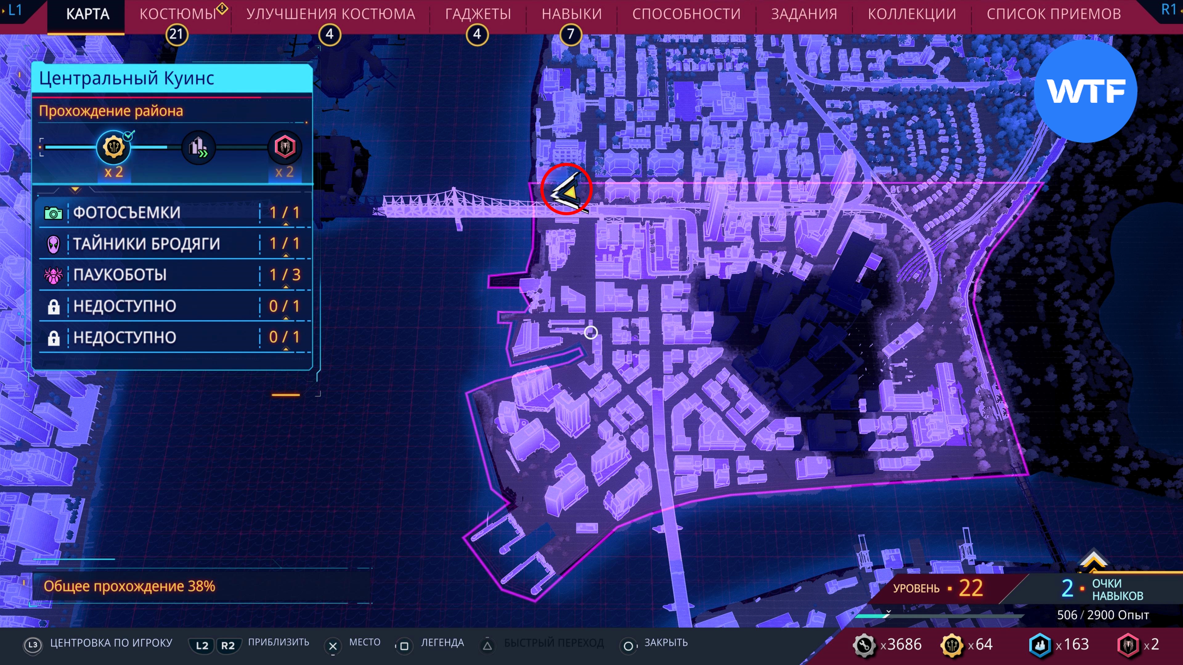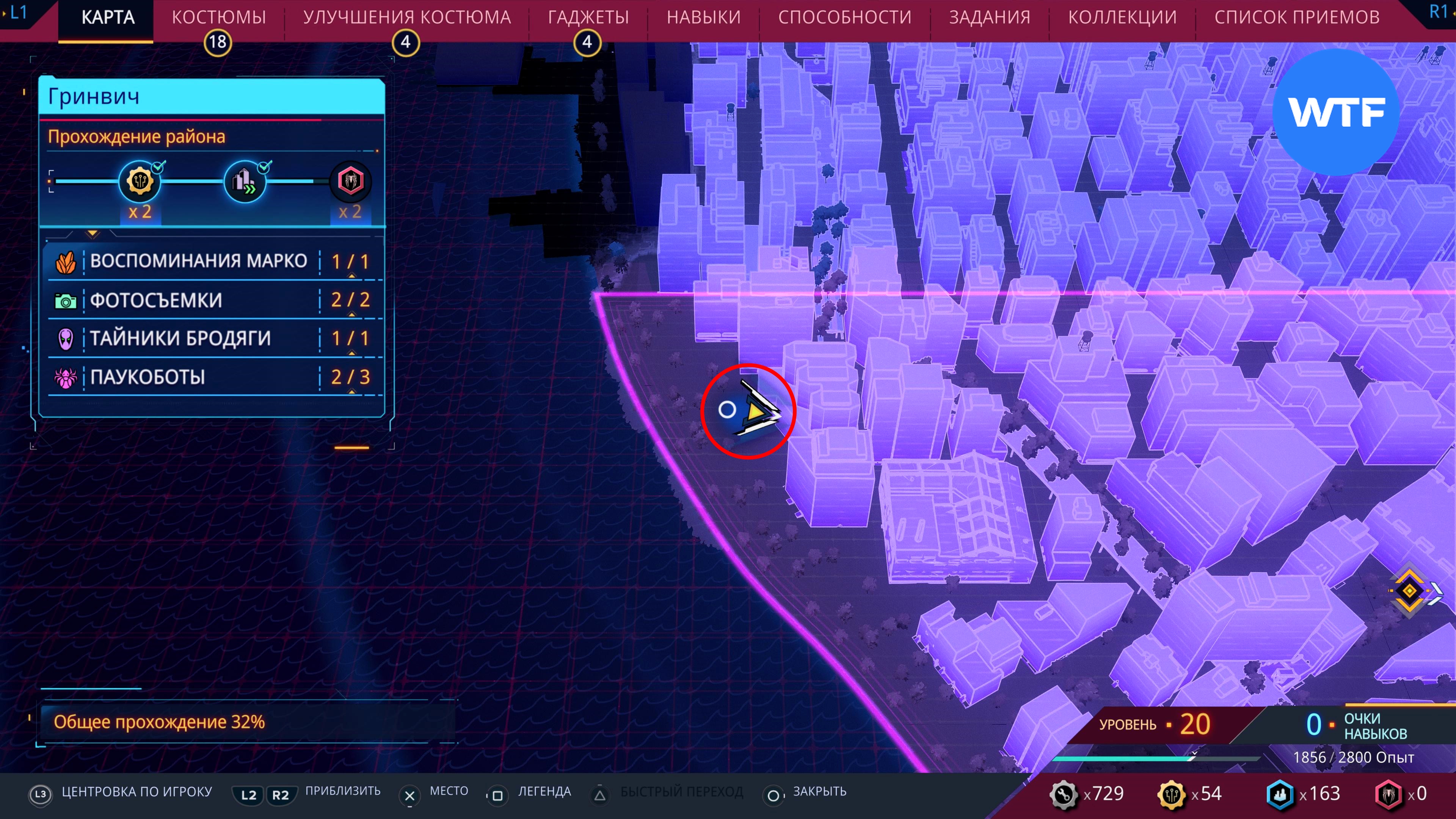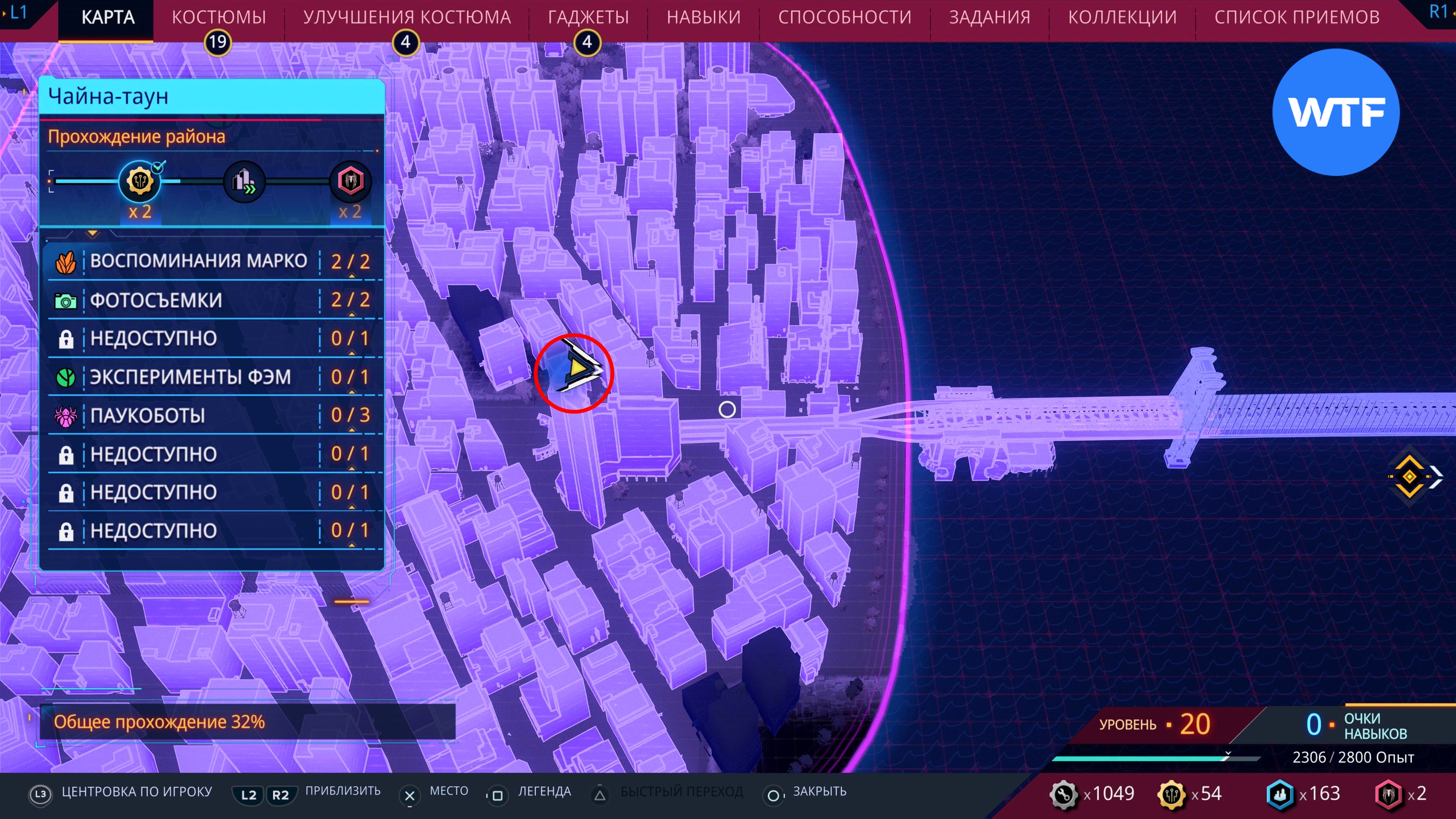 Теперь отправляйтесь в Чайна-таун и заберитесь на высокое здание, показанное на карте. Оттуда посмотрите в направлении моста, с этой точки вы должны заметить паукобота высоко над землей. Используйте крылья, чтобы до него добраться.
