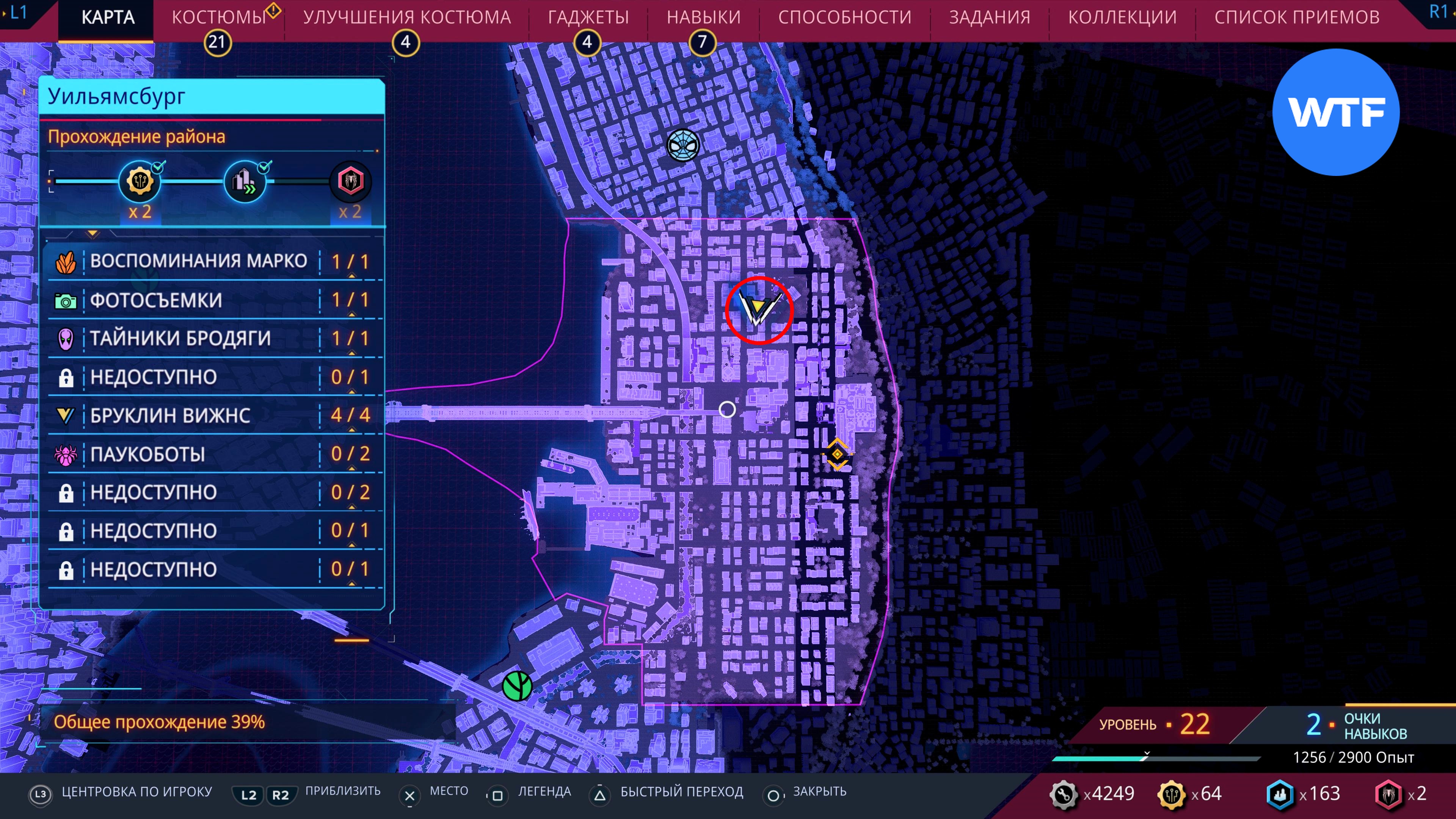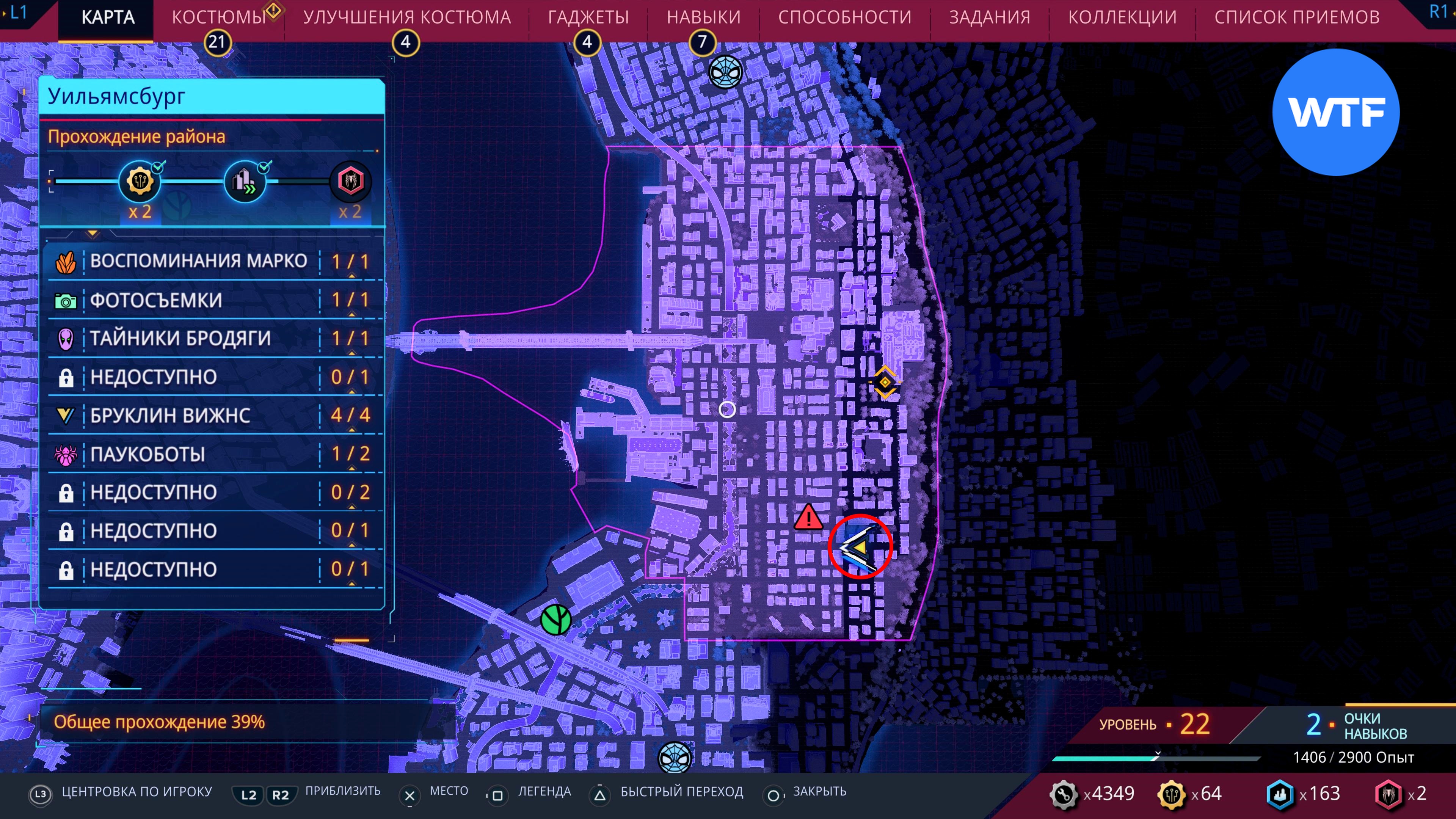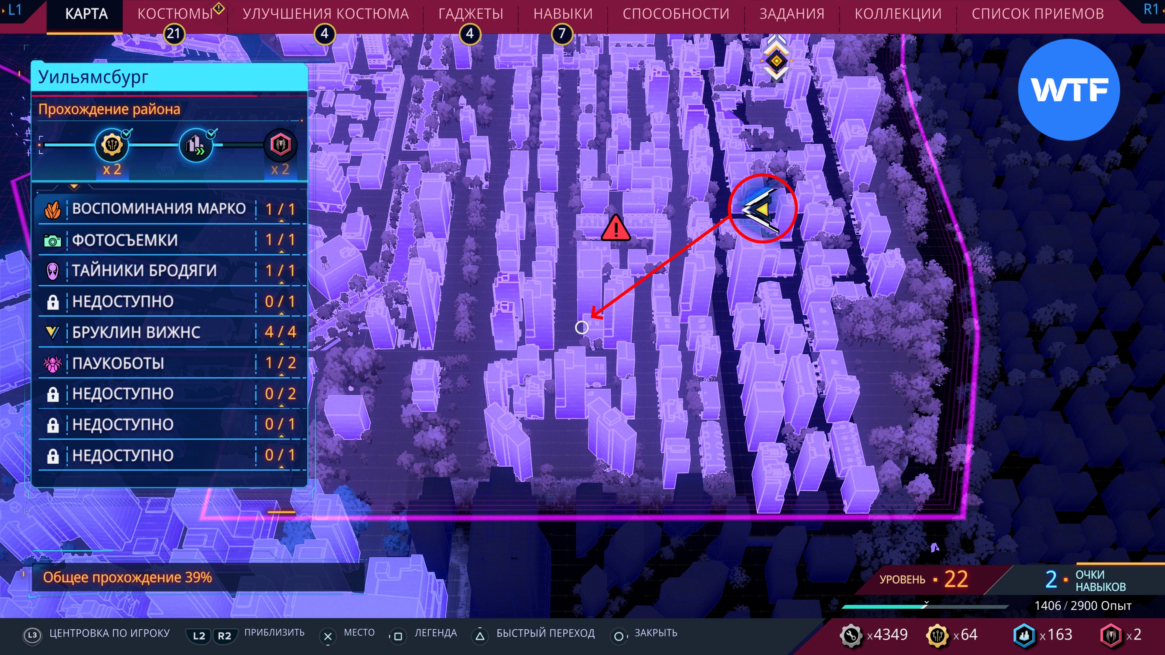 Еще один паукобот летает над юго-восточной частью района Уильямсбург. На карте ниже метка стоит прямо на здании, с которого к нему удобно планировать. Примерное направление полета показано на втором скриншоте.