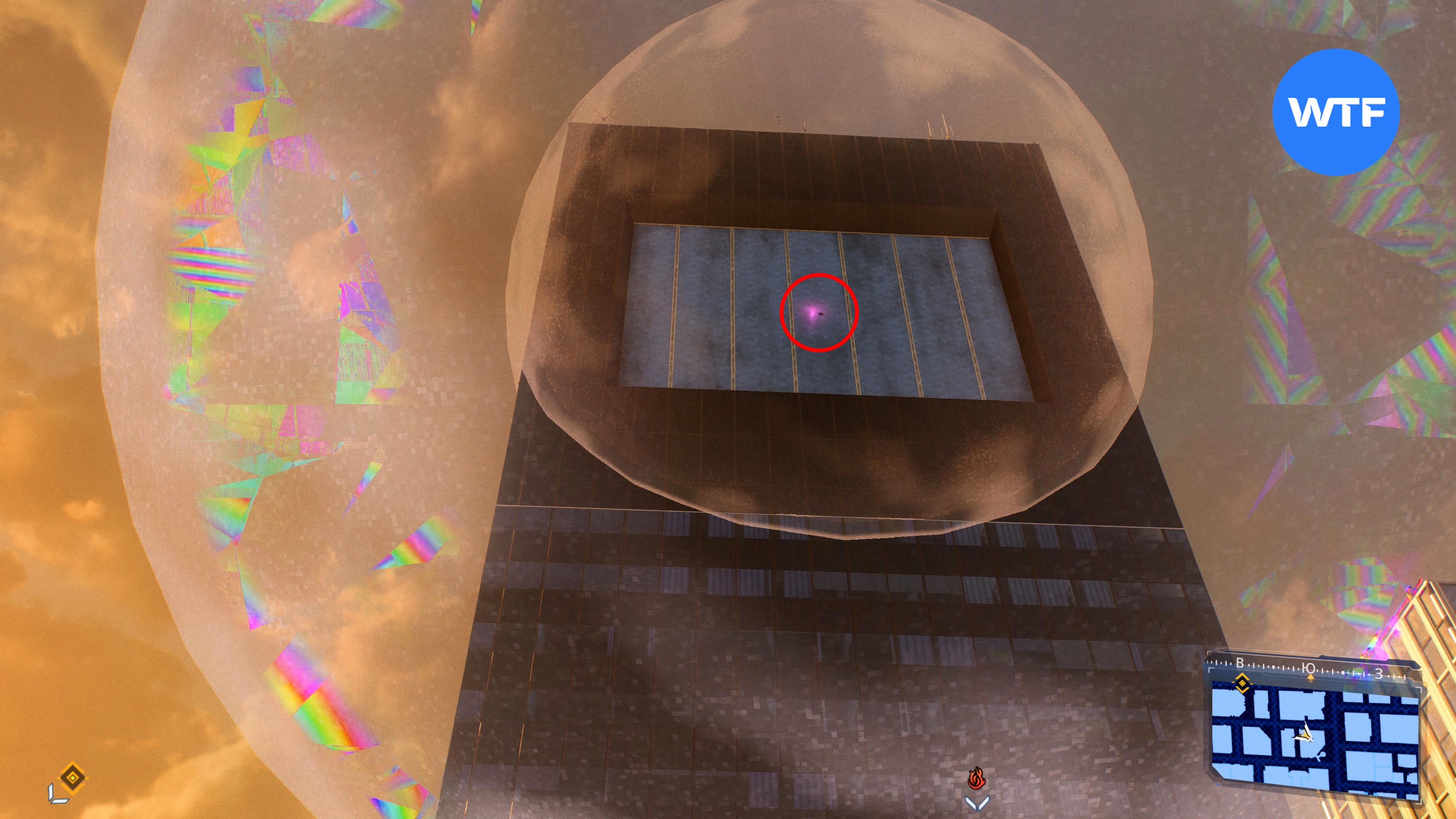Этот бот висит высоко в воздухе прямо в середине Финансового квартала. На скриншоте ниже метка стоит на здании с воздушным потоком, от которого к нему удобно спланировать. Для выбора направления ориентируйтесь на метку Пламени на карте ниже.