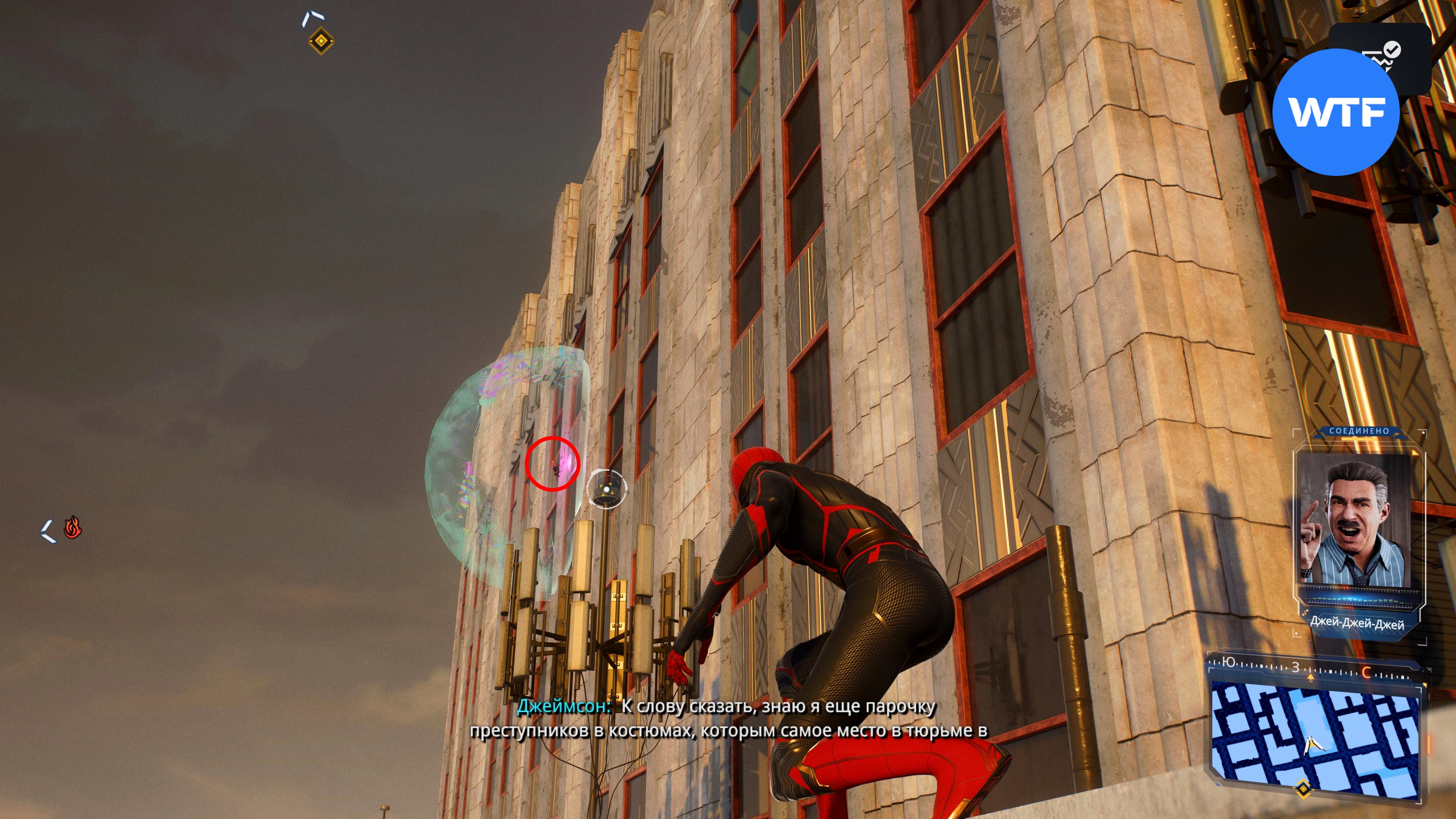 Отыщите серое бетонное здание со скриншотов ниже в восточной части Финансового квартала. Паук ползает по стене на южной стороне здания, ближе к крыше.