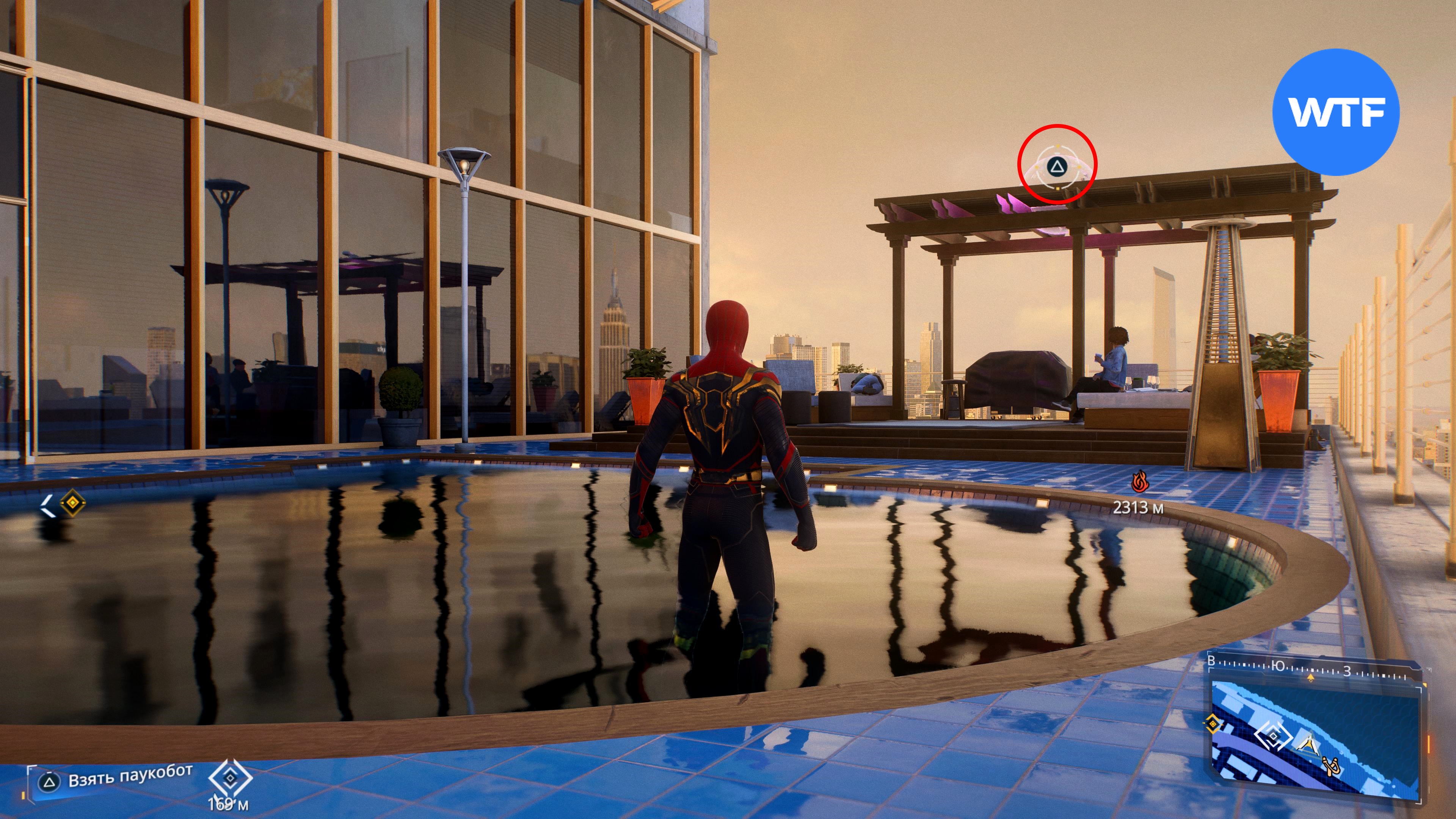 В юго-западной части Верхнего Ист-Сайда есть высокое стеклянное здание с бассейном на крыше. Паукобот ползает по стене прямо над ним.
