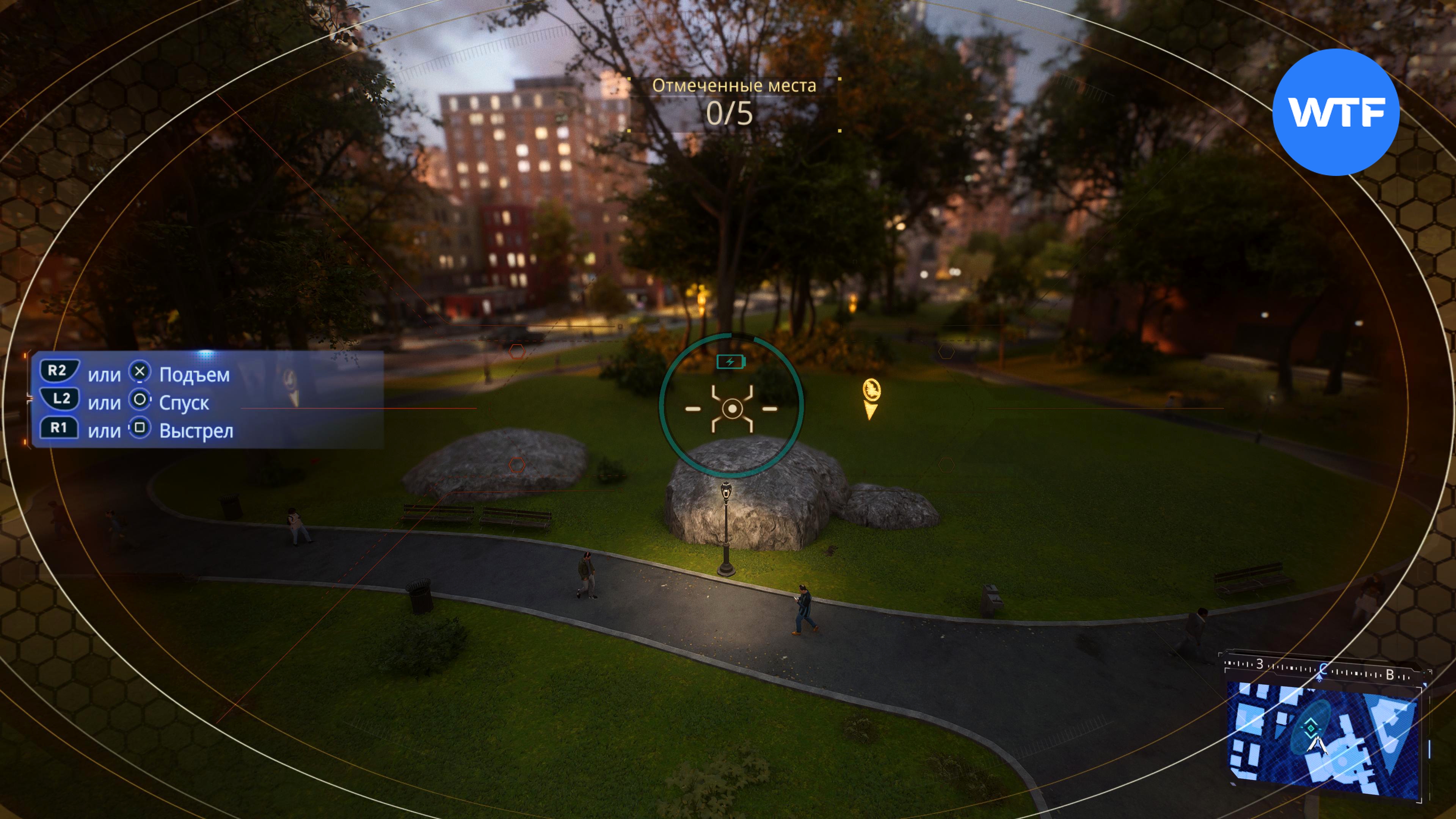 Первая часть аналогична тому, что вы делали во время некоторых сюжетных миссий: нужно сбить цели, отмеченные фиолетовой подсветкой. В парке таких целей значительно больше, чем нужно — просто смотрите на миникарту, нужные цели отмечены там красными точками.